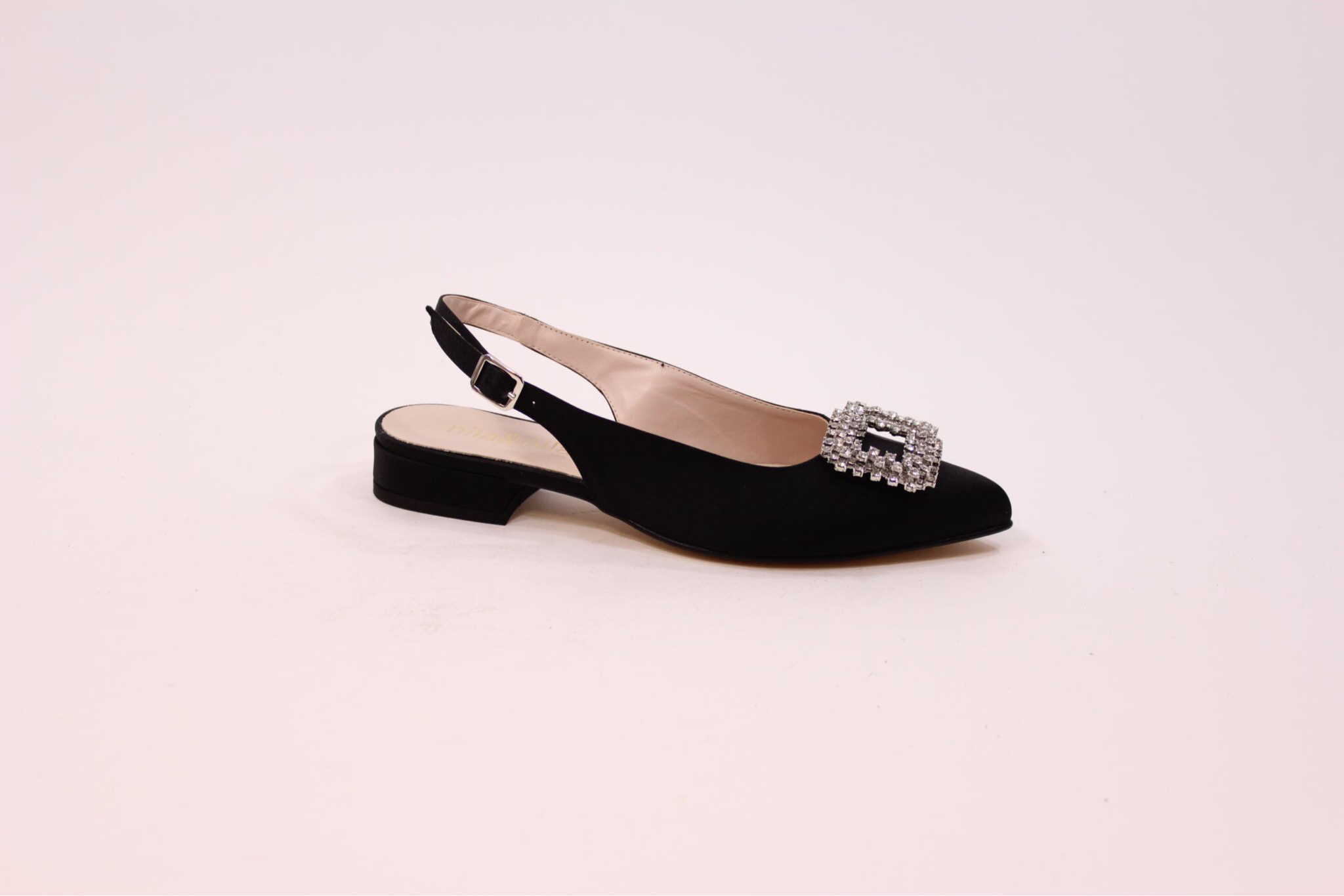Тканевые босоножки черного цвета, каблук 2.5см, аксессуар со стразами.