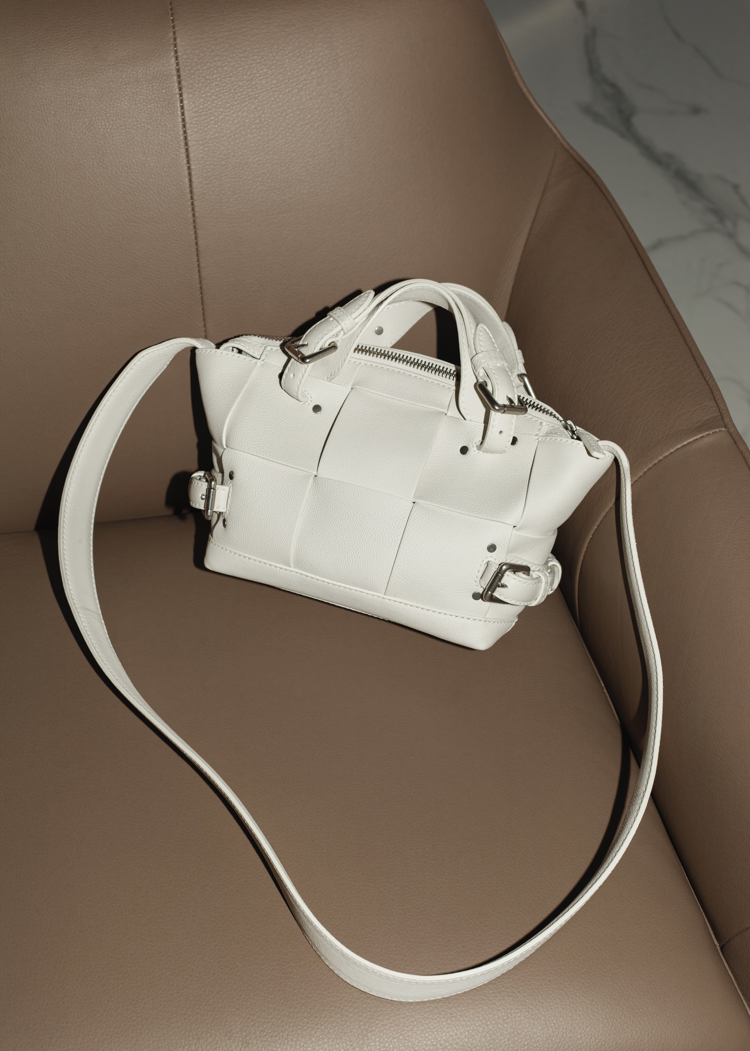 Благодаря универсальному белому цвету сумка Tool гармонично впишется как в яркий, так и в лаконичной образ, но при этом она не выглядит просто. Мастера бренда выполнили аксессуар из широких полос мягкой крупнозернистой кожи в старинной технике плетения intrecciato.
