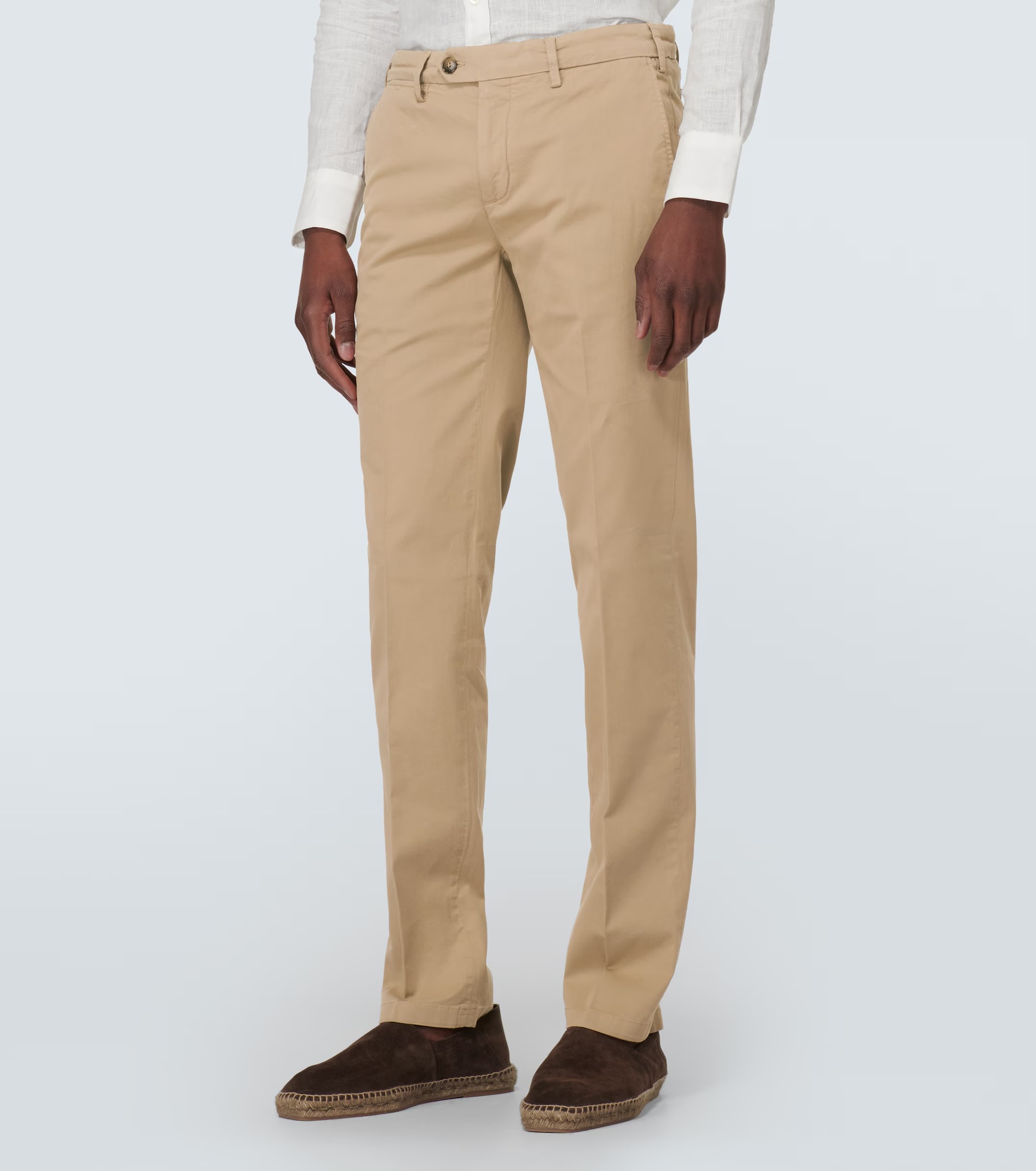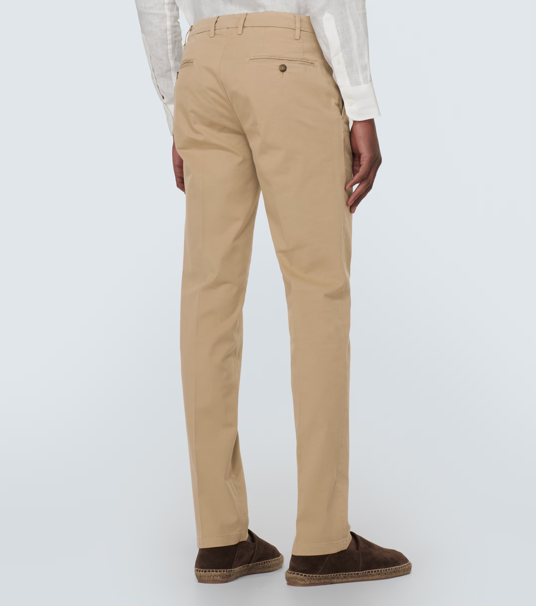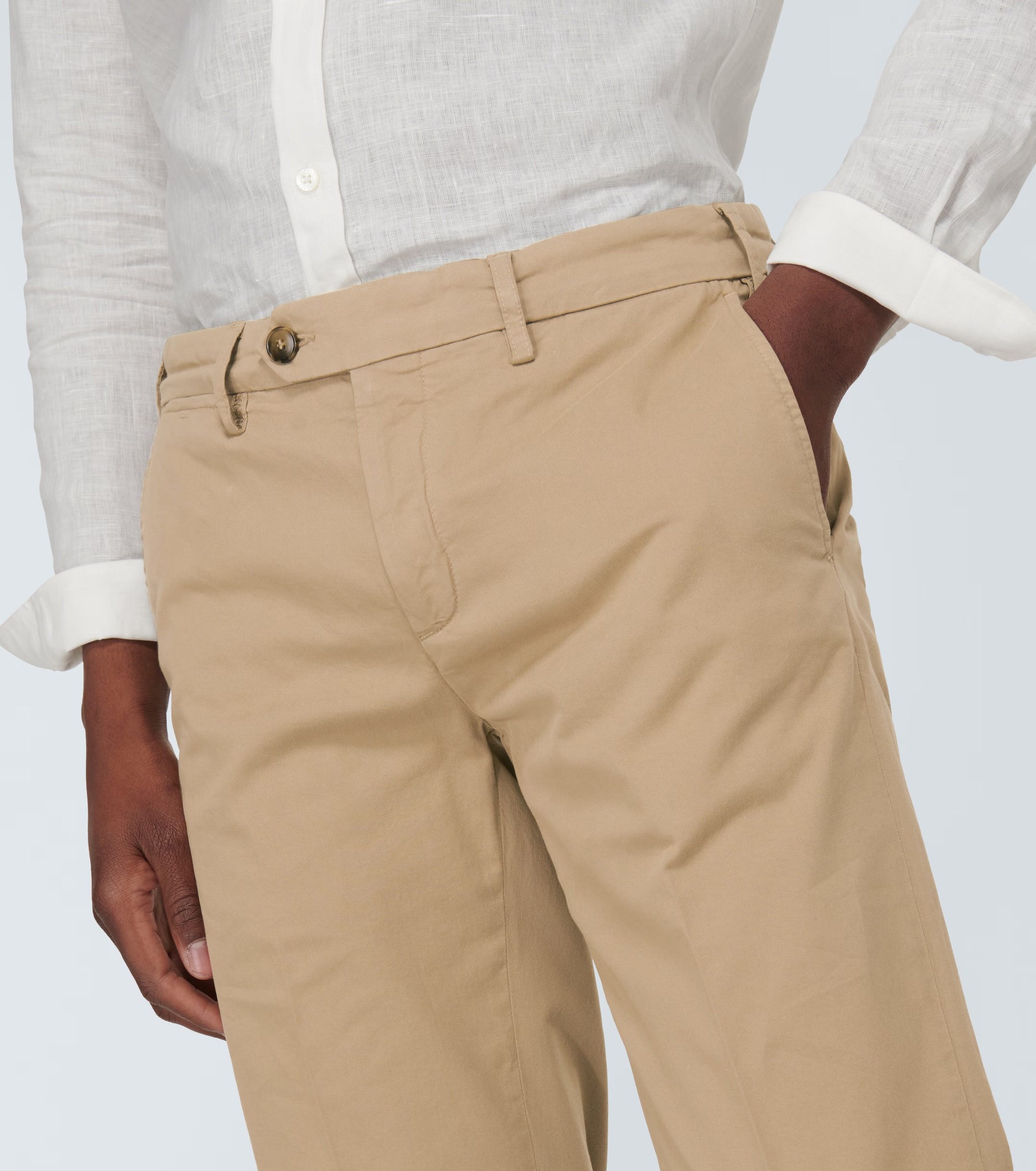 Брюки чинос из прессованного хлопка от CANALI. Бежевый цвет, смесь эластичного хлопка, петли для ремня, застежка на пуговицу и молнию спереди, зауженный крой, два прорезных кармана по бокам и два прорезных кармана сзади.