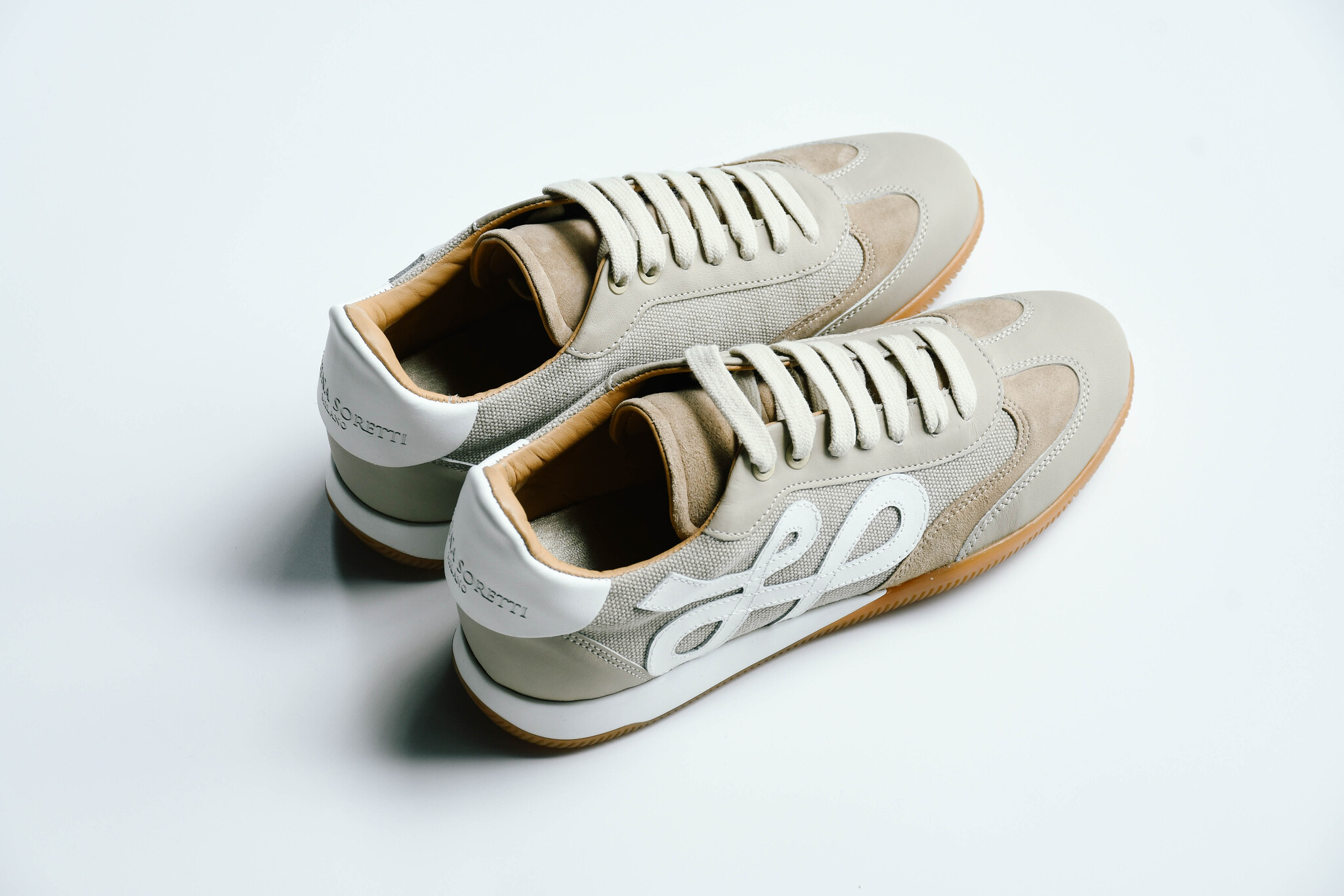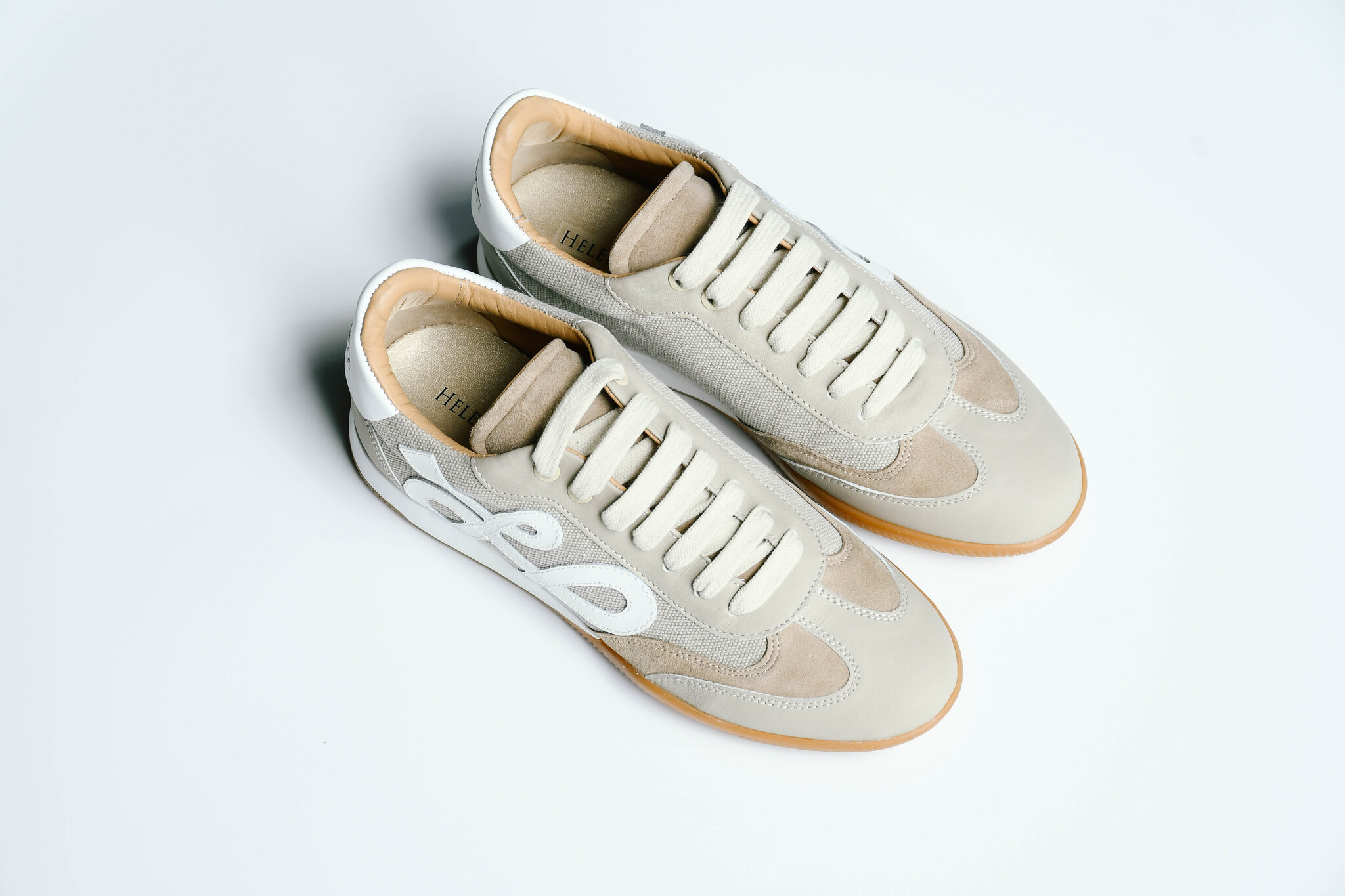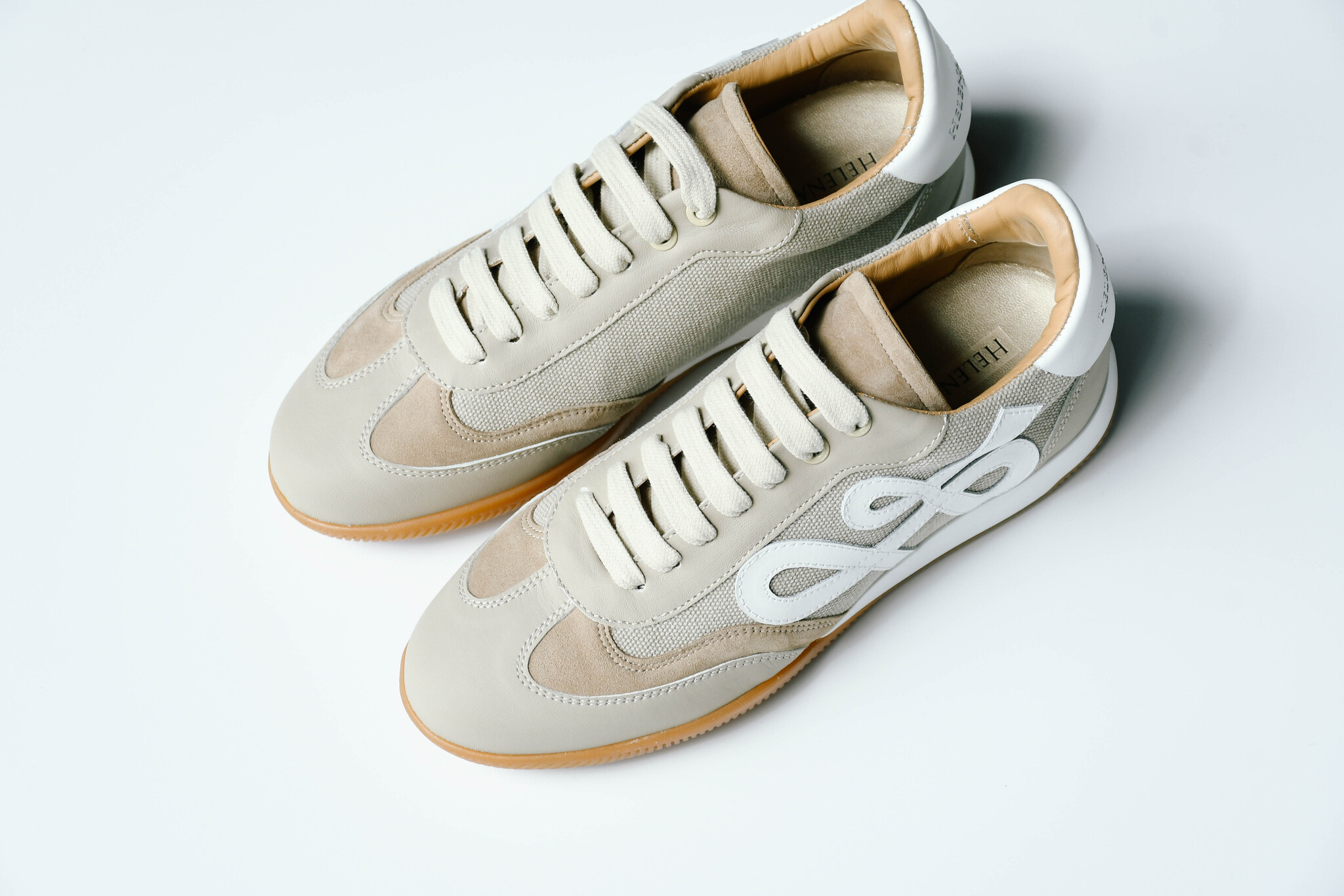 Кроссовки женские Helena Soretti Google бежевые с наружной текстильной вставкой, украшенной вензелем из кожаных ремешков в тон воротника задней части кроссовок и подошвы. На воротнике расположено название фирмы производителя. Основание полиуретановой подошвы имеет коричневый цвет. Фигурная часть носка с пяткой, язычком и местом шнуровки обуви выполнены из более темной натуральной кожи.