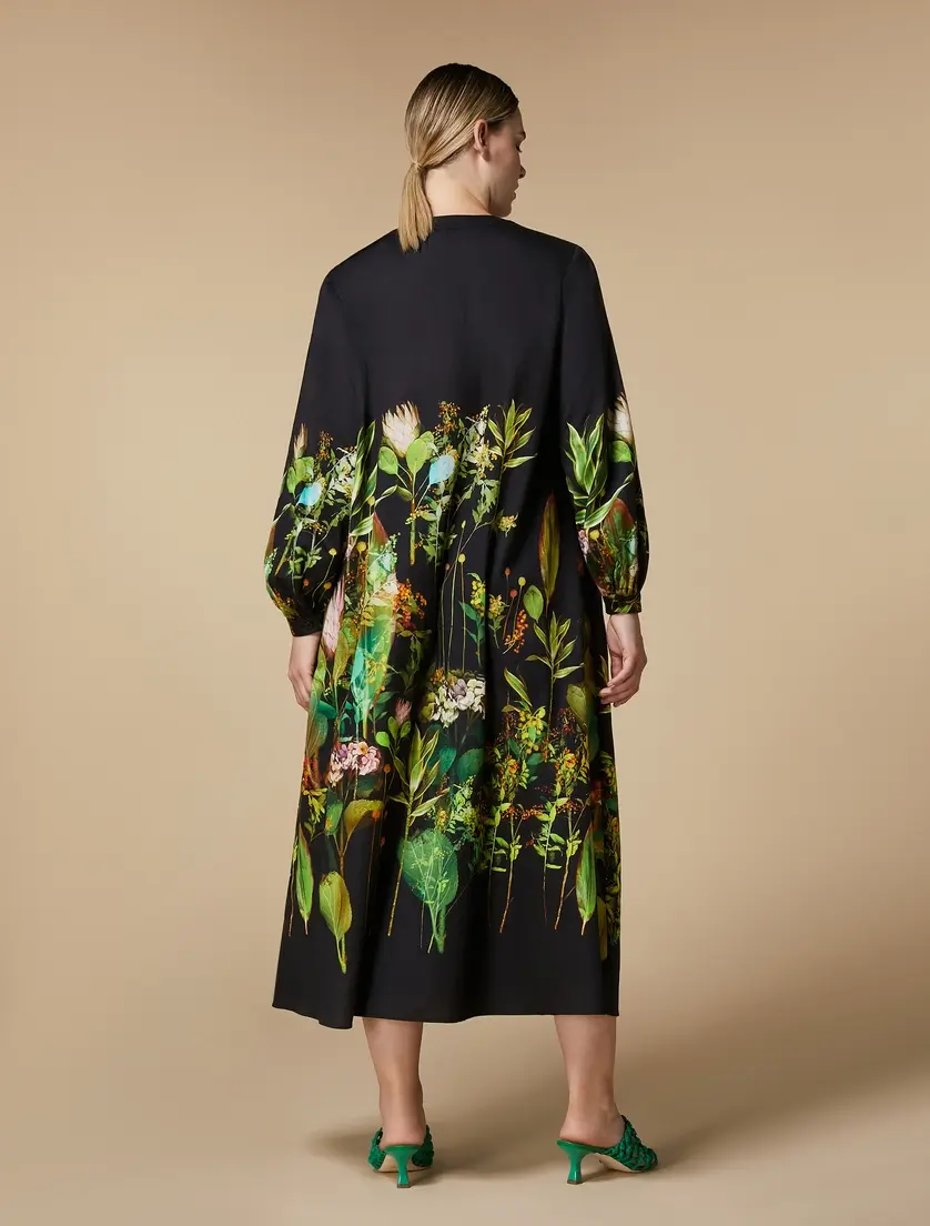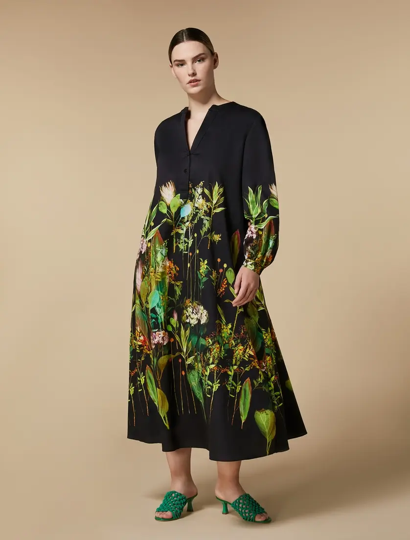 Платье из чистого хлопкового атласа с цветочным принтом, с дизайном, разработанным специально для модели. Корейский воротник с V-образным открытием, длинные рукава с манжетой, карманы на бедрах. С слегка расклешенной линией, он идеально подходит в любых обстоятельствах с высокими каблуками, сандалиями-платформерами или кроссовками. Платье является частью основной коллекции Марины Ринальди.