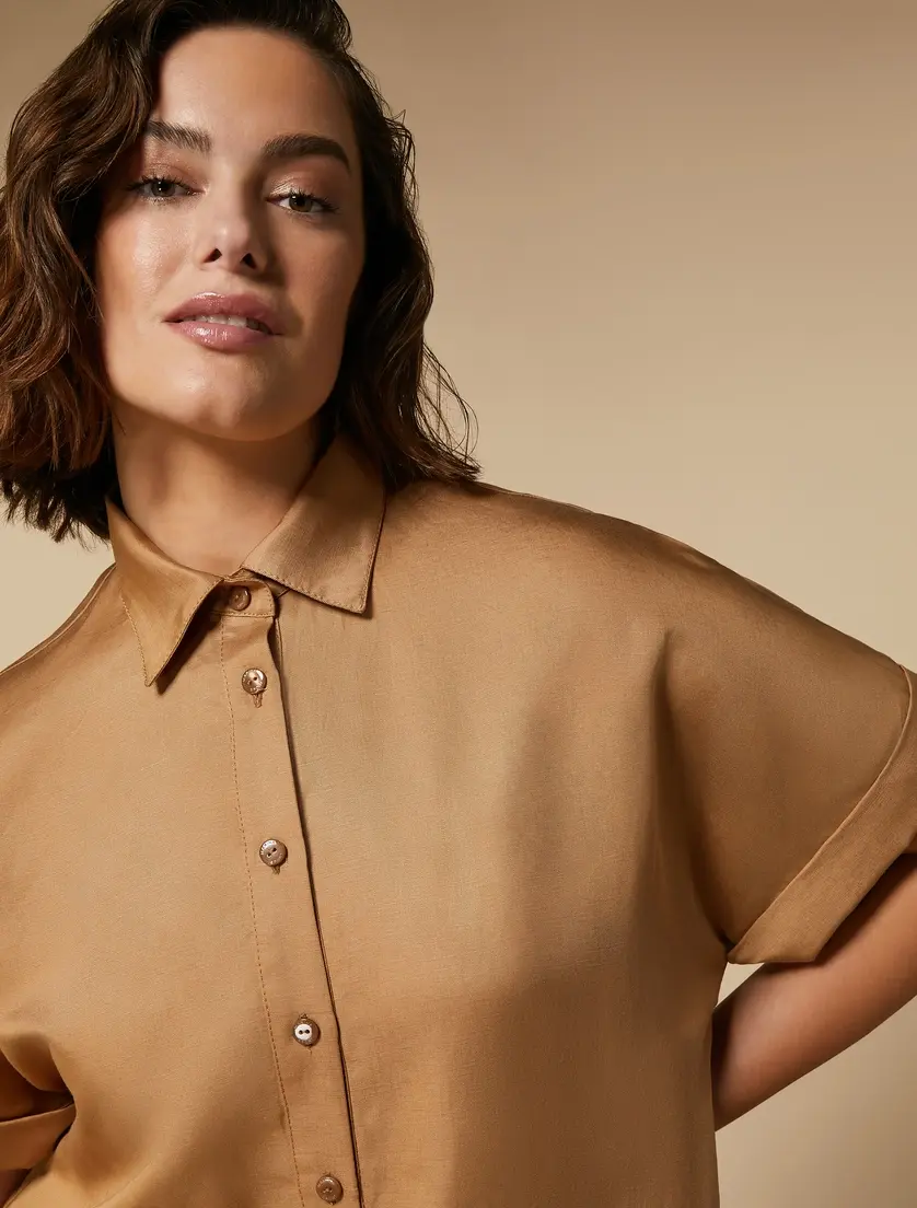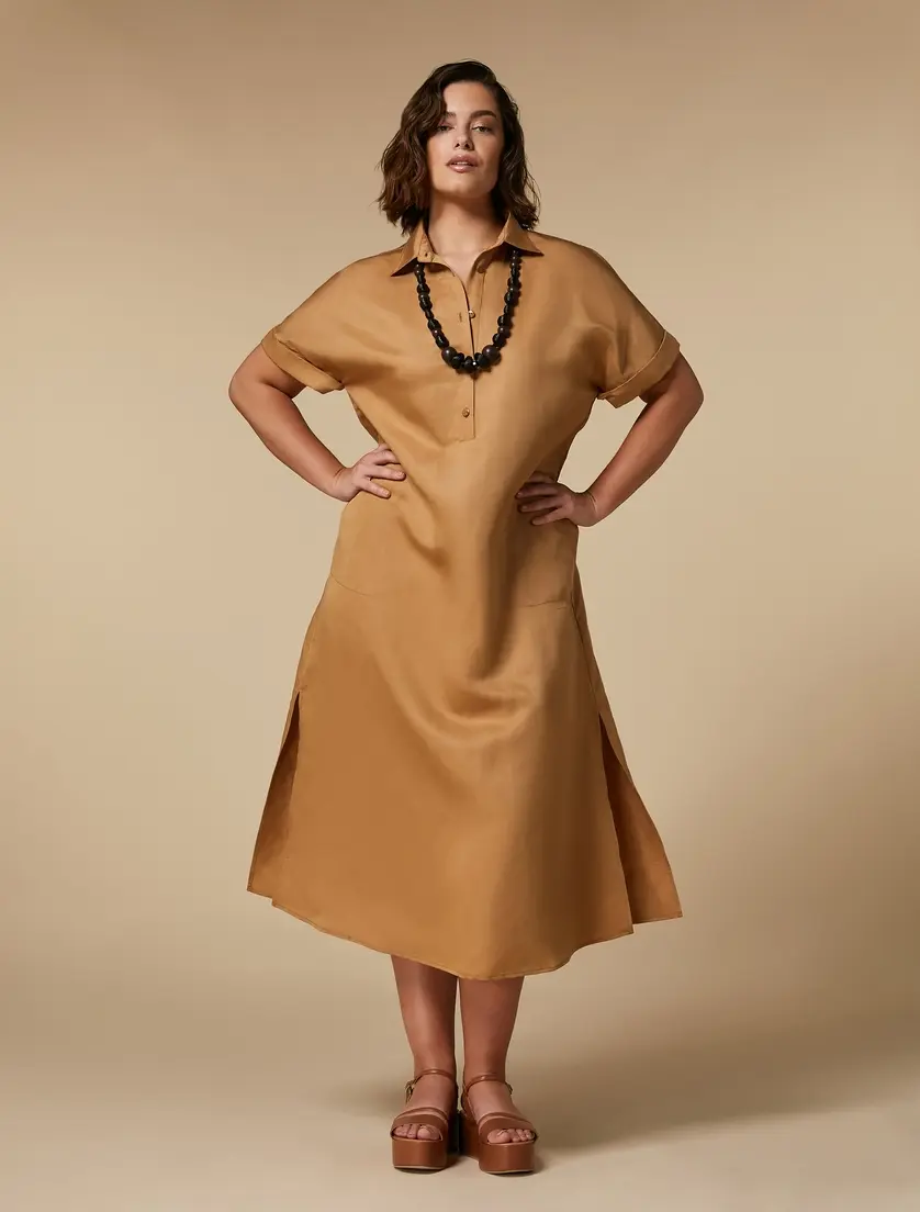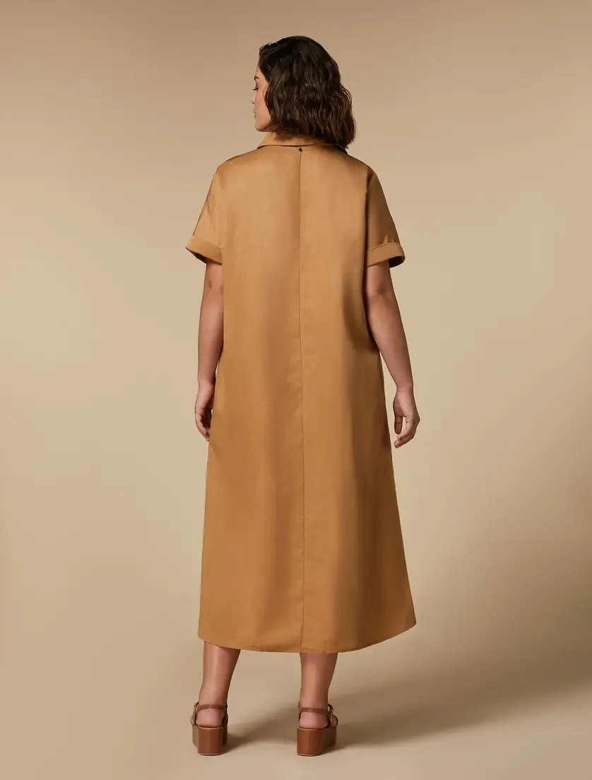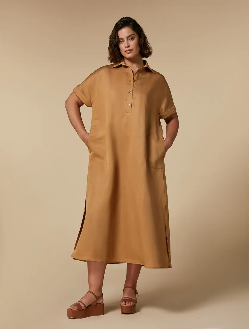 Платье от Marina Rinaldi в бежевом цвете, выполненное из смеси 59% лиоцелла и 41% льна, обладает нежной текстурой и элегантным силуэтом. Короткие рукава и классический воротник придают модели современный и утонченный вид, подчеркивая ее универсальность и комфорт.