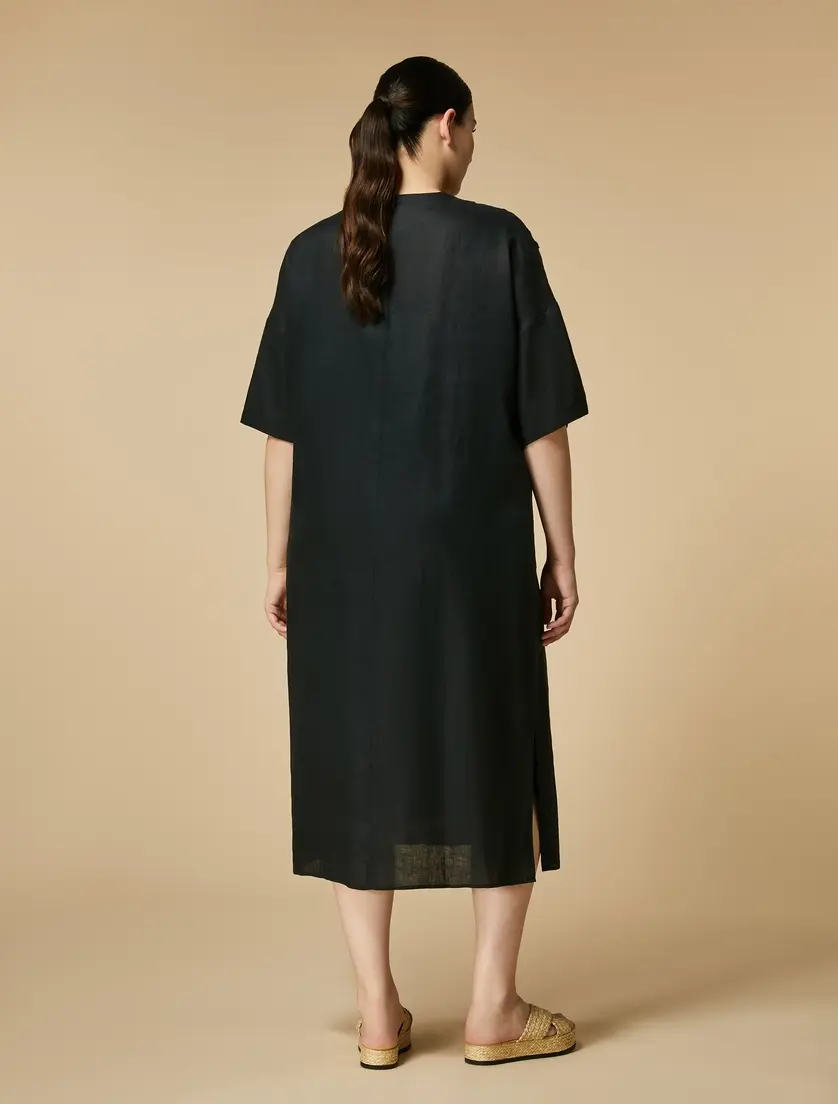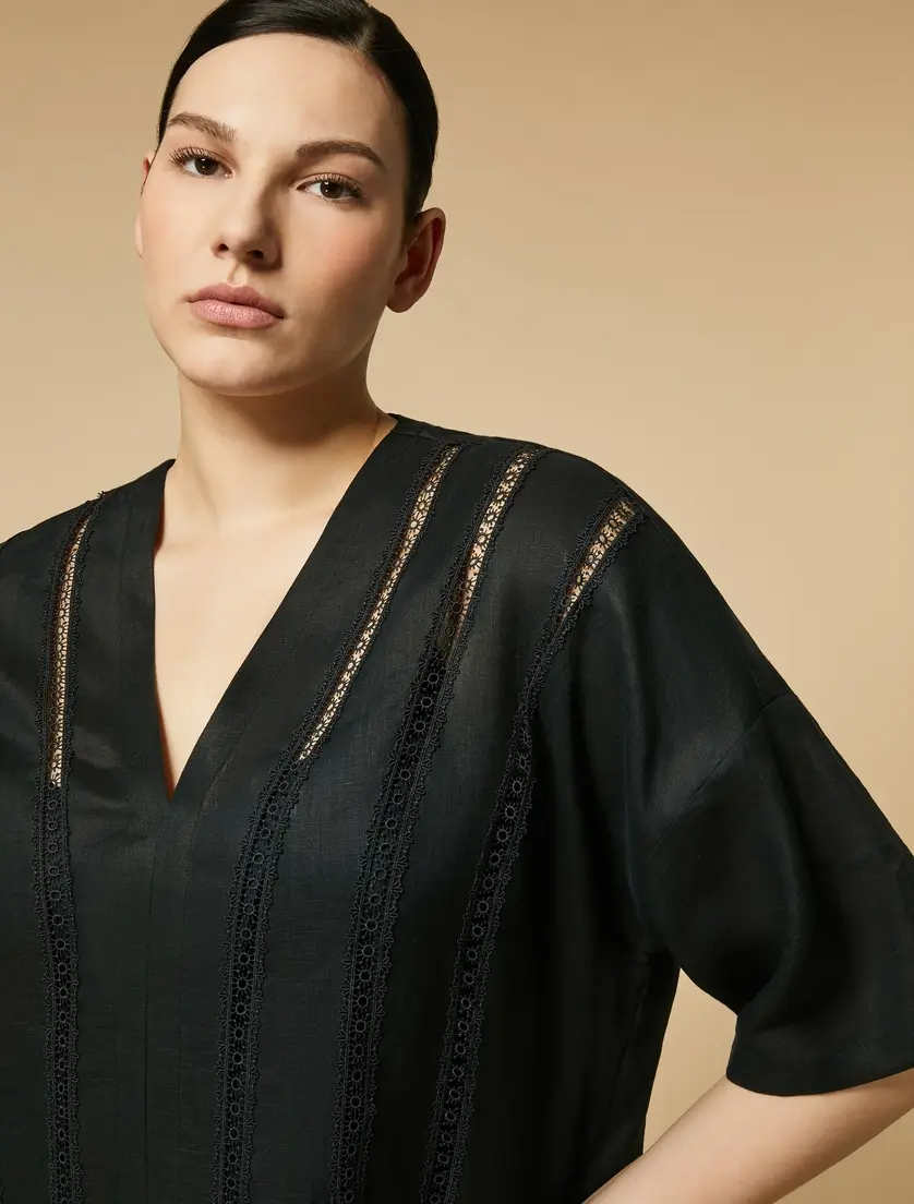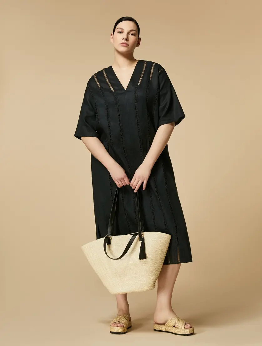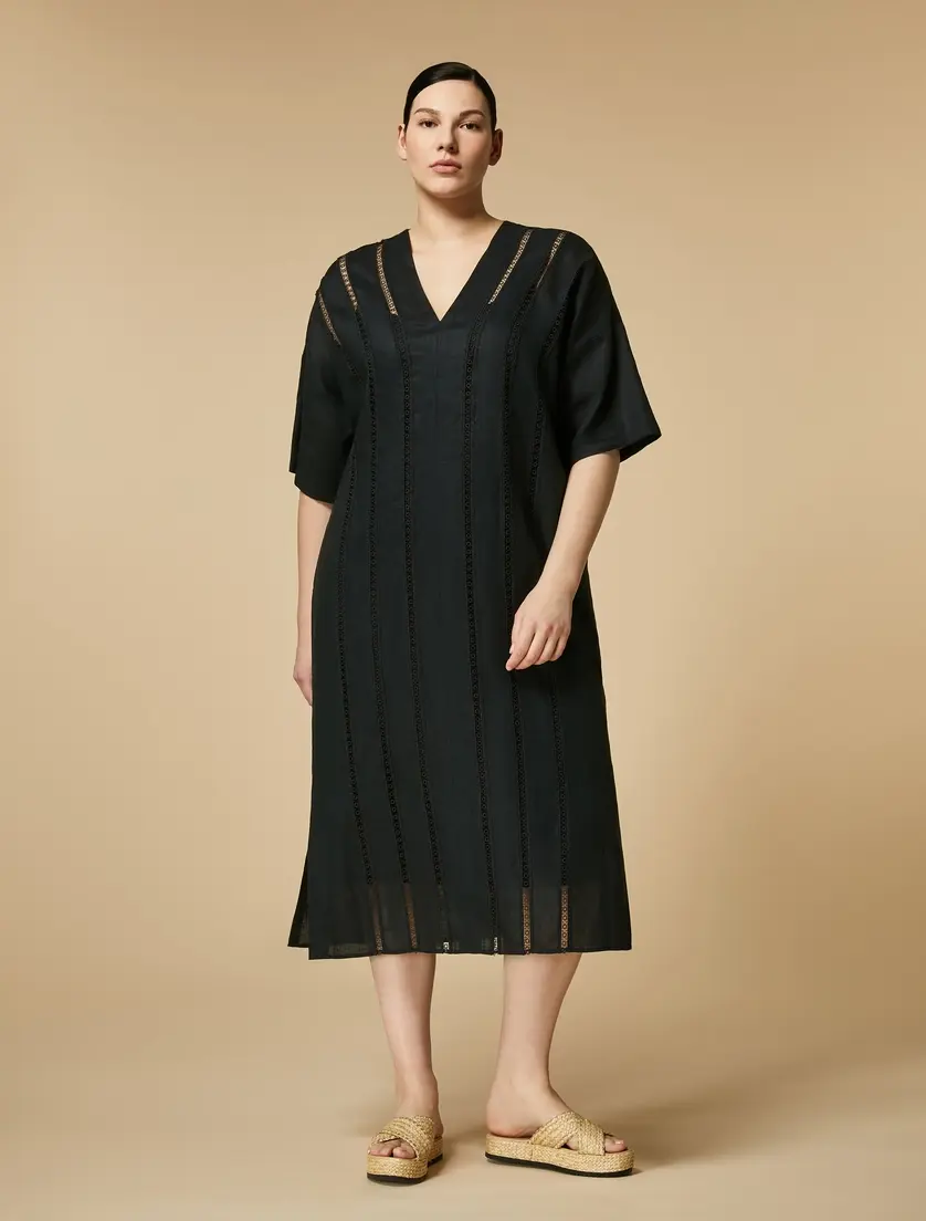 Платье из удобного чистого льняного холста, украшенного кружевными аппликациями, инкрустированными в тон. V-образный вырез, короткие рукава, тазобедренные карманы, боковые разрезы, подходящая мягкая хлопковая юбка. Расклешенная линия для женственной посадки. Легкое платье, которое можно носить весь день. Одежда является частью коллекции Voyage by Marina Rinaldi.