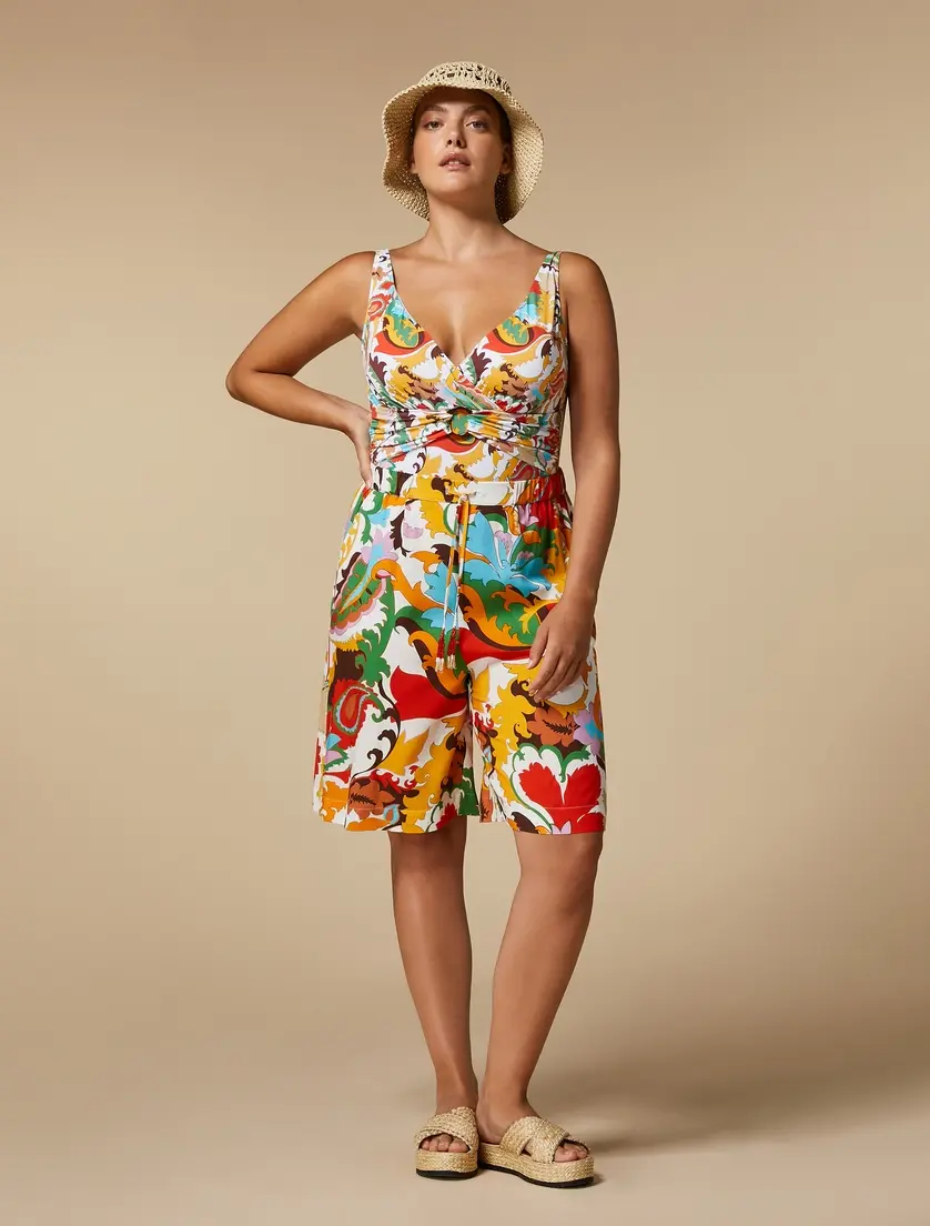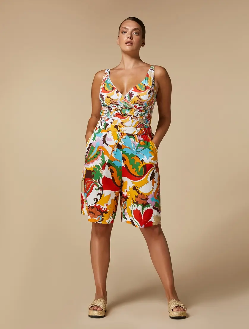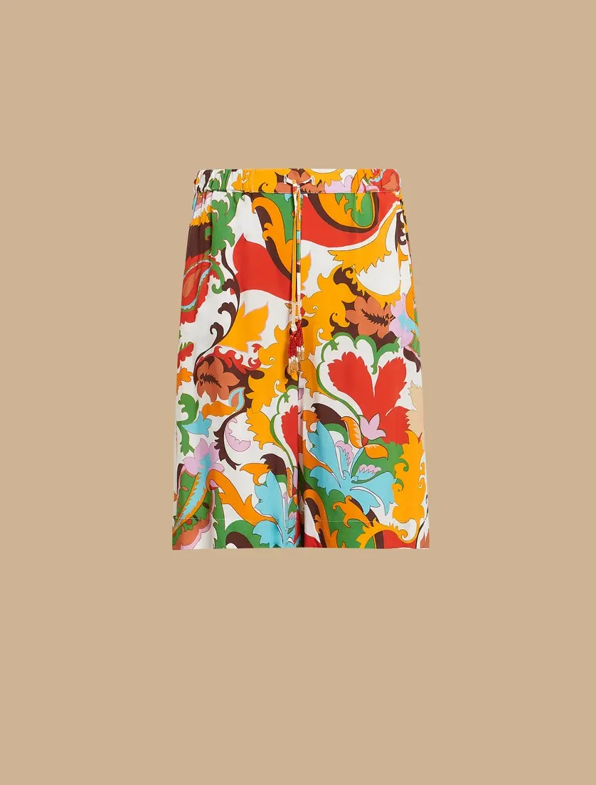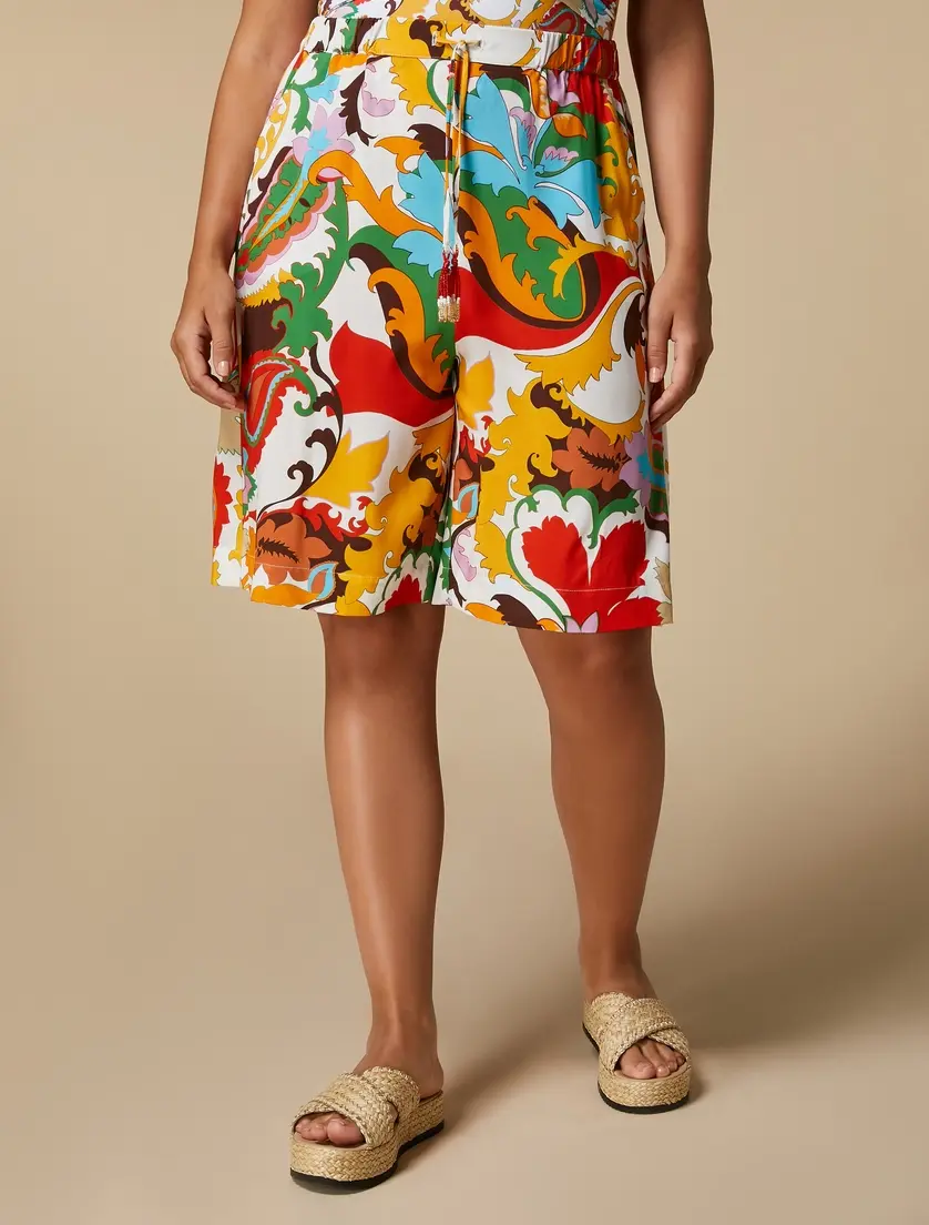 Бермуды из вискозного холста с эксклюзивным принтом. У них прямая линия, эластичная вставка на талии, шнурок с кисточками, французские карманы. Идеально подходит, чтобы придать хроматический оттенок вашему стилю, вы можете носить их в сочетании с согласованным пальто.