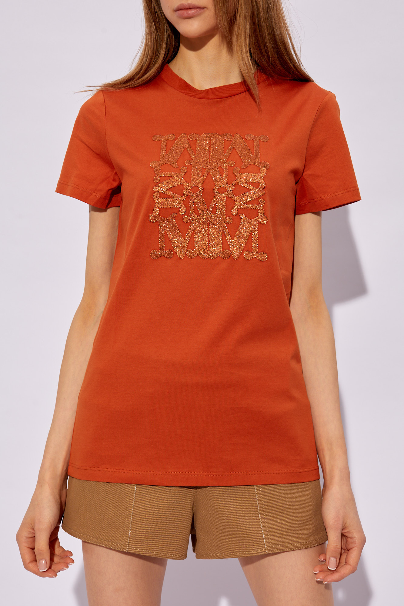 Оранжевая футболка с круглым вырезом "Taverna" от Max Mara. Изготовленный из хлопка, этот стиль демонстрирует золотой логотип, вышитый люрексовой пряжей спереди, короткими рукавами и обрезкой на воротнике.