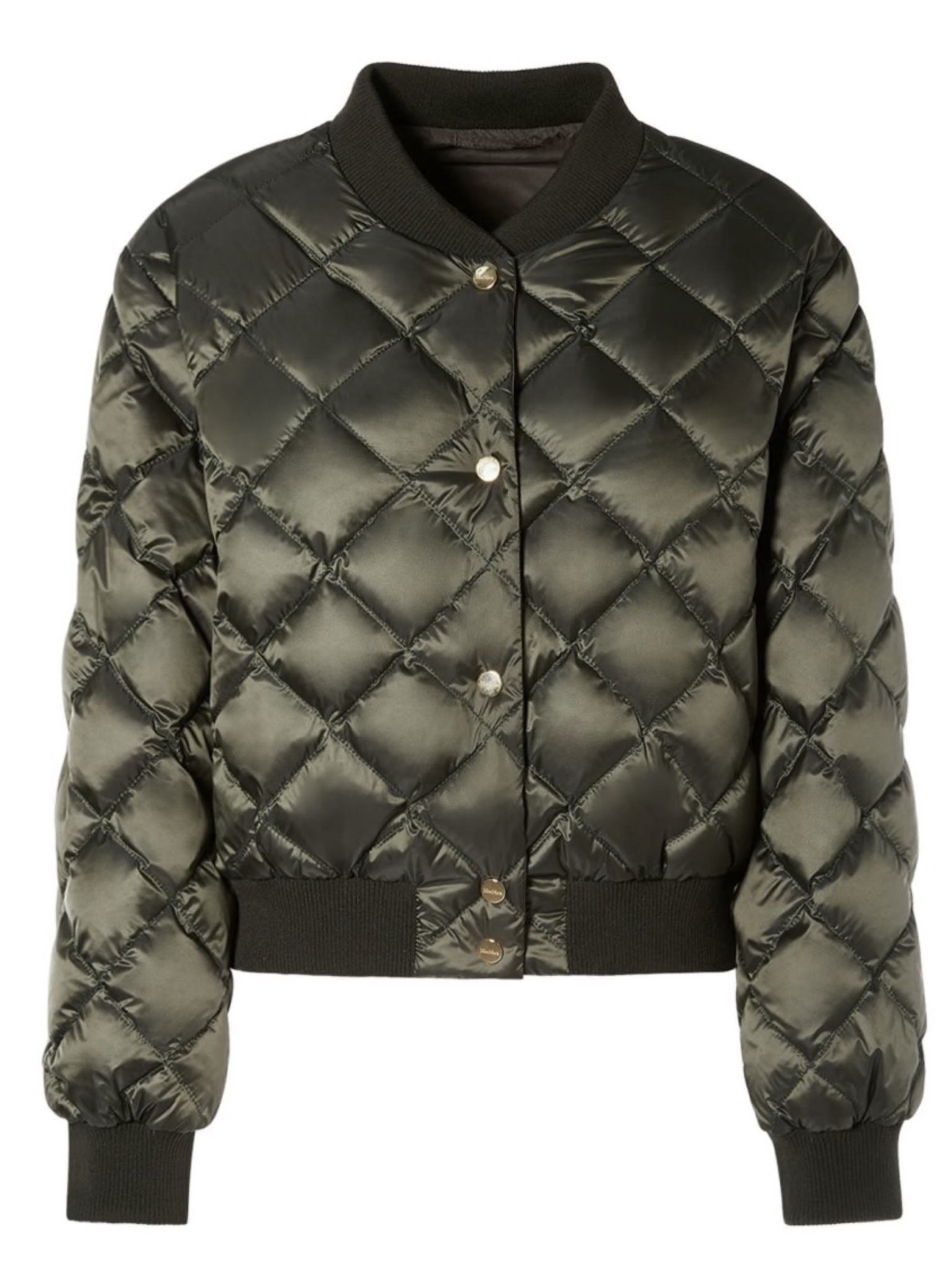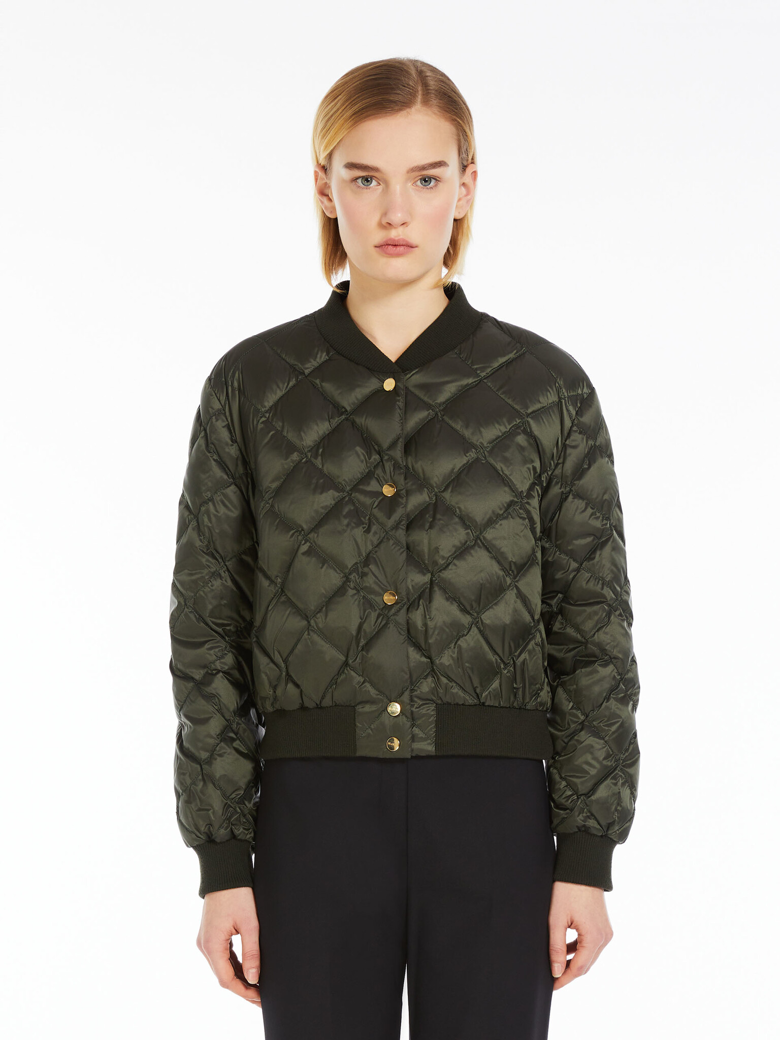 Короткая, двусторонняя куртка-бомбер из гусиного пуха, изготовленная из радужного водонепроницаемого нейлонового холста. Одна сторона из стеганого холста с ромбовидным узором, другая из гладкой технической микротафты с прорезными карманами. Стиль с культовым ребристым воротником, манжетами и подолом. Переднее крепление с индивидуальными металлическими кнопками