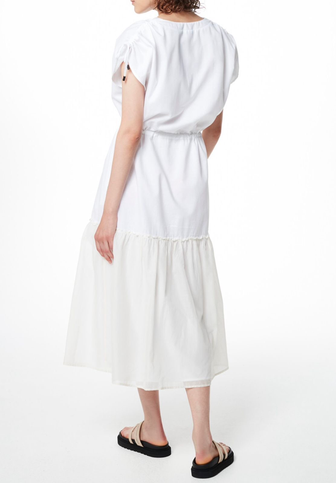 Белое платье выглядит, как комплект из рубашки и расклешенной юбки. Для пошива модели мастера использовали легкий хлопок .