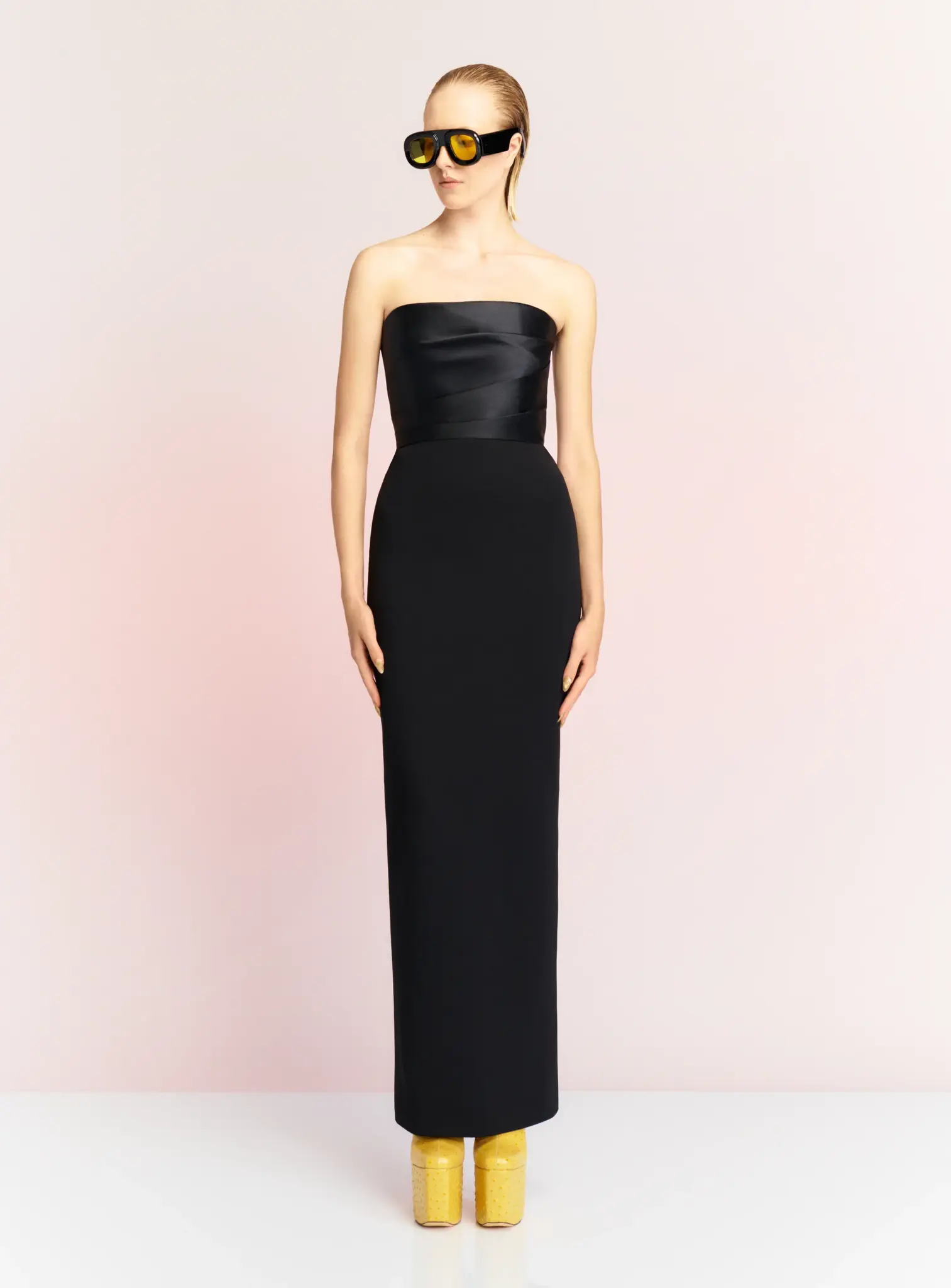 Платье Solace London "Afra" действительно вне времени. Он сделан из крепа для фигурной посадки и имеет собранный лиф из атласа. Дополните вырез без бретелек сверкающим колье.