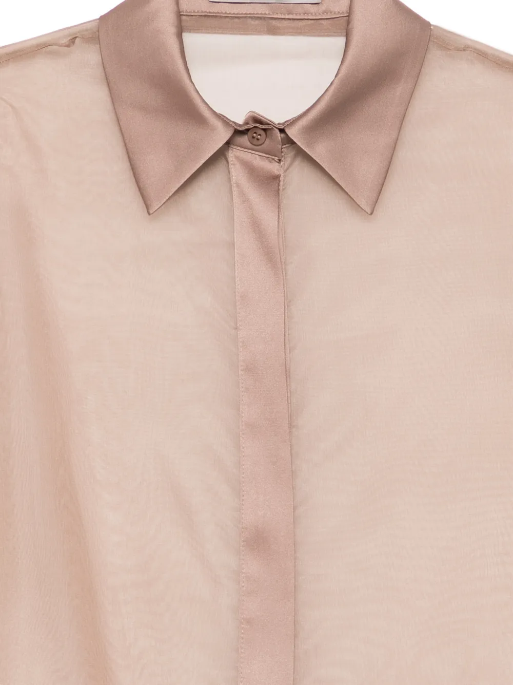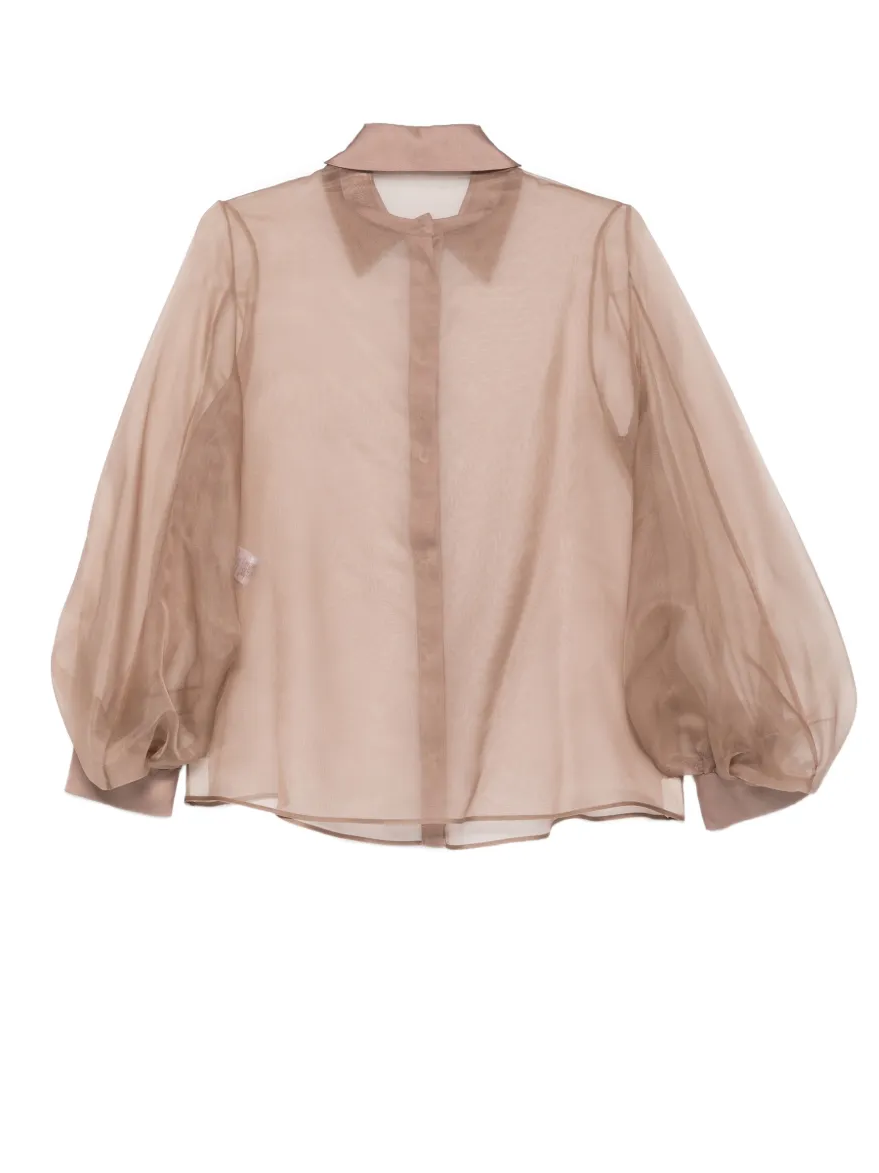 Блуза из прозрачного шелка, рукава в виде элегантных воланов. Идеально сочетается с брюками в тон этого бренда.