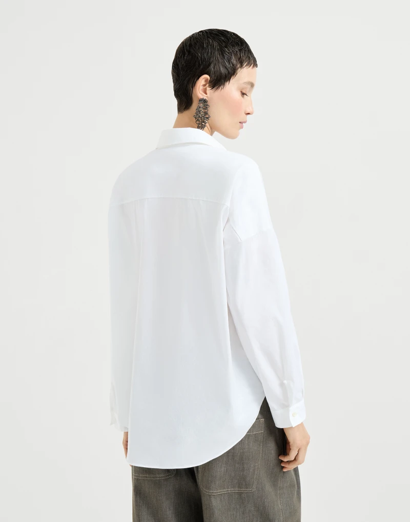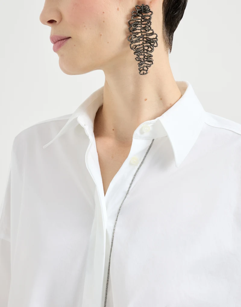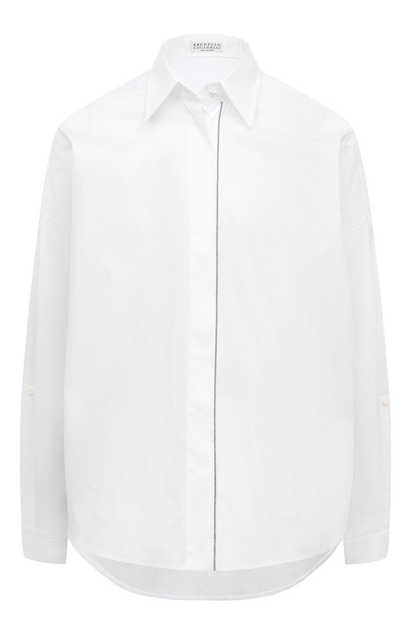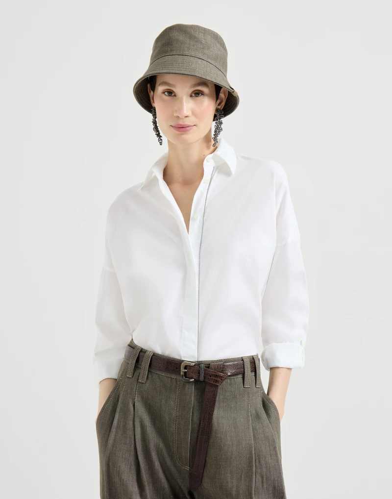 Культовый декор коллекций Brunello Cucinelli украшает рубашку из эластичного хлопкового поплина — поистине классической ткани. Тонкая вышивка из цепочки Мониль дополняет потайную застежку изделия сияющей полосой. Крой модели является приятным, со слегка расклешенным низом.
