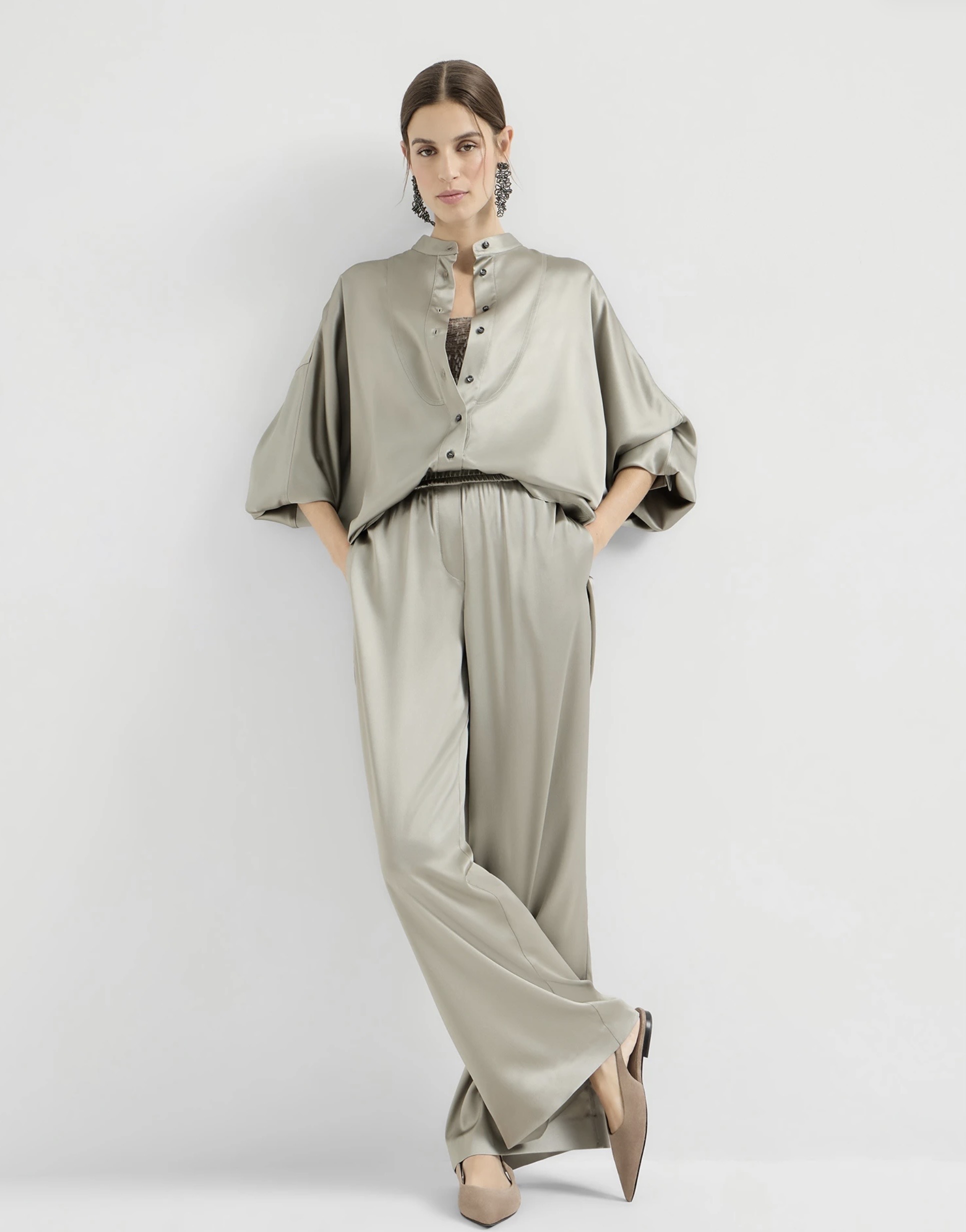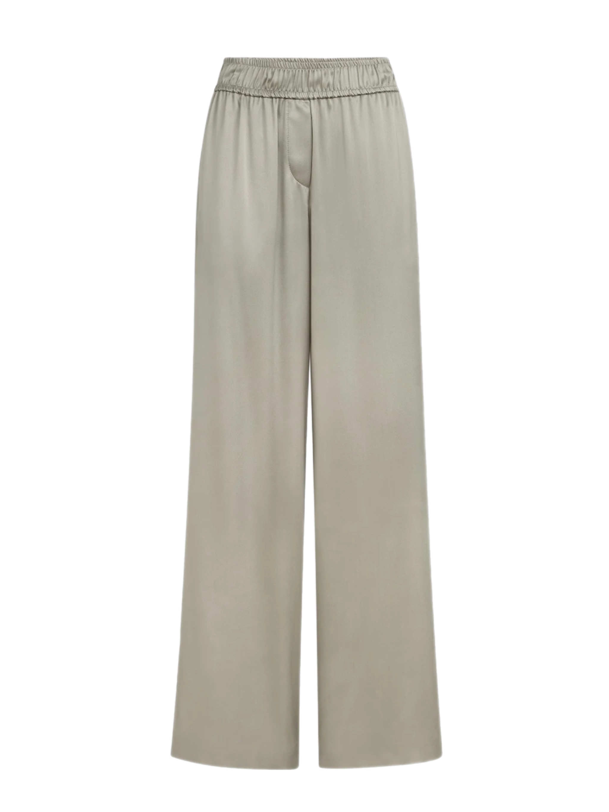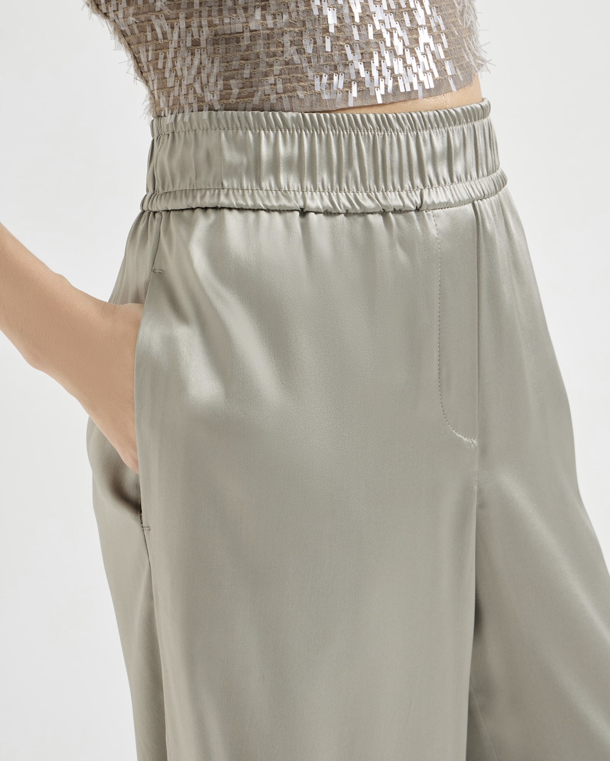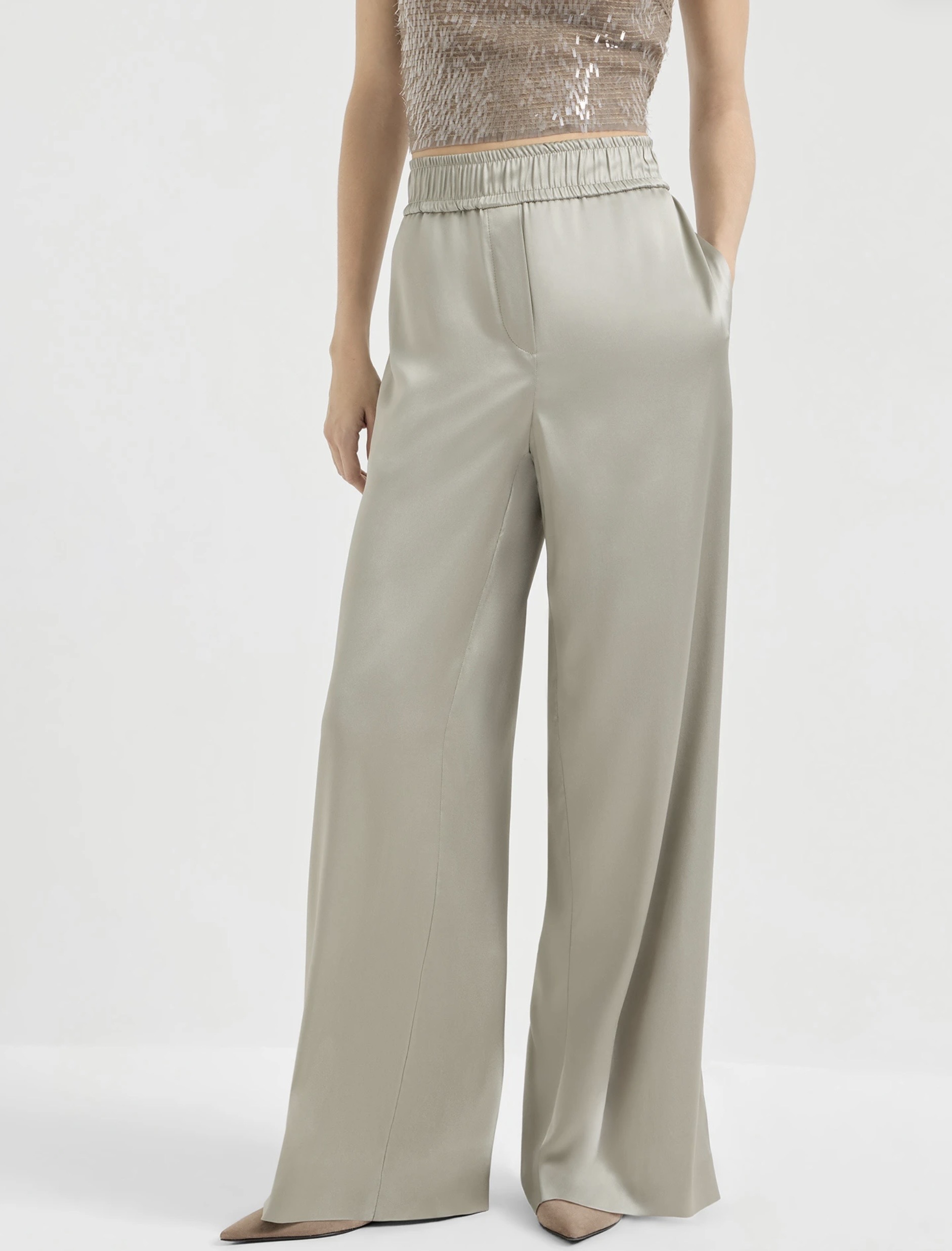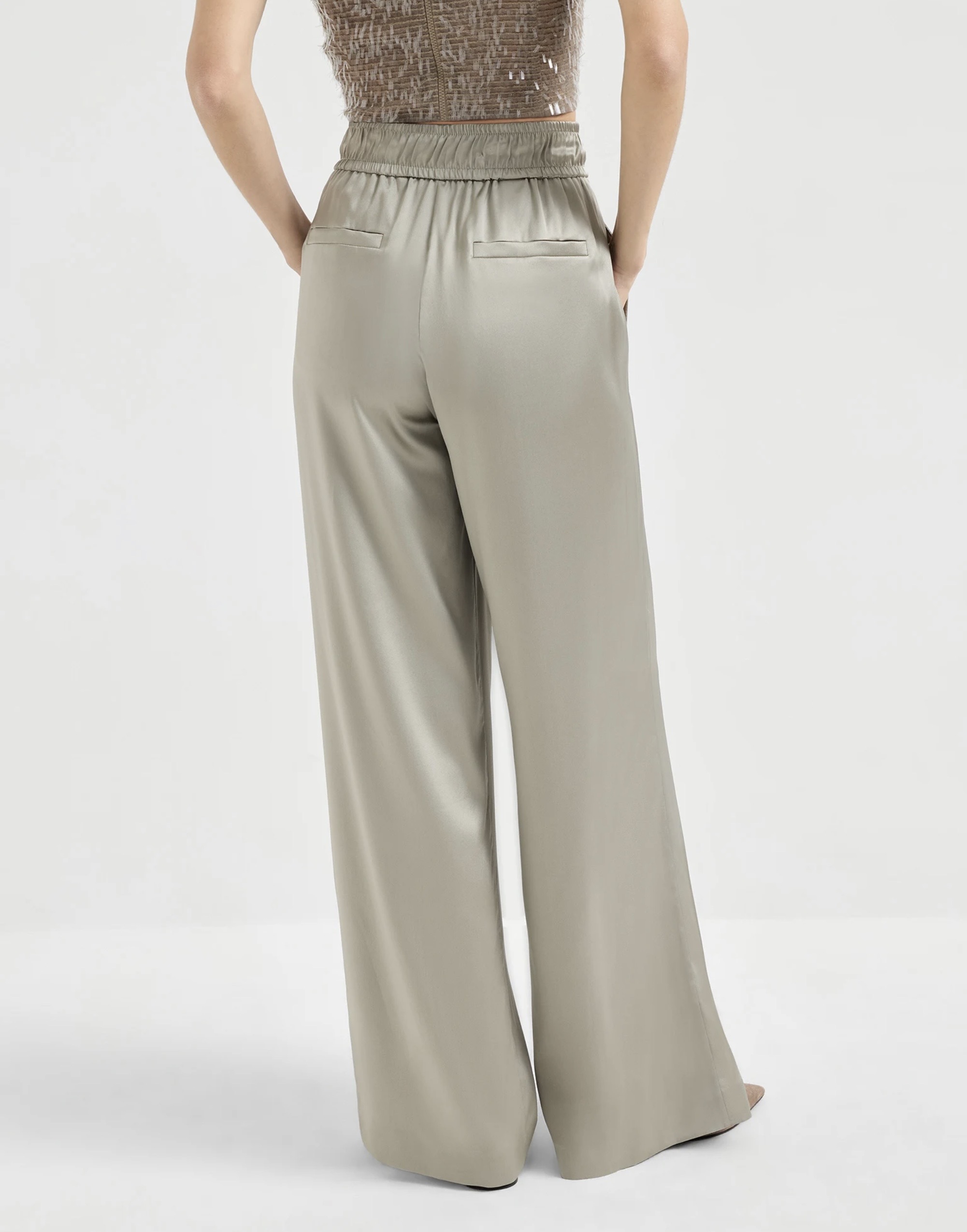 Эти эластичные шелковые атласные брюки сочетают в себе женственную элегантность с расслабленным объемом. Характерная жидкая, мерцающая текстура ткани дополняет мягкие линии одежды, делая ее особенно удобной для ношения. Посадка обеспечивает комфорт и придает стилю непринужденное ощущение.