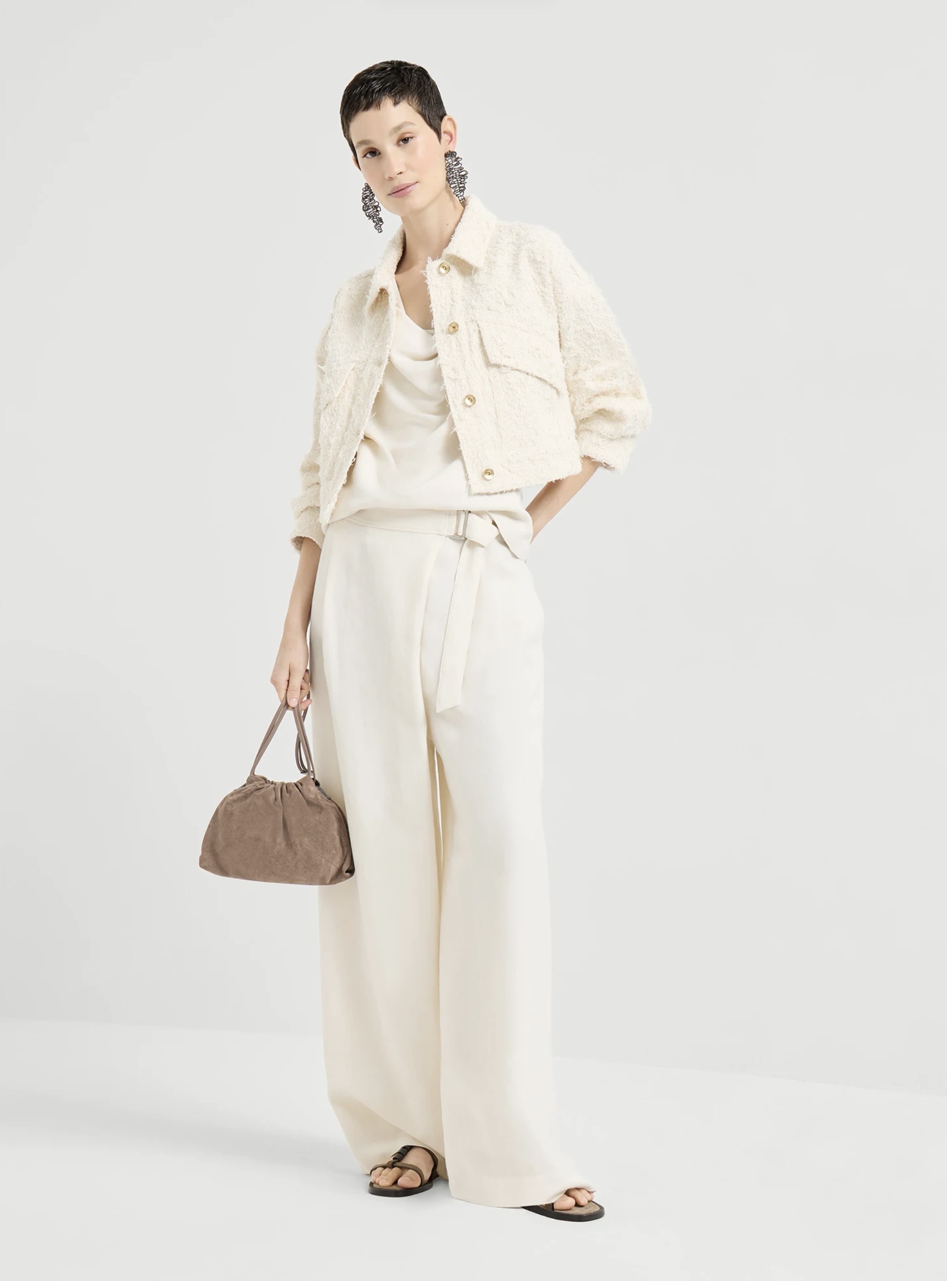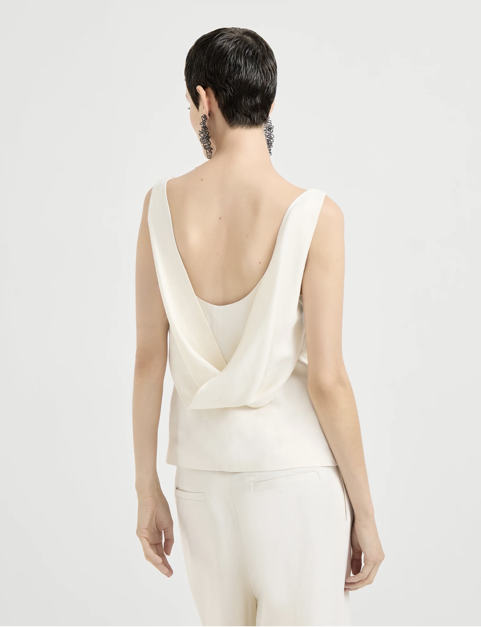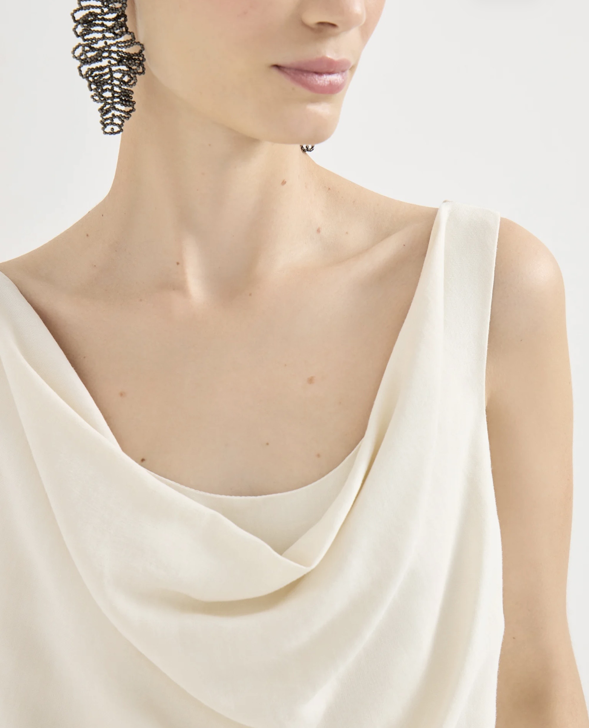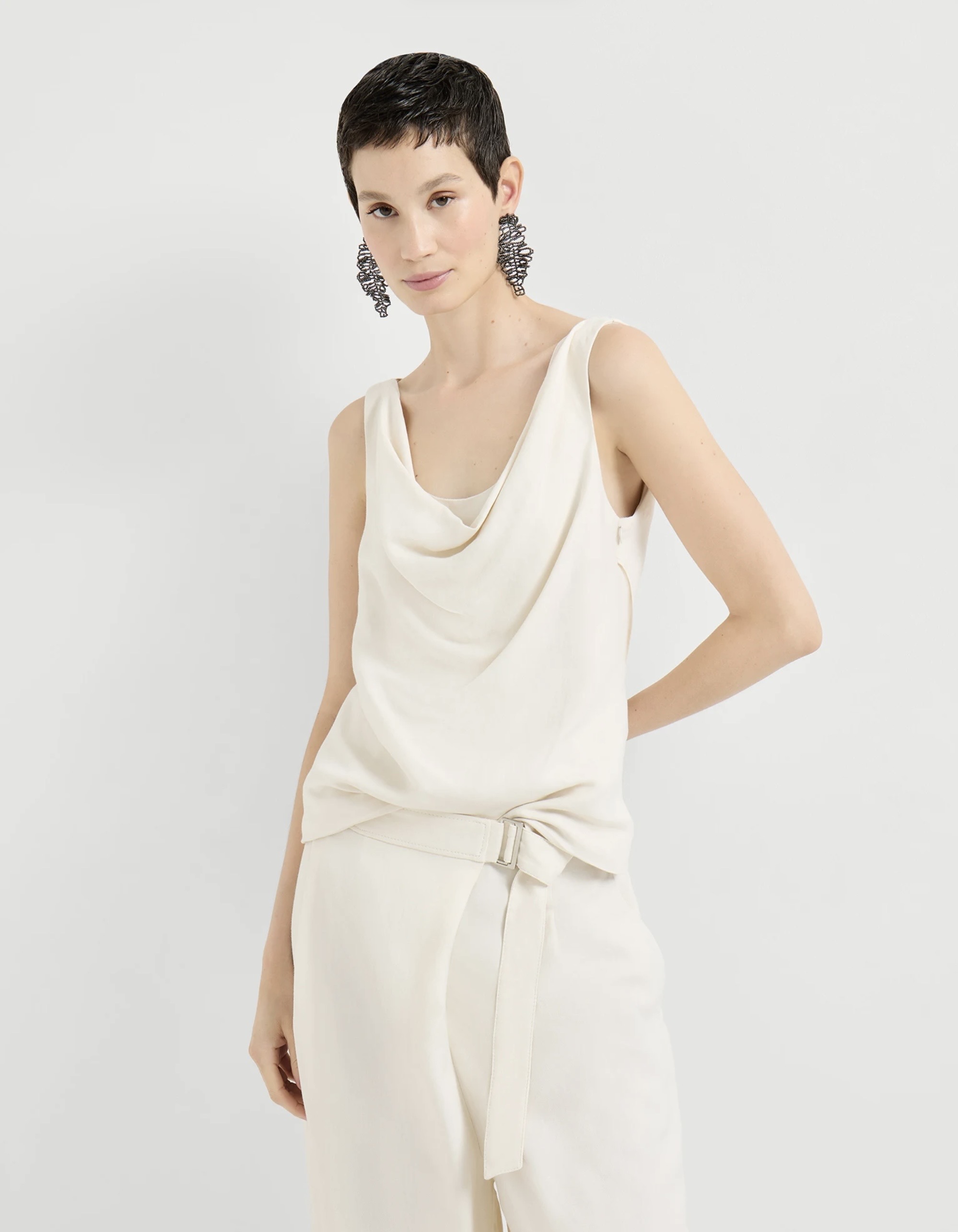 Тонко женственный по настроению, этот топ из вискозно-льняной смеси Brunello Cucinelli отличается текучей твиловой фактурой и изящным драпированием, подчеркивающим лаконичный силуэт. Мягкая, струящаяся ткань формирует элегантные складки по фигуре, сохраняя чистоту линий и создавая утончённый образ. Универсальный бежевый оттенок позволяет носить топ как самостоятельный элемент с расслабленными комплектами или сочетать с классическими жакетами, что идеально вписывается в эстетику современной женской одежды и актуального спортивного шика.