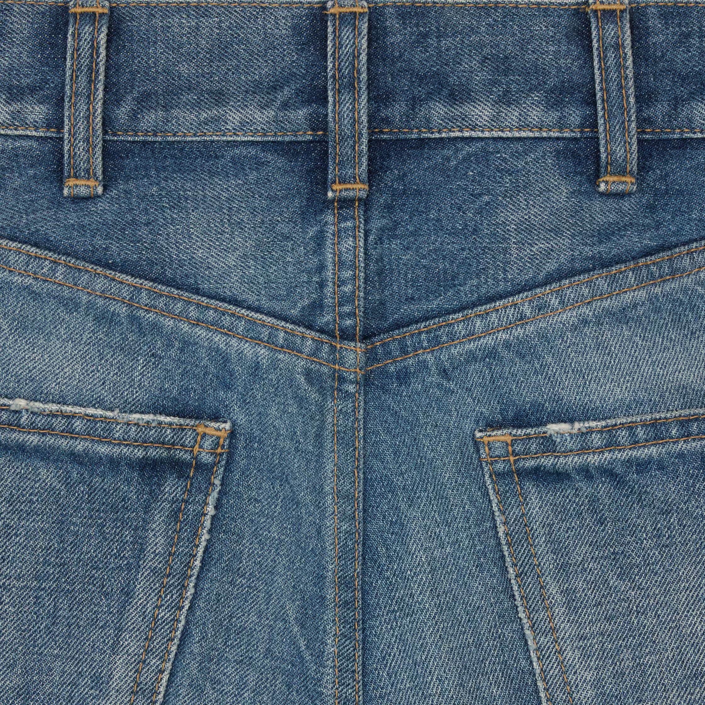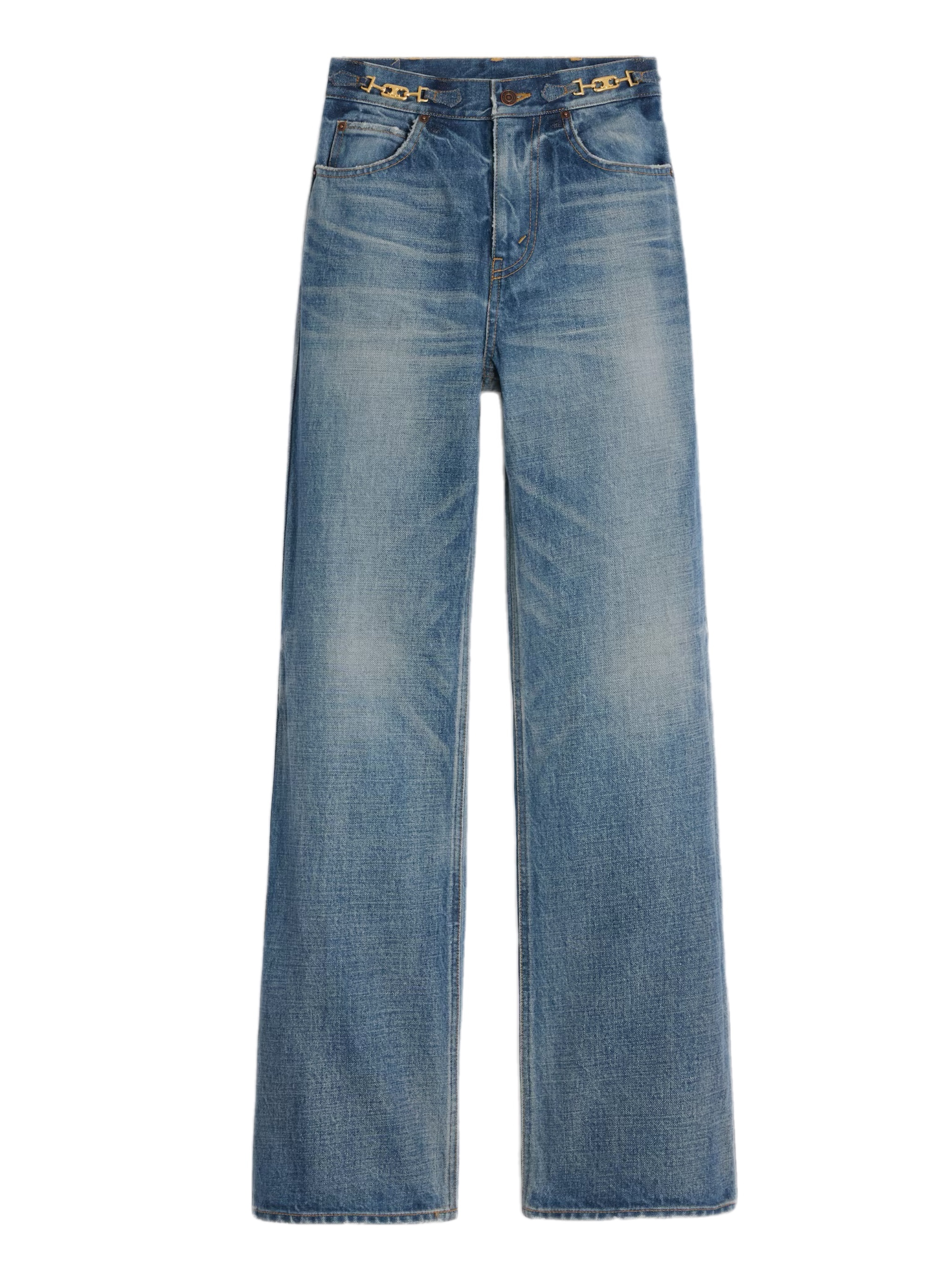 Джинсы CELINE JANE FLARE прямого кроя, из хлопкового денима синего цвета, модель декорирована искусственными заломами и потёртостями. Пять карманов, шлёвки, застёжка-молния. По бокам на поясе модель украшена цепочкой с фирменным логотипом бренда.