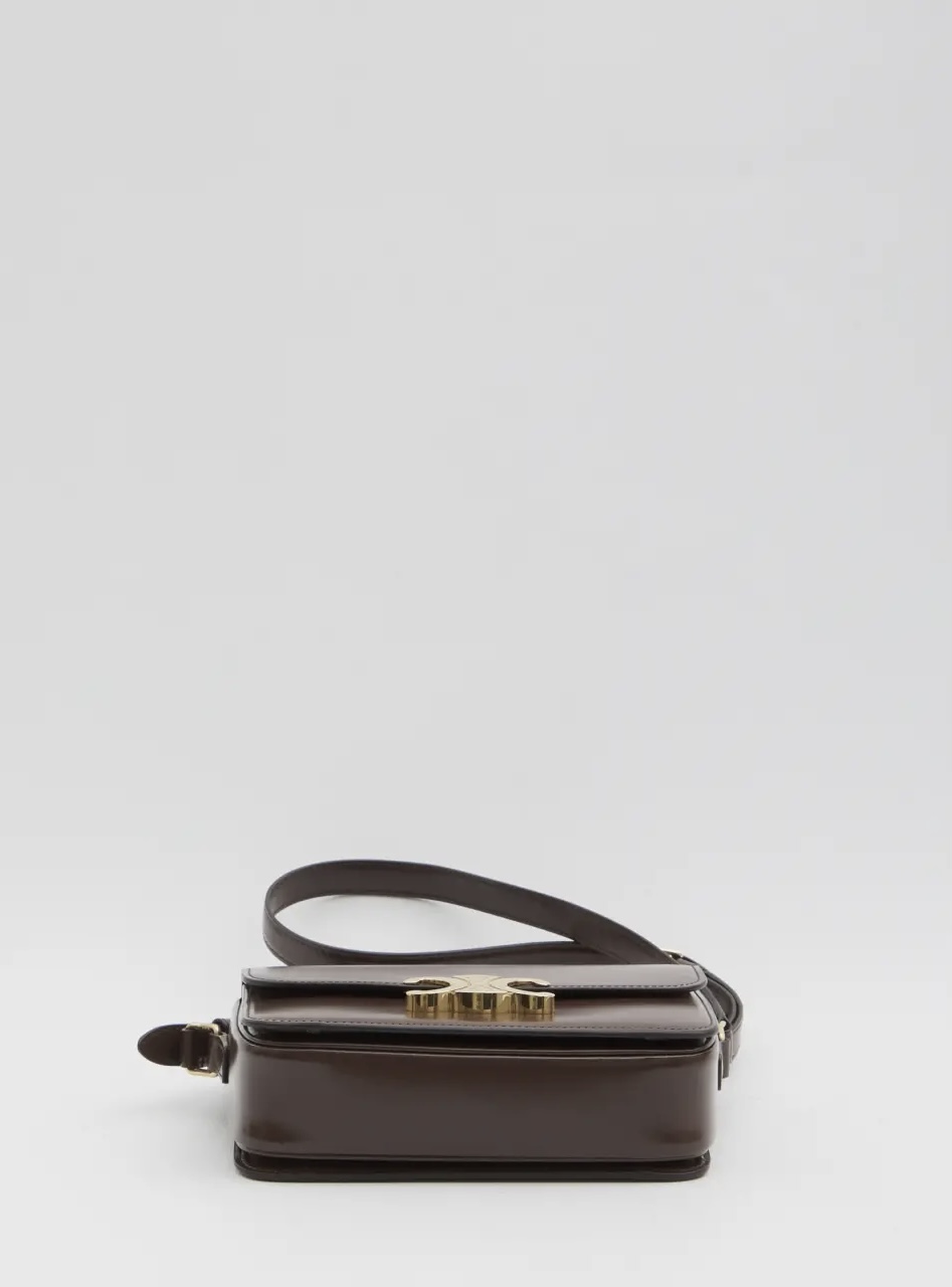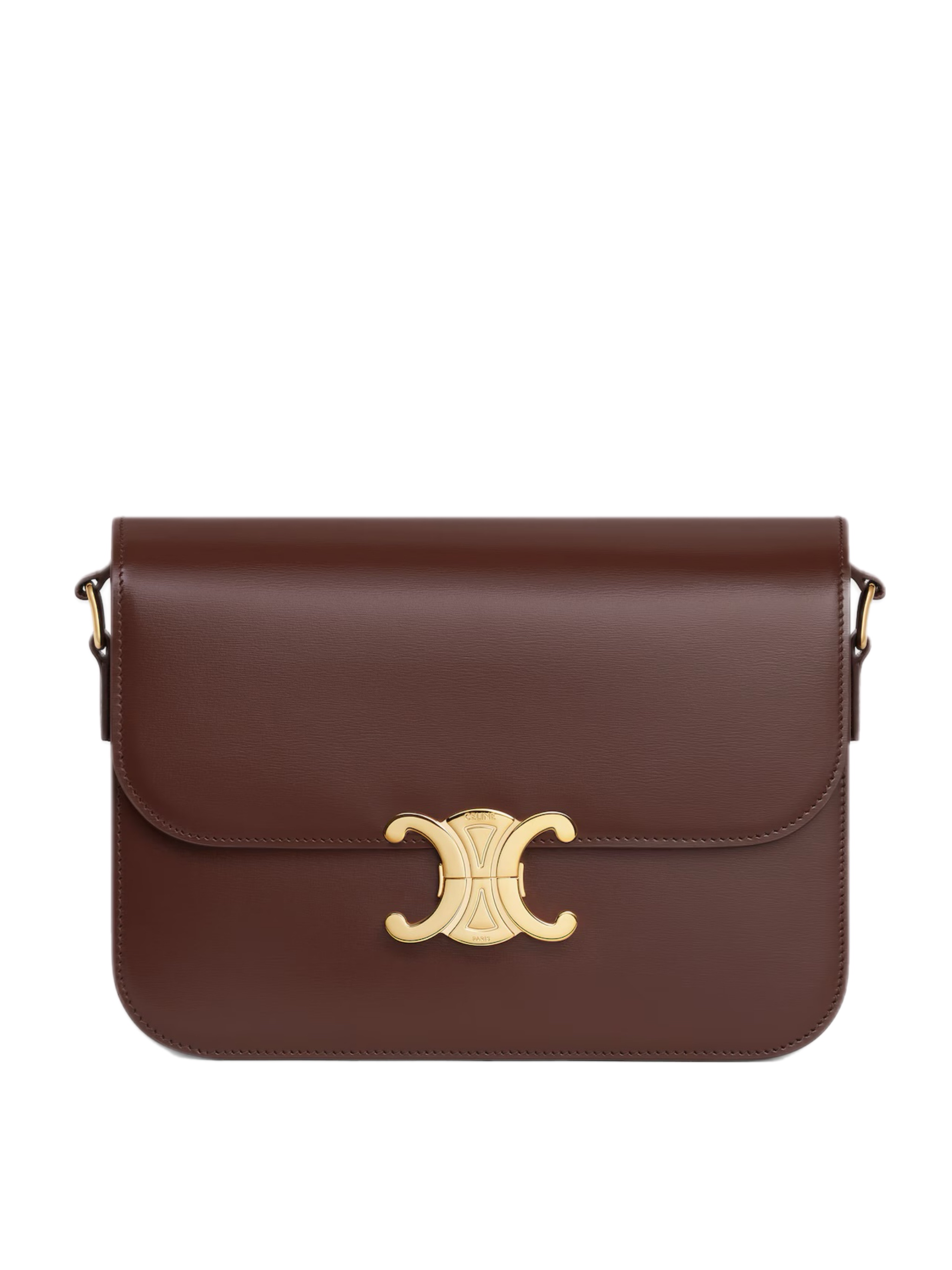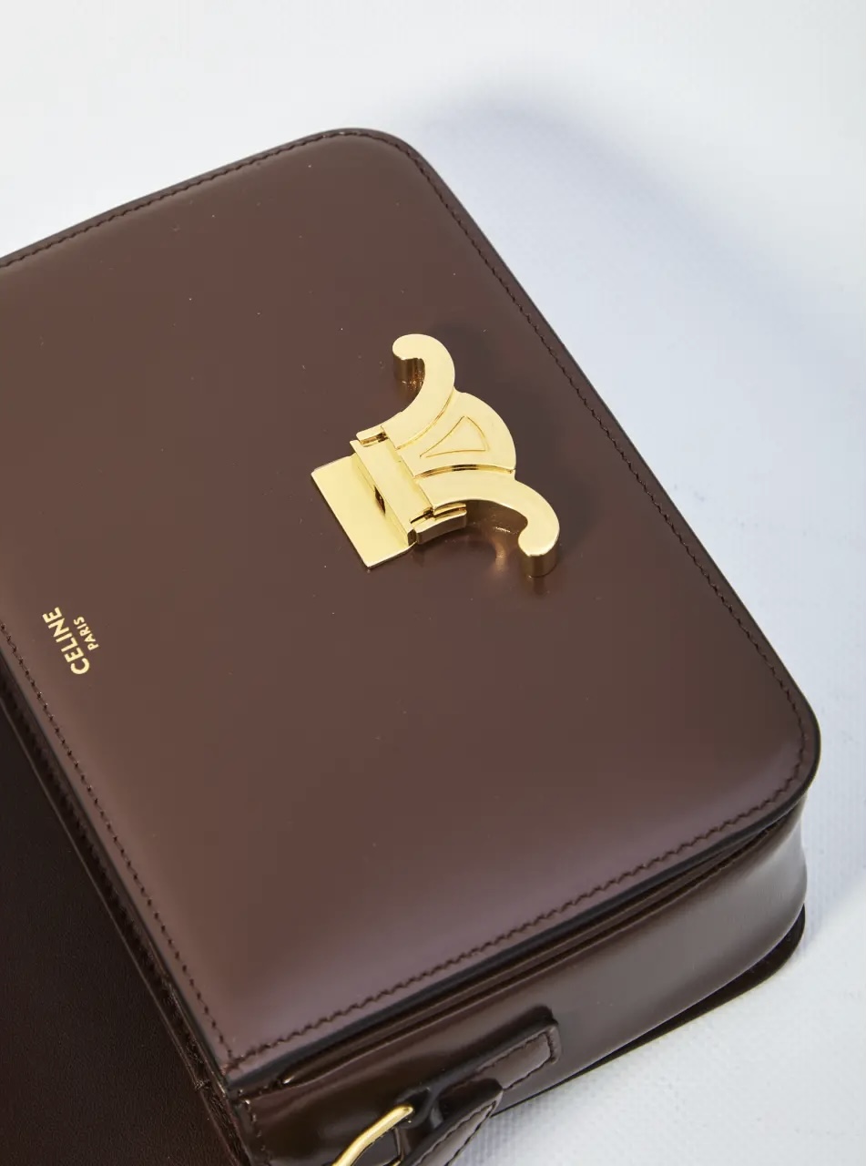 Сумка Teen Triomphe из гладкой и глянцевой каштаново-коричневой телячьей кожи с золотистой застежкой Triomphe. Он имеет регулируемый плечевой ремень, три основных внутренних отделения и один внутренний карман на молнии с подкладкой из овчины. Мешок для пыли в комплекте. Любые недостатки в коже не должны рассматриваться как производственные дефекты, а как характеристика материала.