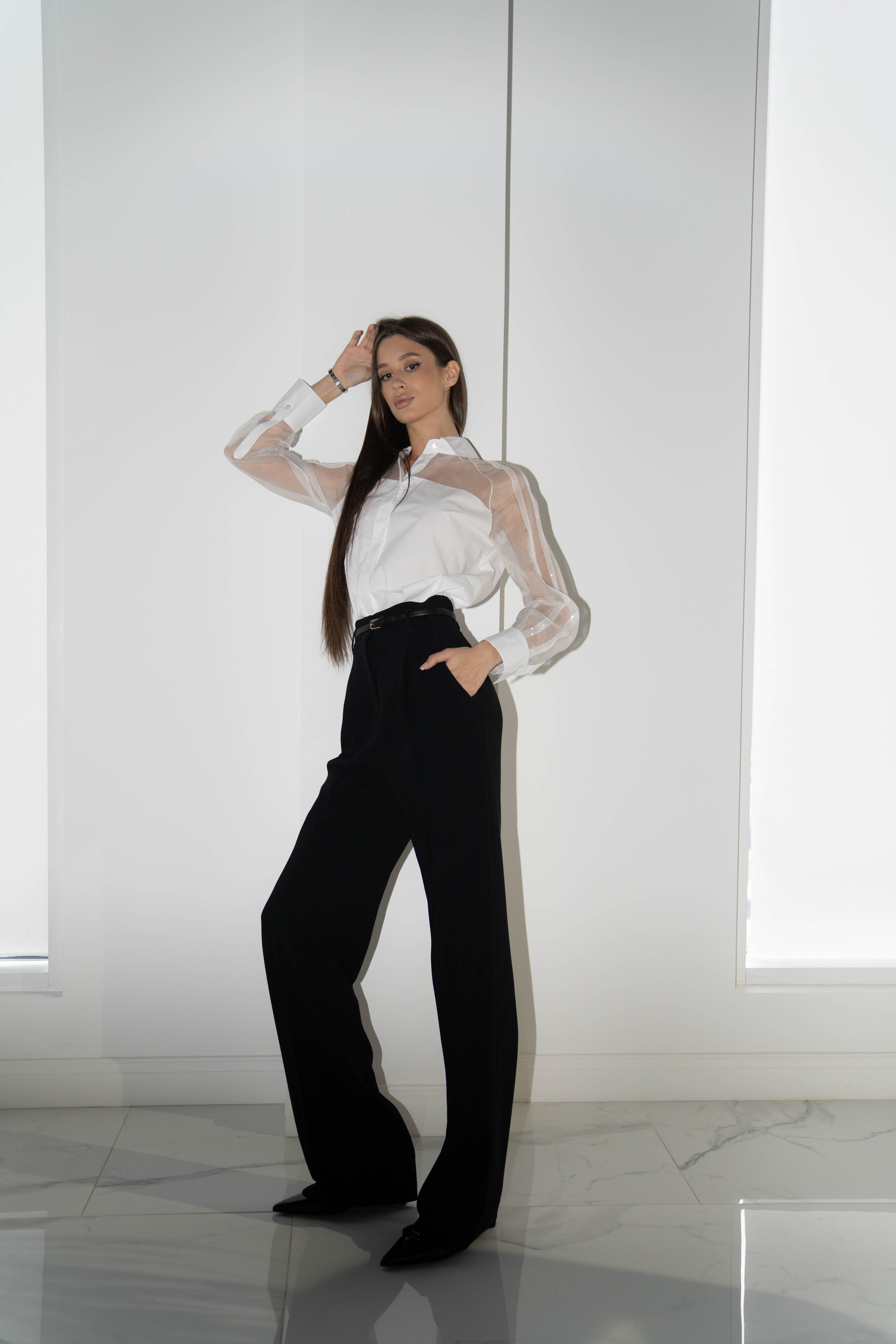 Хлопковая блуза с длинными прозрачными рукавами и кокеткой из органзы. Модель дополнена функциональной застежкой-планкой с пуговицами и широкими манжетами. Изысканности изделию добавляет отделка цепочкой мониль по линии груди. Оригинальная блуза легко впишется в различные образы, придав им индивидуальность.