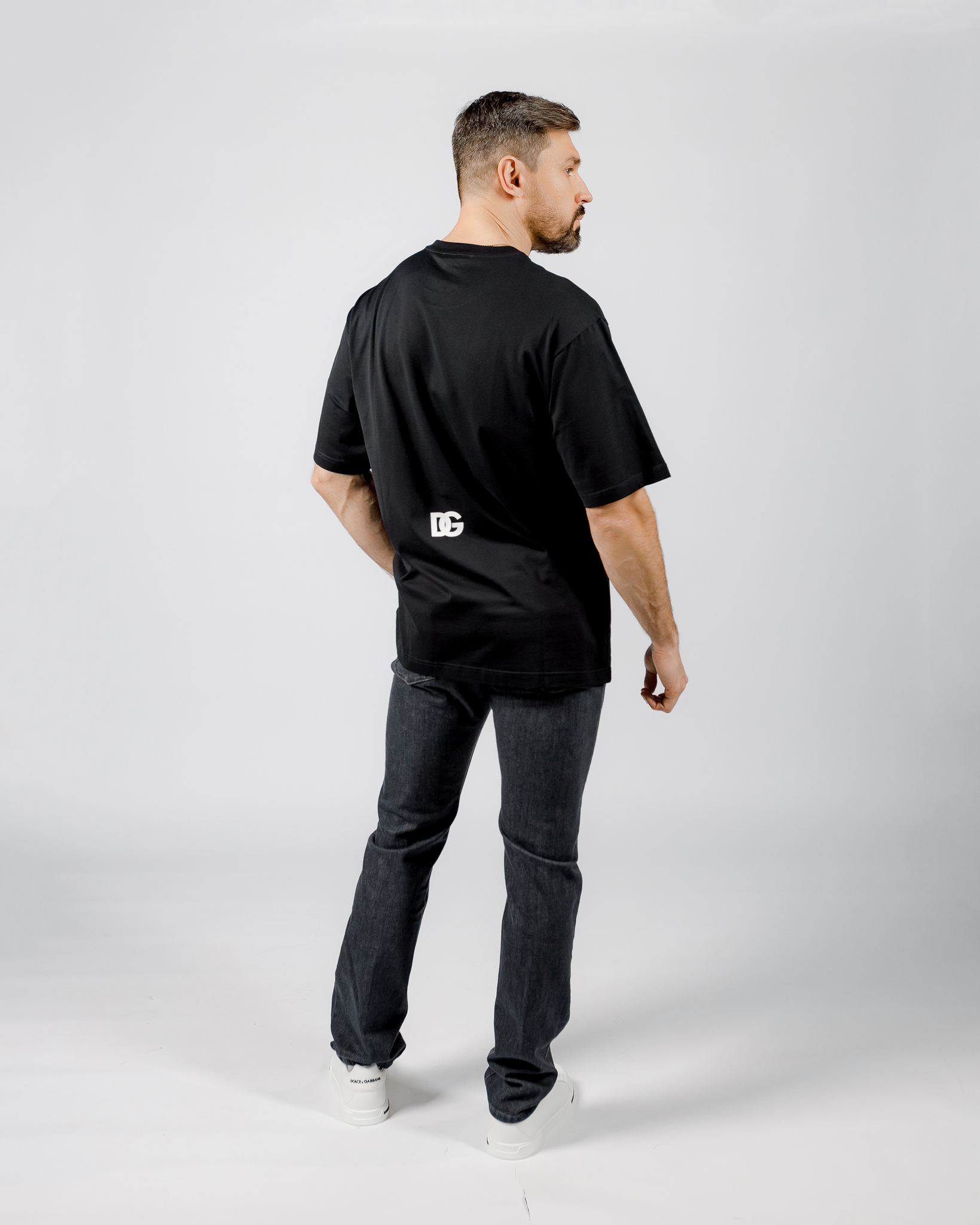 Футболка из хлопка в черном цвете от DOLCE & GABBANA. Модель свободного кроя с короткими рукавами, круглым вырезом горловины и принтом. Футболка дополнит повседневные образы с удобными джинсами.