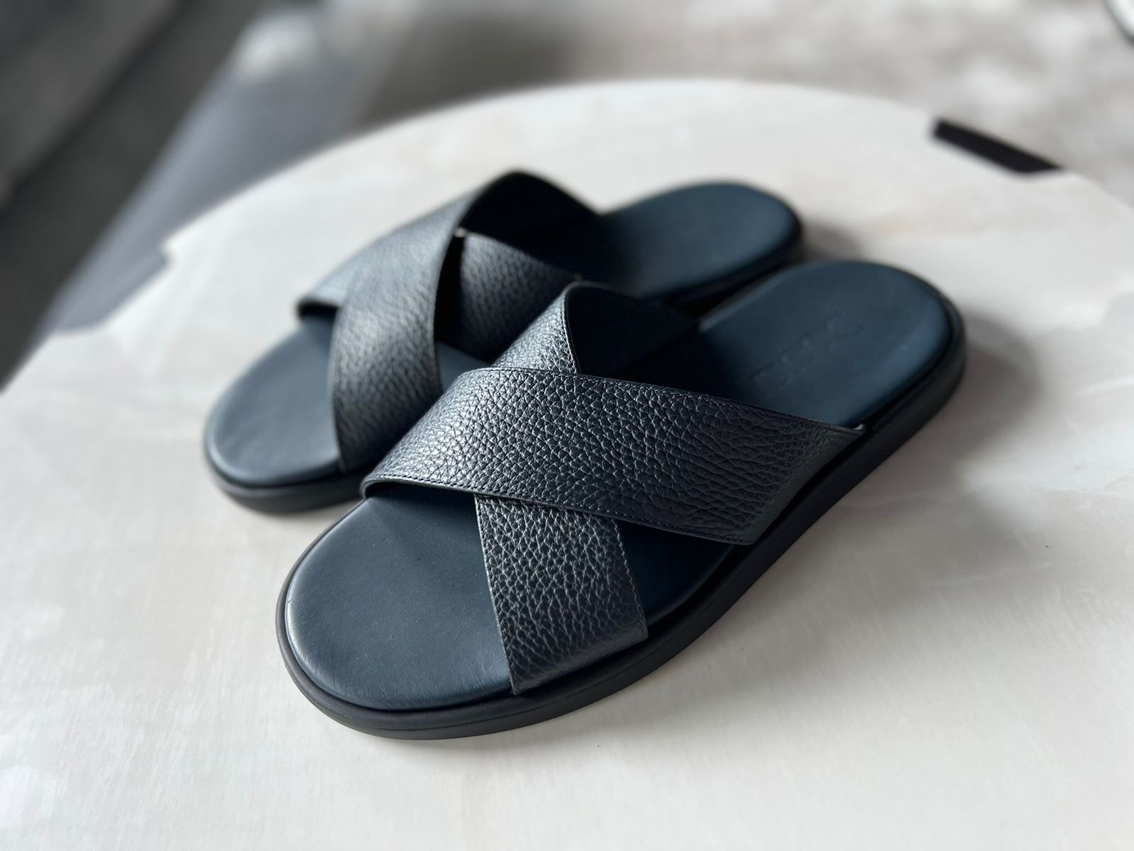 Кожаные шлепанцы темно-синего цвета с перекрестными ремешками. Комфортная модель на лето.