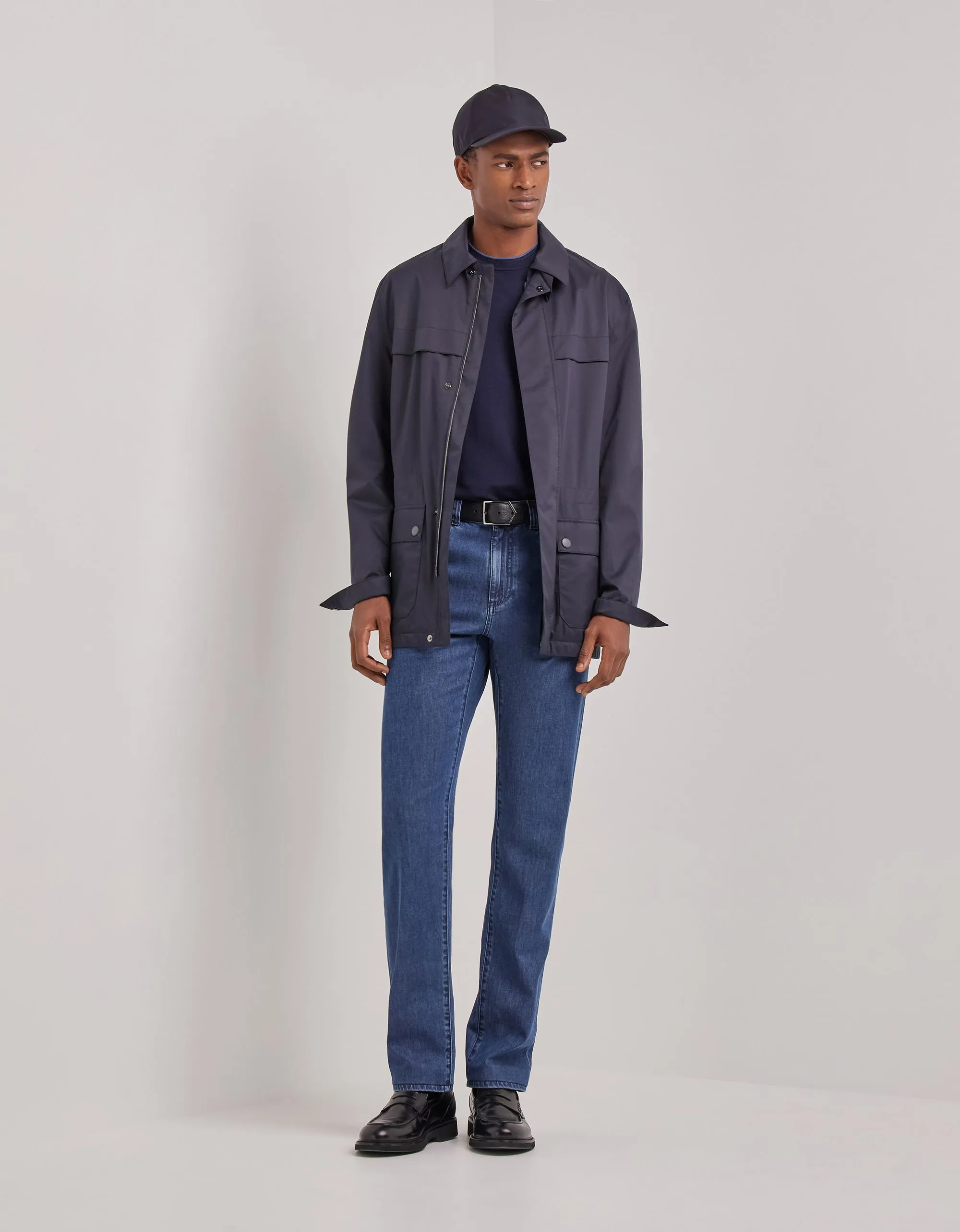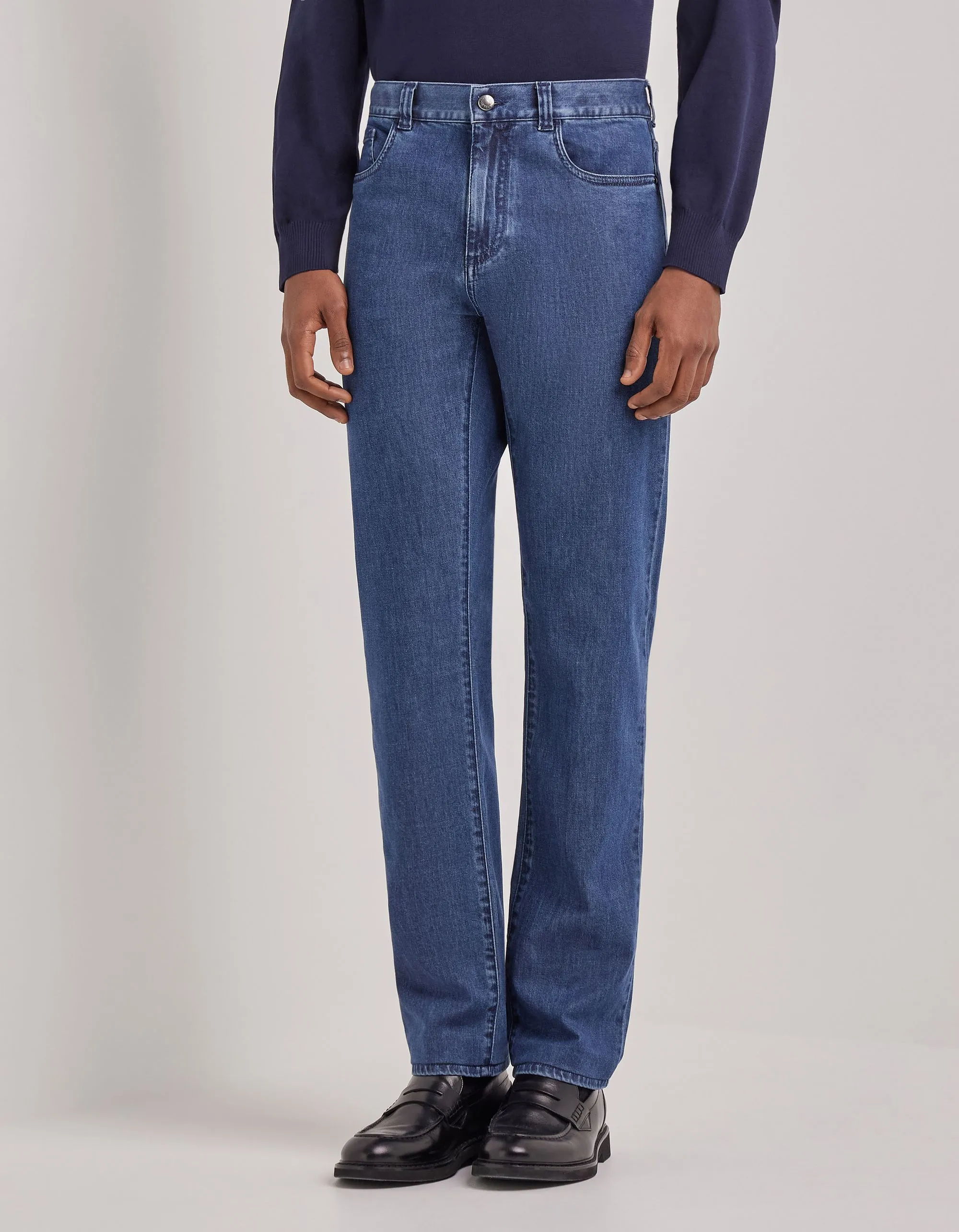 Брюки с пятью карманами из хлопкового и шелкового денима, которые предлагают изысканное переосмысление классических джинсов в обычном крое. Смесь натуральных волокон придает ткани мягкую, гибкую текстуру, обеспечивая комфорт и свободу движений в течение дня. Универсальная вещь, идеально подходящая для легкого завершения повседневного образа мужчины, который ценит отполированный, современный стиль.