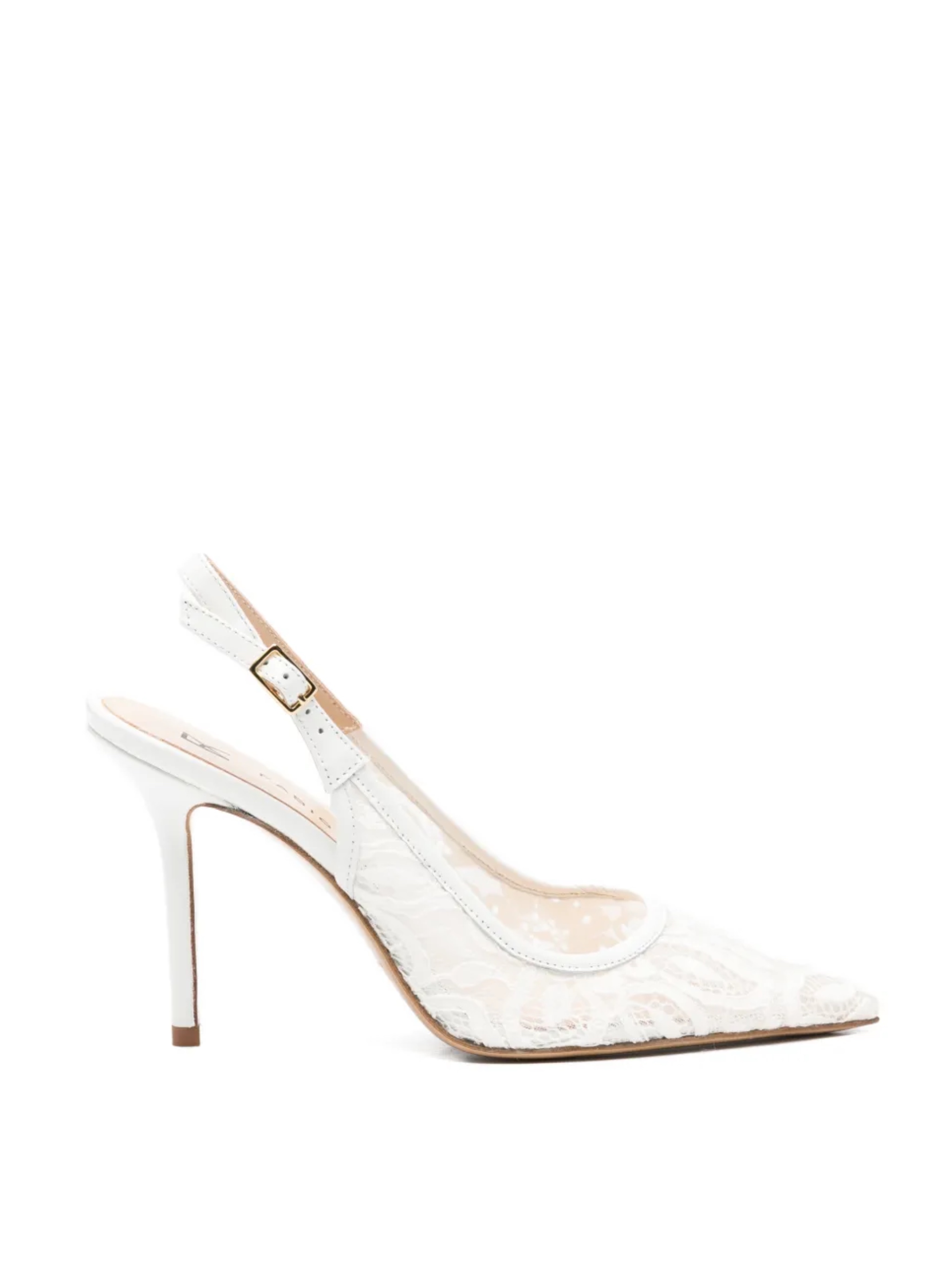 Белые босоножки из ажурной ткани с отделкой натуральной кожей от FABIO RUSCONI. Модель с зауженным мысом, открытой пяткой, ремешками с пряжками вокруг щиколоток, каблуком-шпилькой комфортной высоты, внутренней отделкой из натуральной кожи.