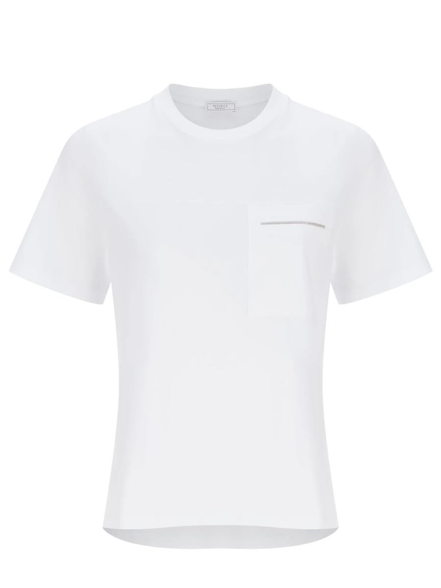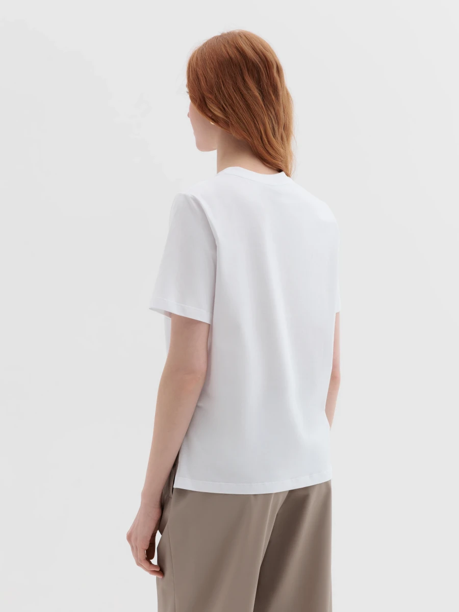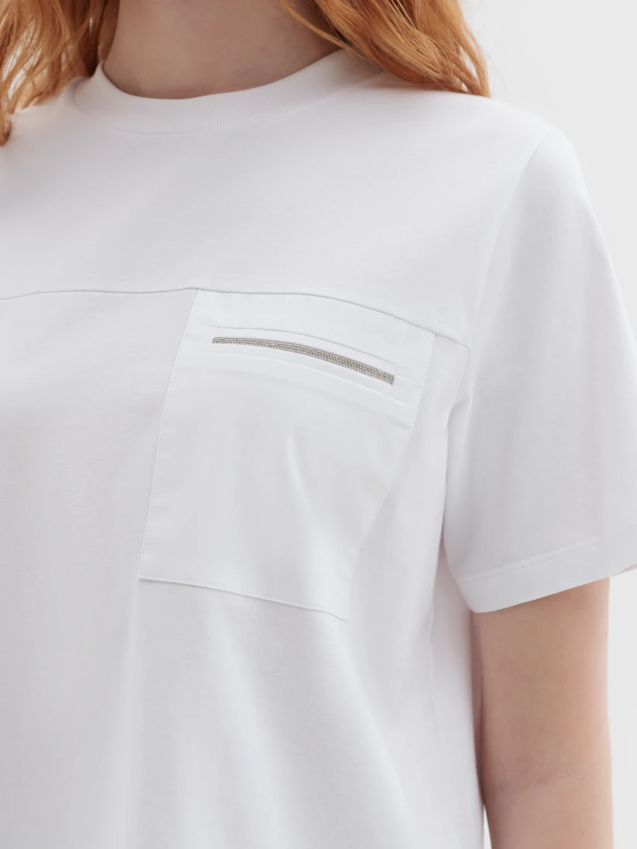 Эта футболка — образец безупречного минимализма, в котором каждая деталь продумана до мелочей. Прямой, слегка удлинённый силуэт создаёт ощущение непринуждённой элегантности, мягко облегая фигуру и не сковывая движений. Классический круглый вырез горловины выполнен с особой тщательностью: аккуратная обработка края подчёркивает изысканность модели, не отвлекая от общей лаконичности образа. Короткий рукав с мягкими линиями органично дополняет композицию, сохраняя лёгкость и свободу кроя. Особого внимания заслуживает нагрудный карман — лаконичный элемент, который добавляет изделию практичности без ущерба для эстетики. Тонкая декоративная отстрочка на кармане работает как деликатный акцент.