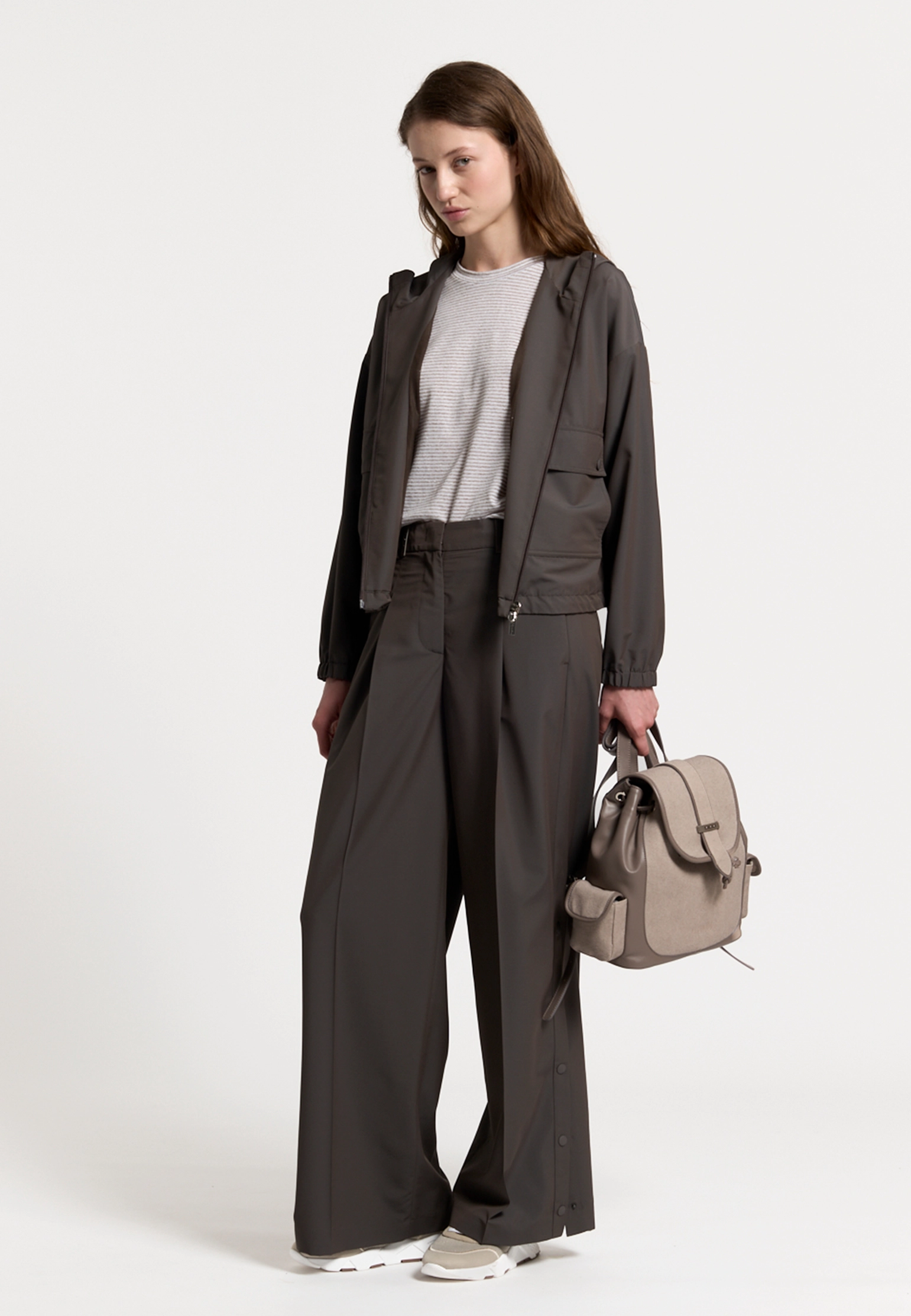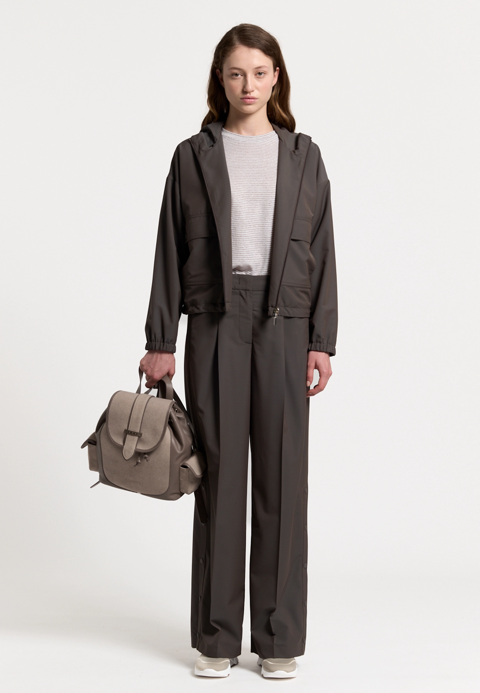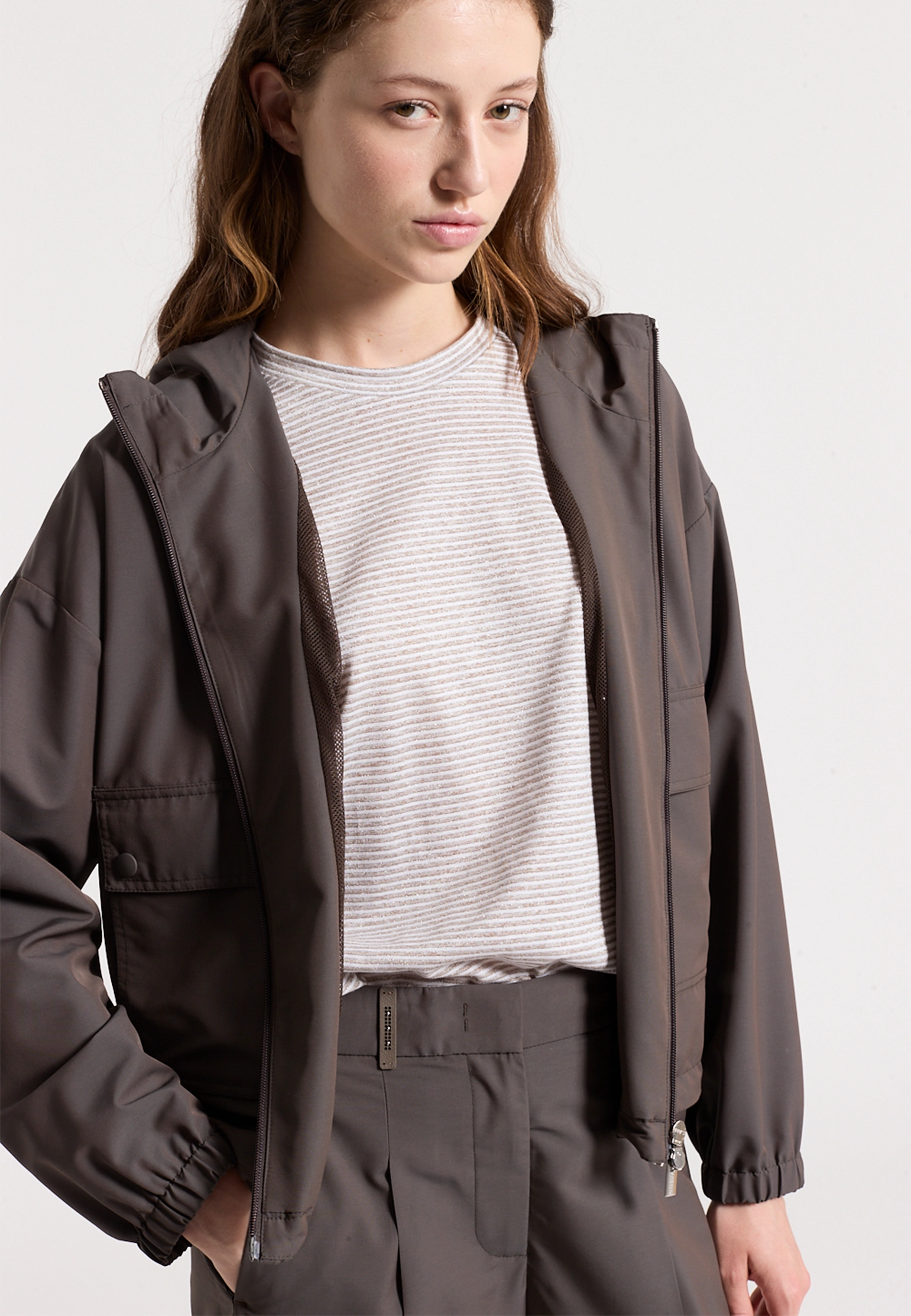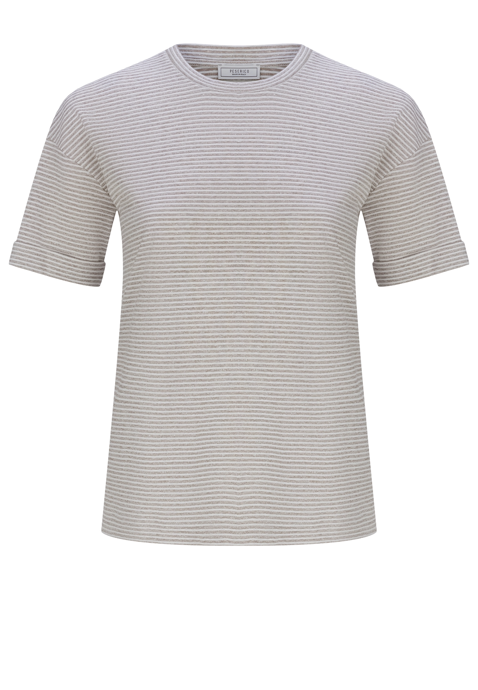 Серо-бежевая футболка Peserico из итальянского джерси на основе хлопка и льна с тонким люрексом в изысканную полоску — это ода casual-роскоши. Полуприталенный силуэт нежно облегает фигуру, подчеркивая грацию. Короткие рукава с отворотами добавляют шарма, круглый вырез дарит свободу и элегантность. Материал дышит, переливается мягким сиянием, идеален для многослойных комплектов с юбками или брюками. Созданная и произведенная в Италии, она шепчет о весенней утонченности, превращая повседневность в haute couture.