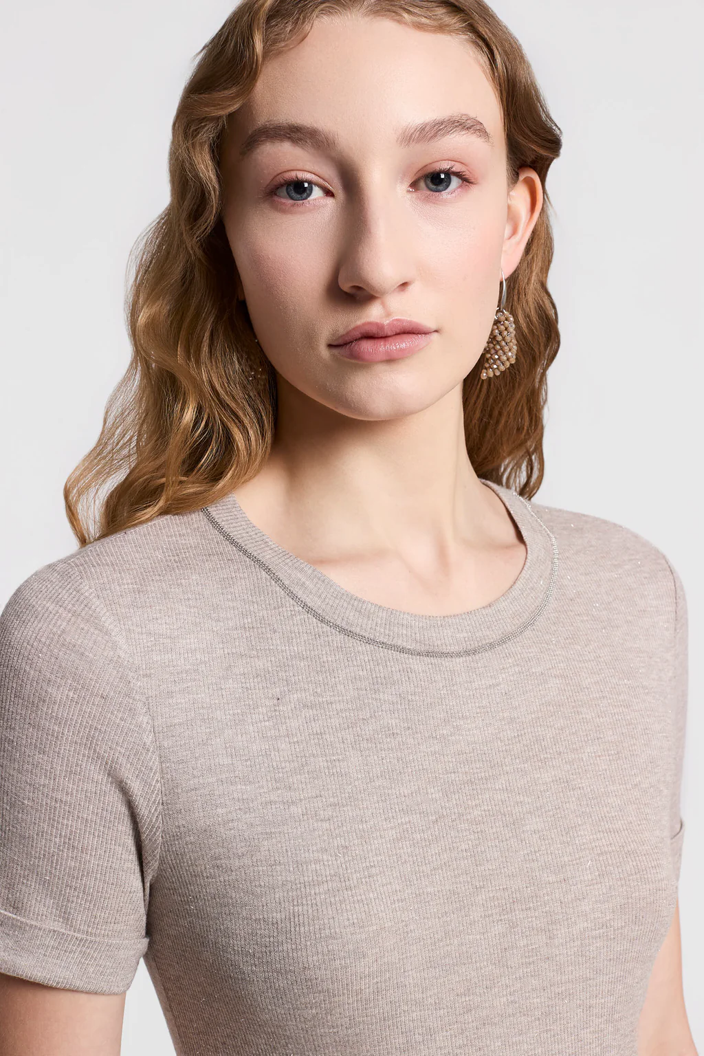 Футболка из микроребристого трикотажа Peserico обновляется для этой коллекции новым волокном Angelina, микроребром из чистого хлопка, украшенным нитью из люрекса, которая создает эффект изысканной серебряной соломы. Тонкая посадка соответствует форме тела, позволяя контрасту между текстурой и металлическим мерцанием появляться естественным образом.