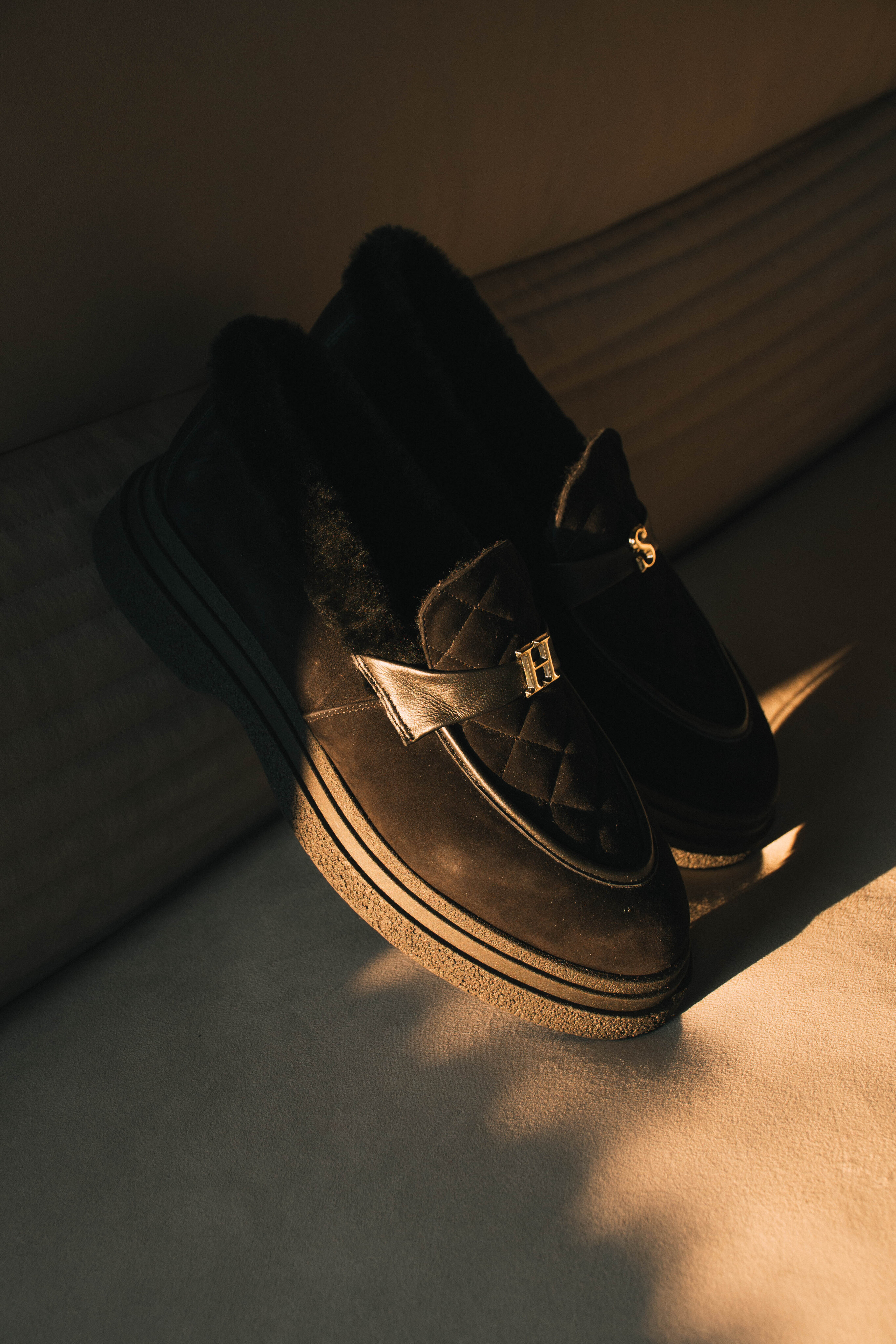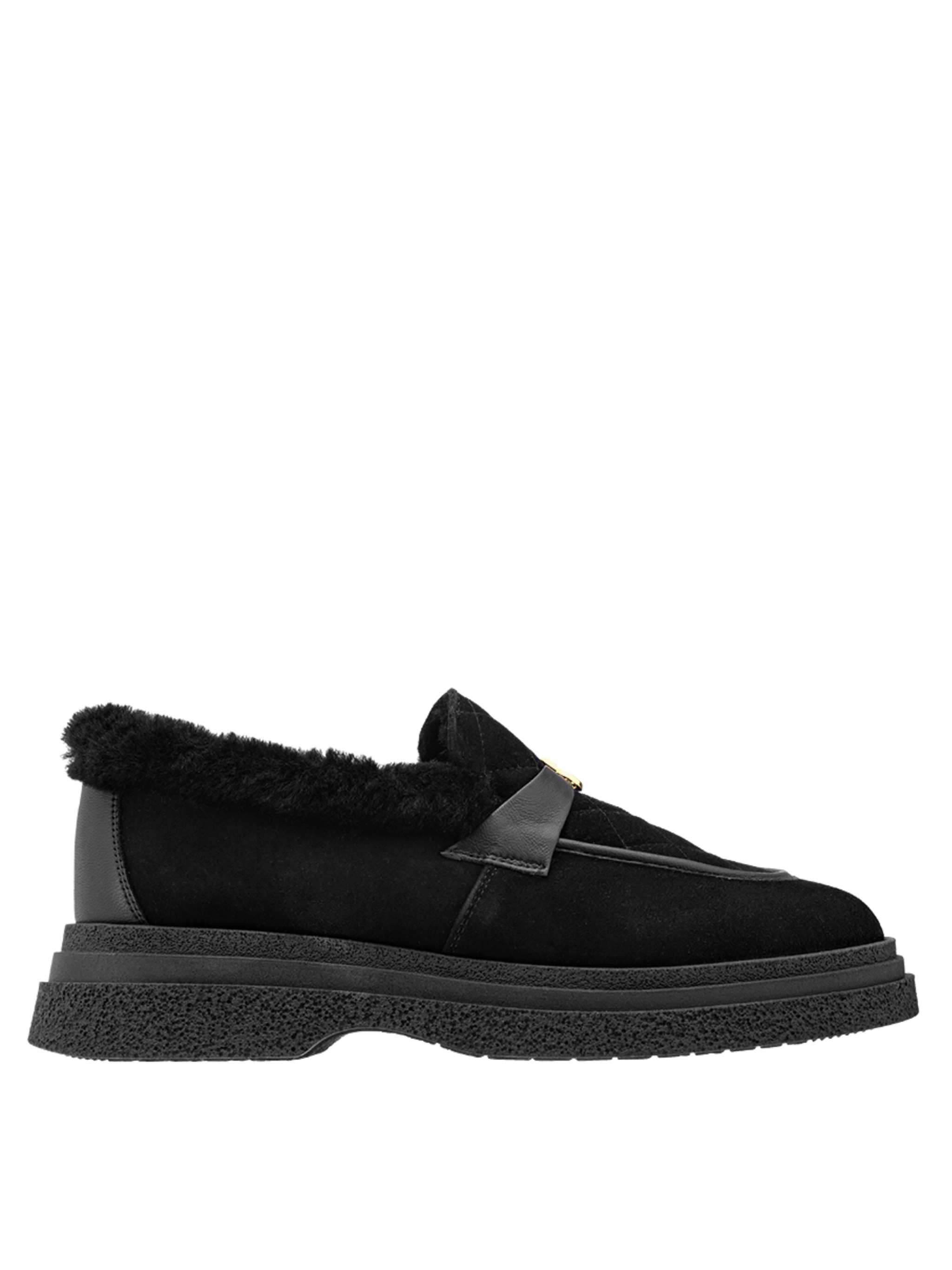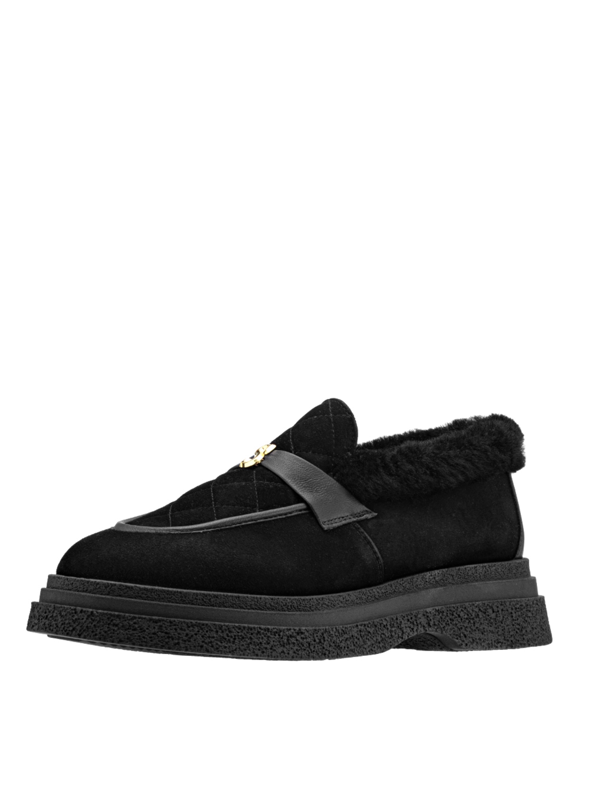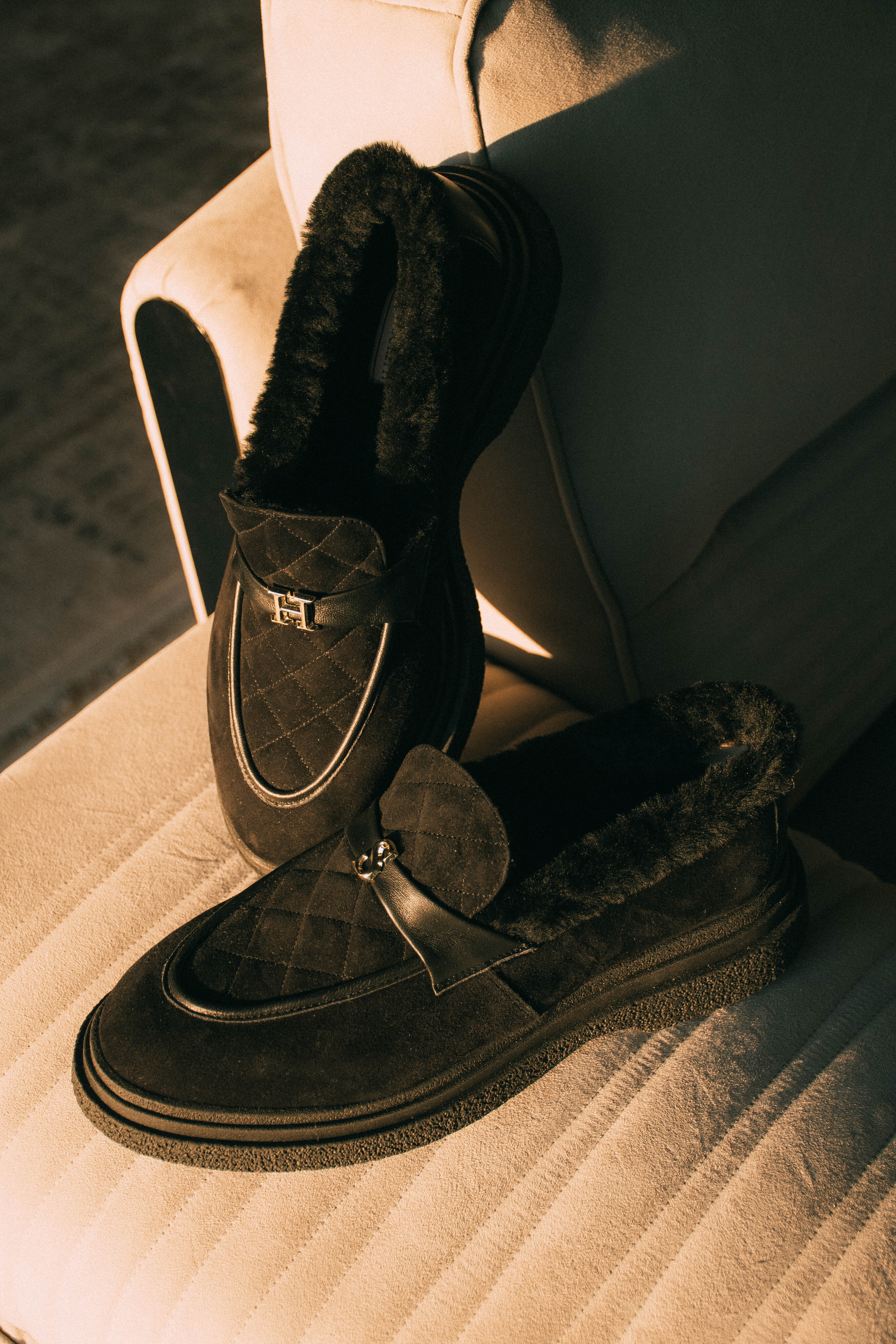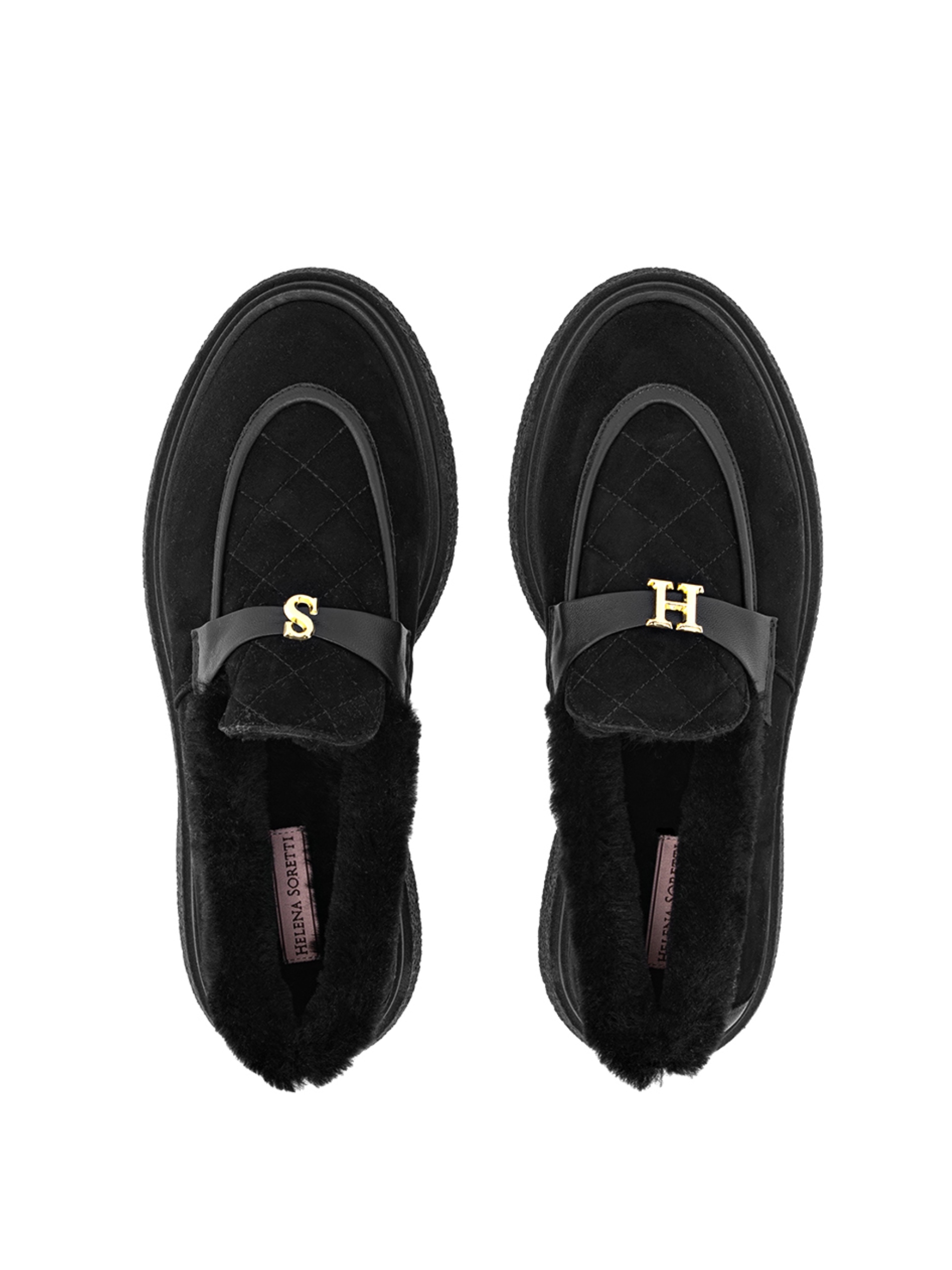 Женские зимние лоферы Helena Soretti из натуральной черной замши на легкой подошве со вспененной прослойкой. Внутри густой белый мех, завершающий стиль. Украшены маленьким логотипом – инициалами бренда.