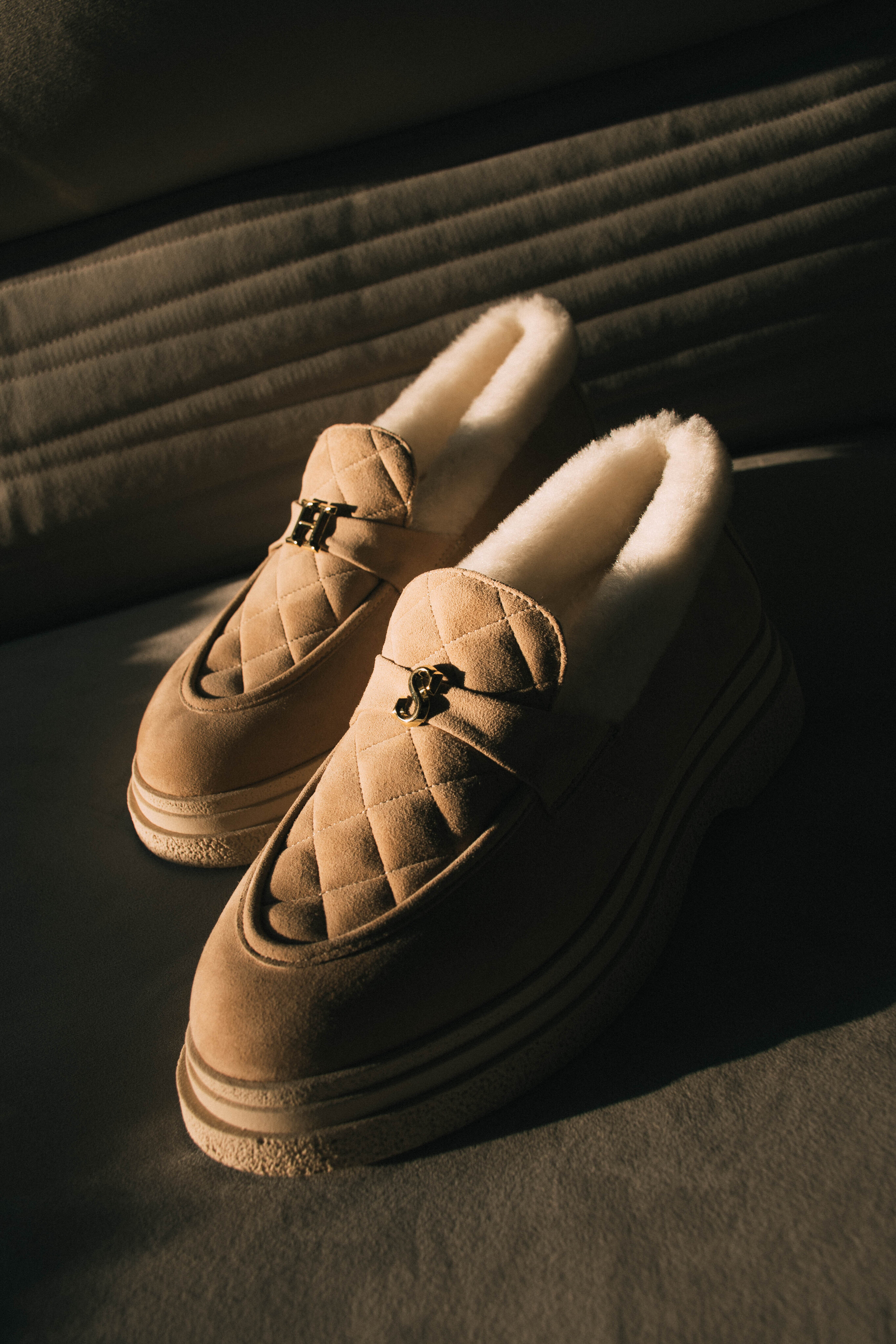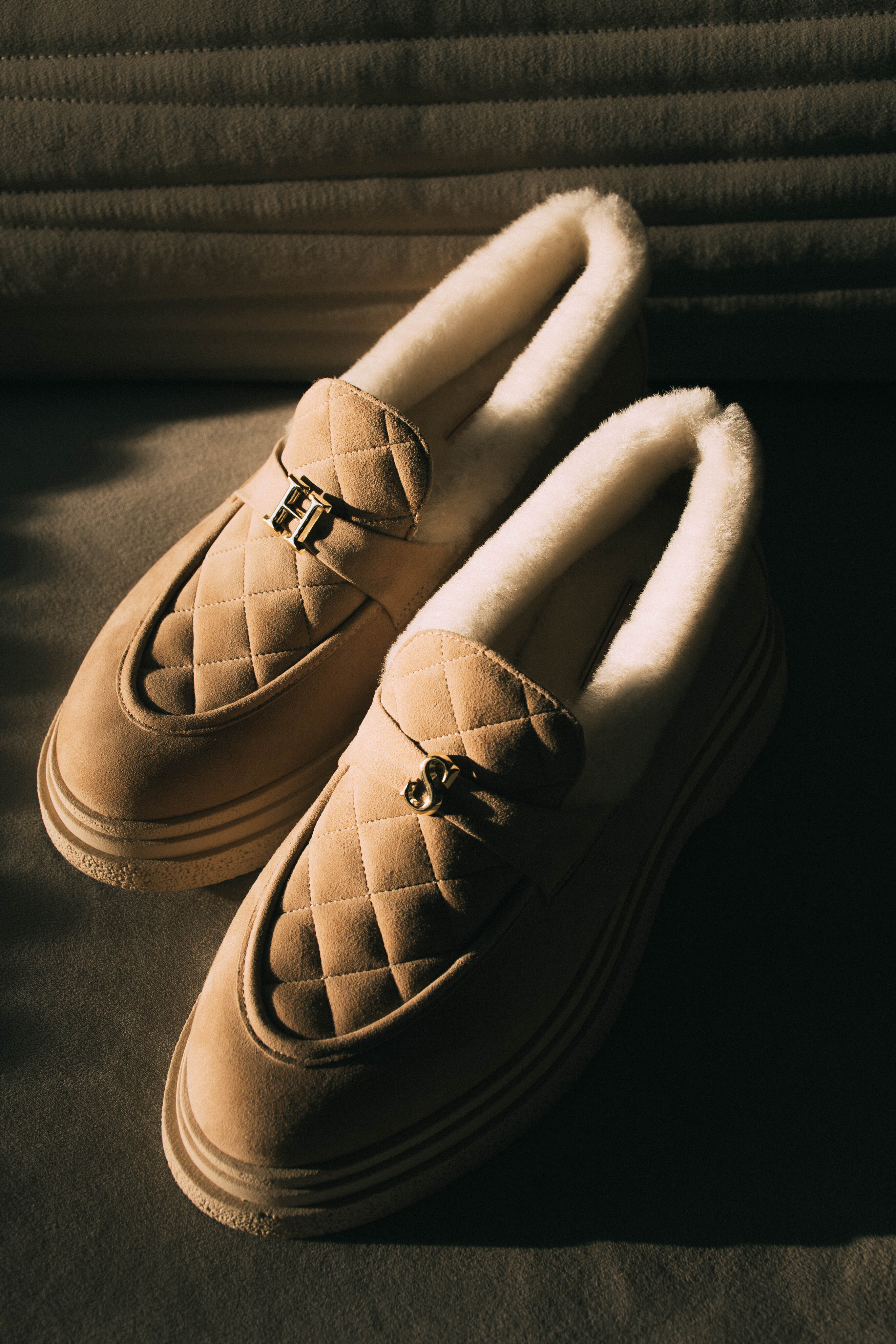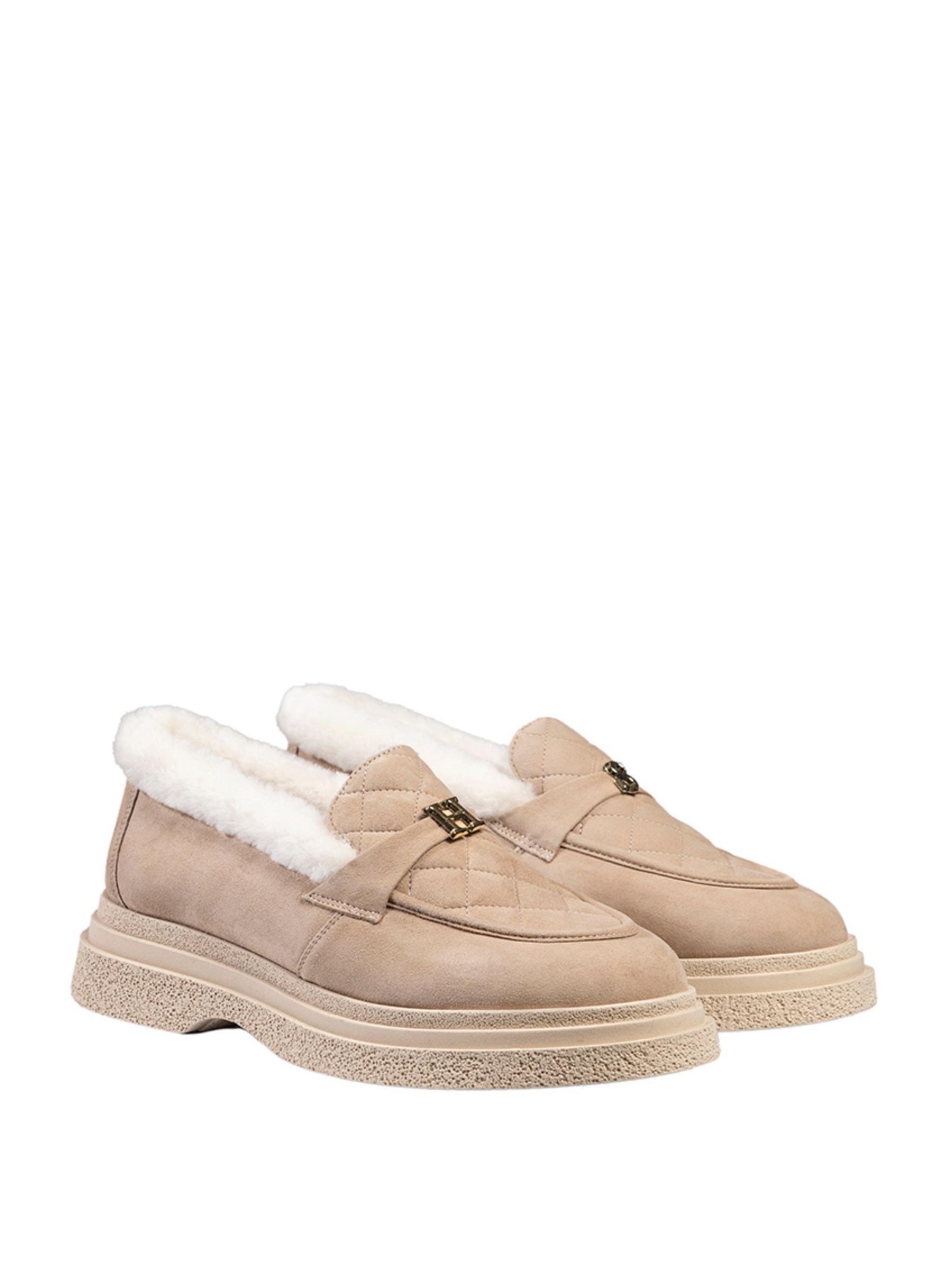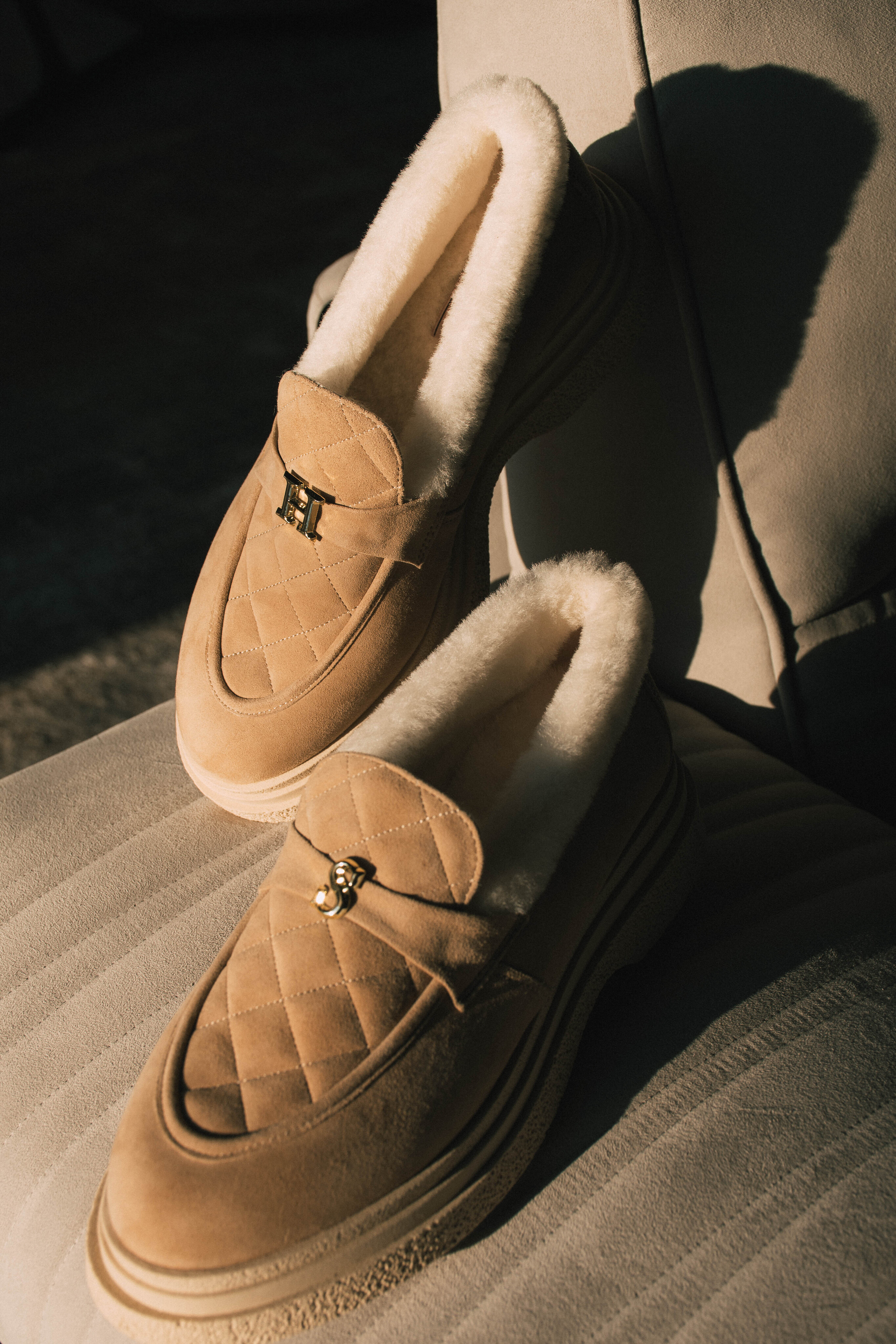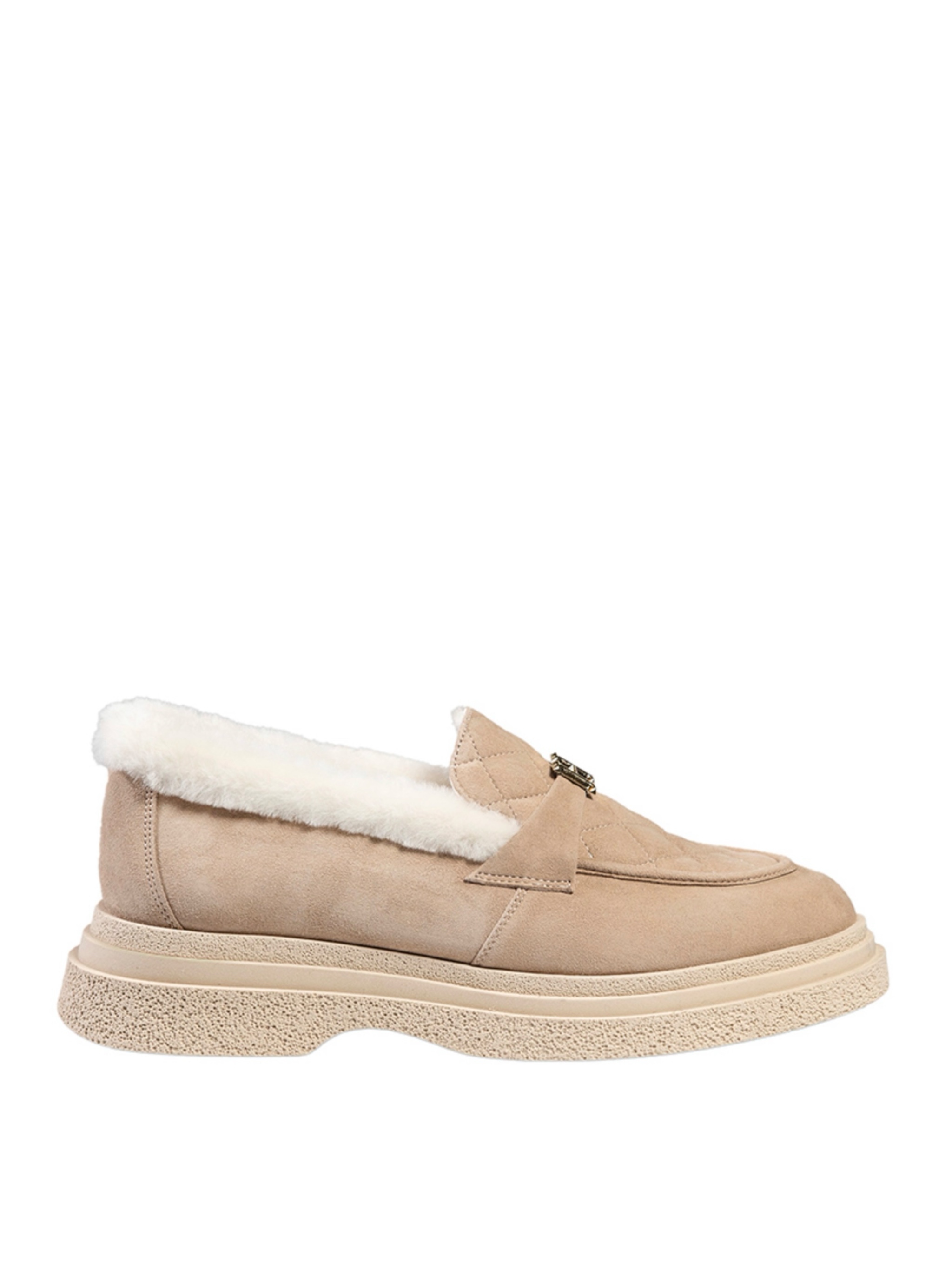 Женские зимние лоферы Helena Soretti из натуральной бежевой замши на легкой подошве со вспененной прослойкой. Внутри густой белый мех, завершающий стиль. Украшены маленьким логотипом – инициалами бренда.