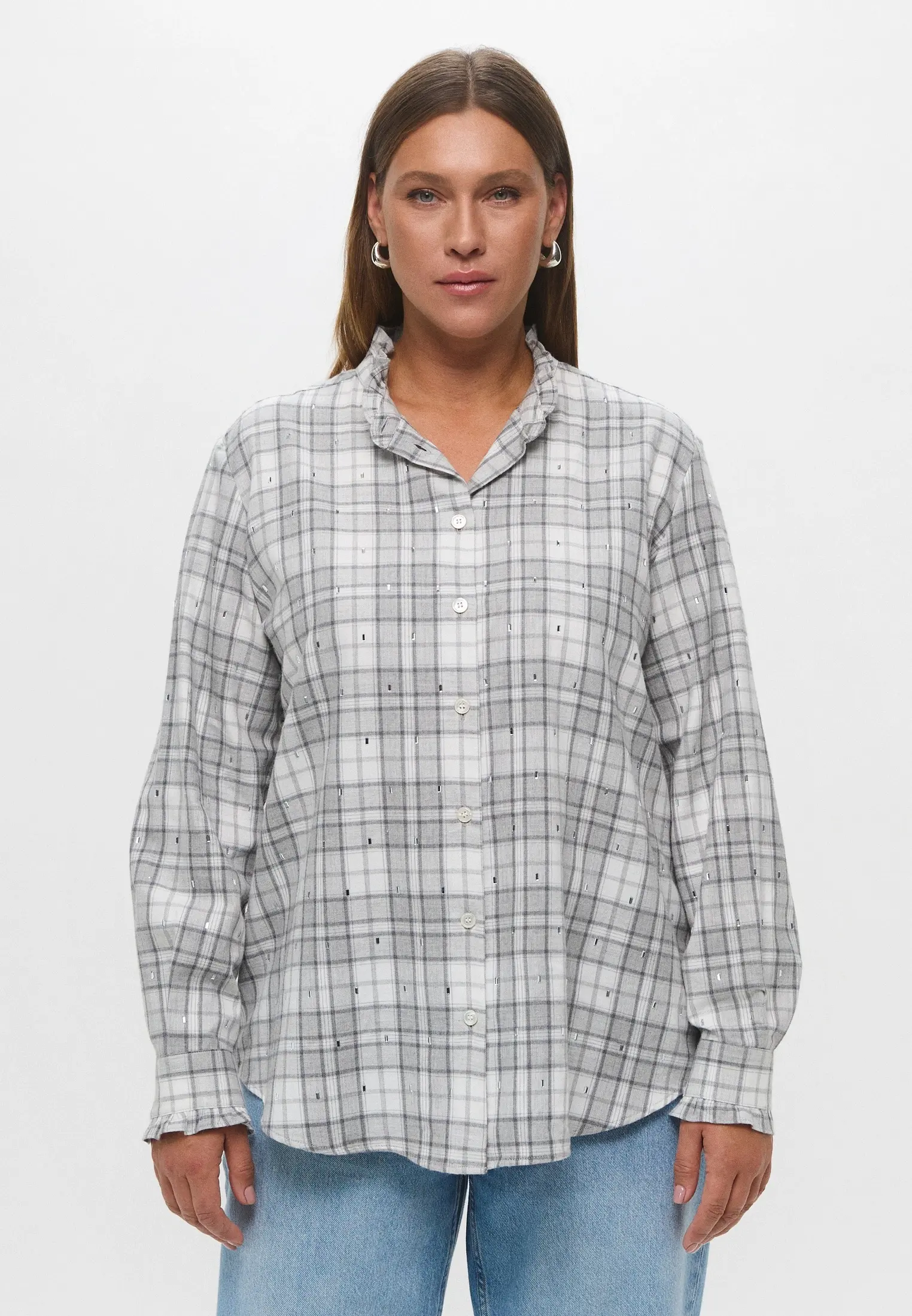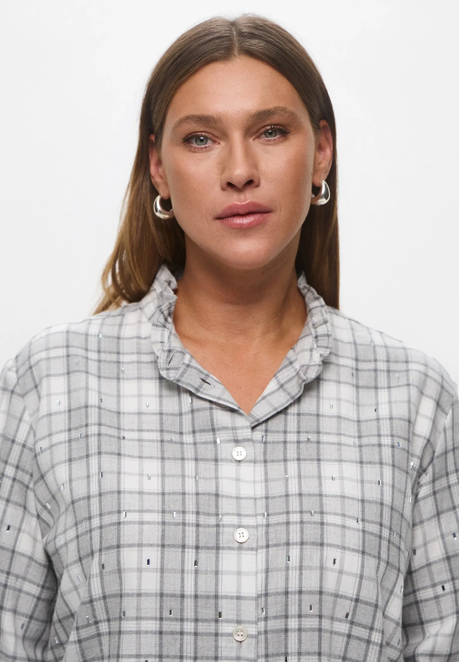 Комбинированная рубашка MOSELLA из хлопка от дизайнеров Marina Rinaldi. Помимо активной клетки с несколькими оттенками серого цвета она отличается романтичными оборками на манжетах и россыпью блестящих декоративных элементов. Предлагаем завершить образ просторными брюками в такой же палитре.