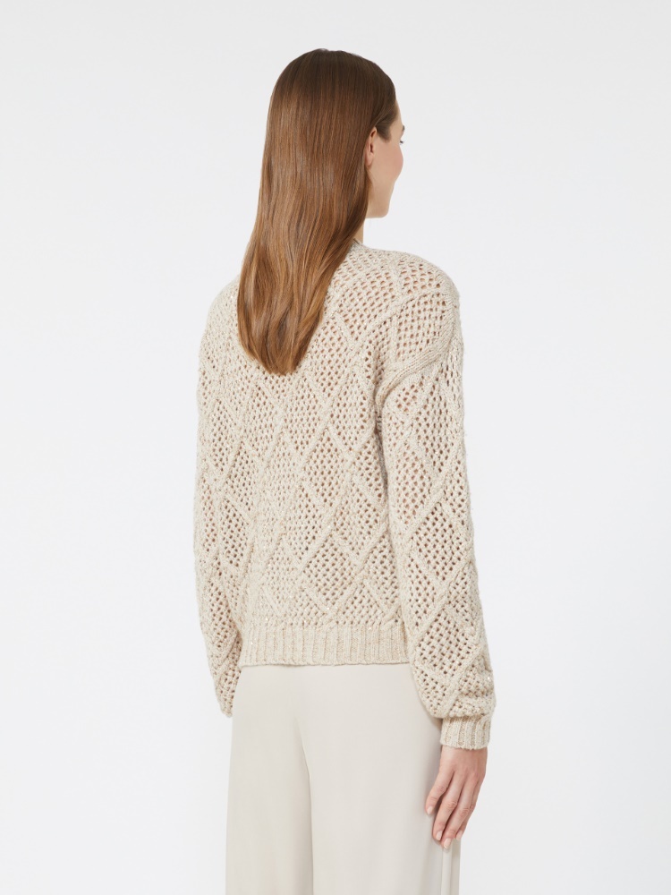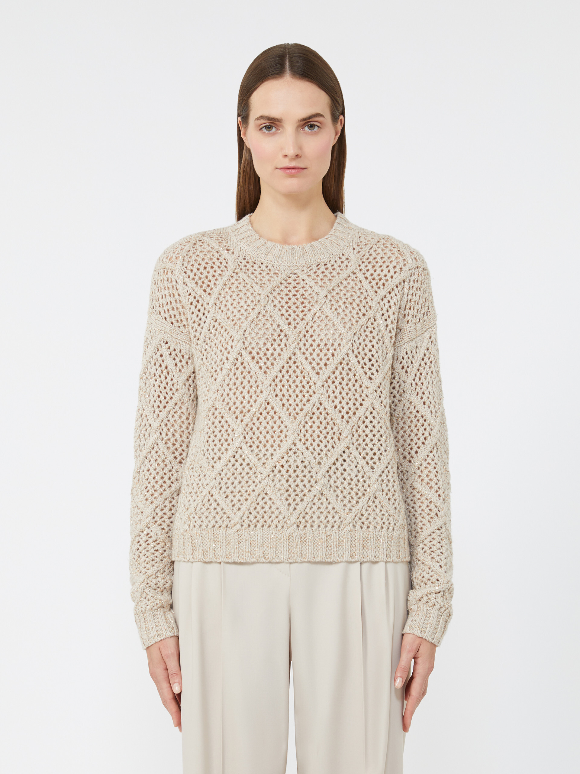 Свитер с круглым вырезом из благородной шерсти и кашемировой пряжи. Силуэт полностью утонченный с вышитыми блестками и придает ему сияющий и изысканный эффект.