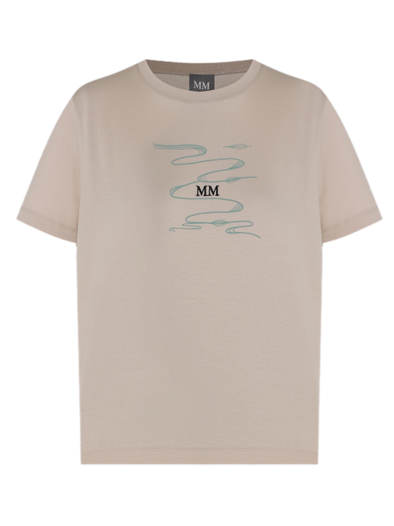 Футболка Max Mara UTA, цвет песочный, 100% хлопок. Лаконичная модель с округлым вырезом и короткими рукавами, выполненная из высококачественного хлопка, обеспечивает комфорт и элегантность. Футболка украшена изящным принтом в виде динамических линий и надписью "MM", что добавляет изделию уникальности и стиля. Стильная и актуальная, эта футболка подчеркивает современный тренд минимализма и универсальности в одежде.