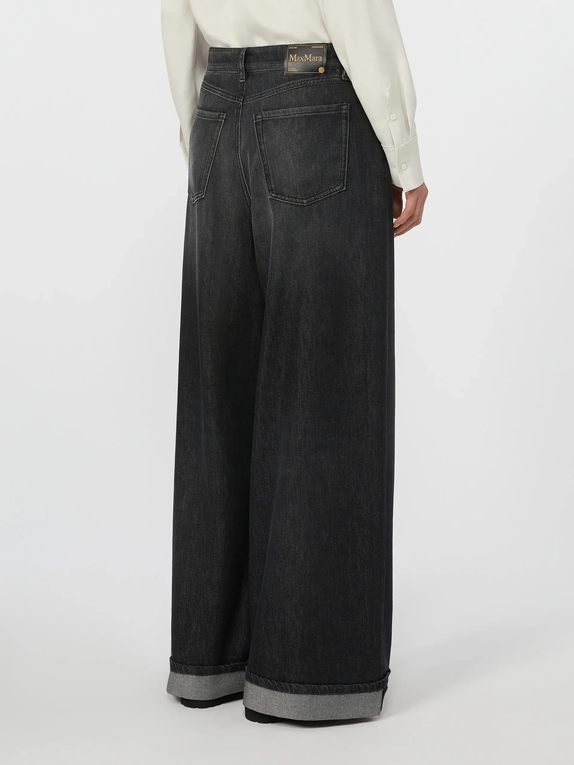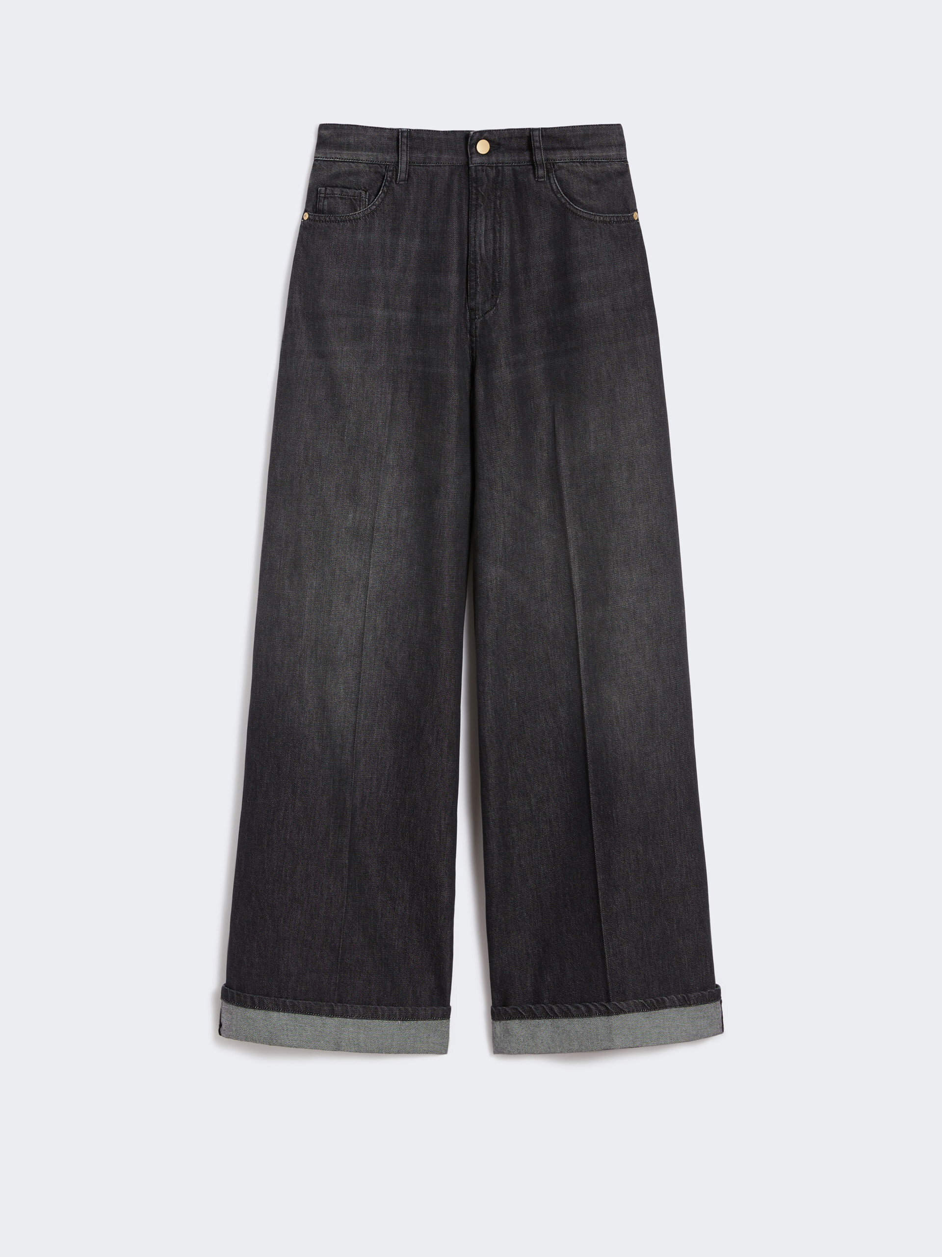 Джинсы в классическом дизайне с пятью карманами и поворотным подолом.