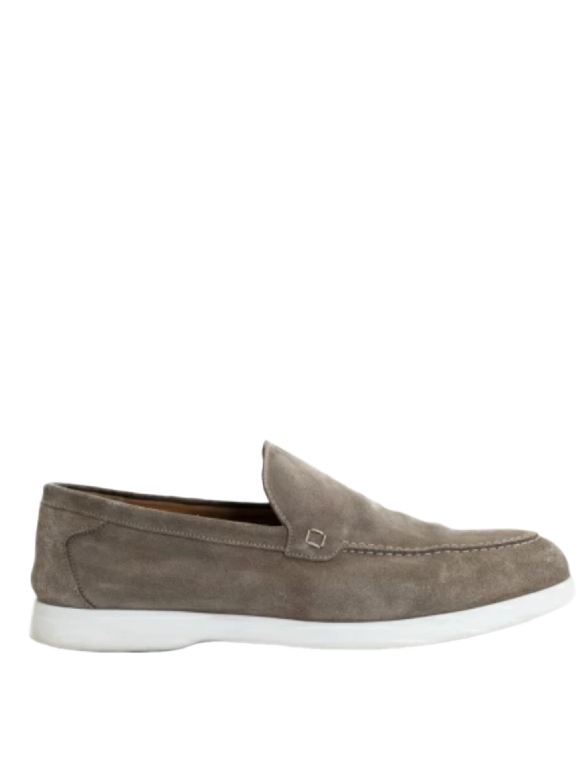 Бежевые замшевые лоферы с белой резиновой подошвой. Комфортный вариант прекрасно впишется в повседневные образы.