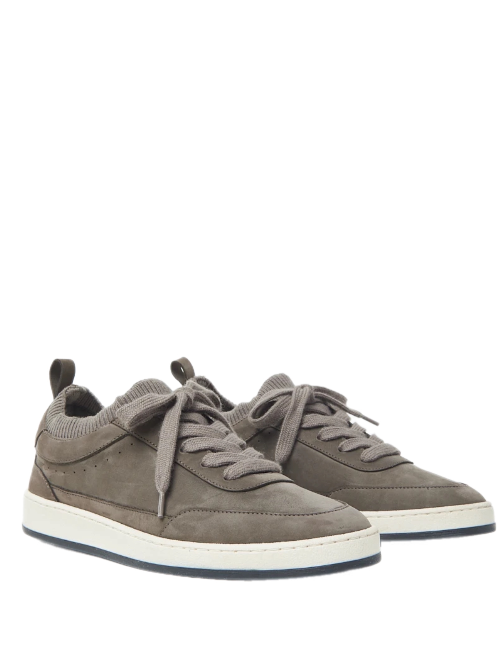 Эти кроссовки выделяются своим современным дизайном и тщательным сочетанием текстур. Верх из воловьей нубука создает решительный, но изысканный образ, в то время как трикотажный воротник и язычок добавляют техническую и современную деталь. Логотип Peserico на пятке придает аксессуару незаметную элегантность. Идеально для городских прогулок, сочетая в себе комфорт, мастерство и отличительный характер.