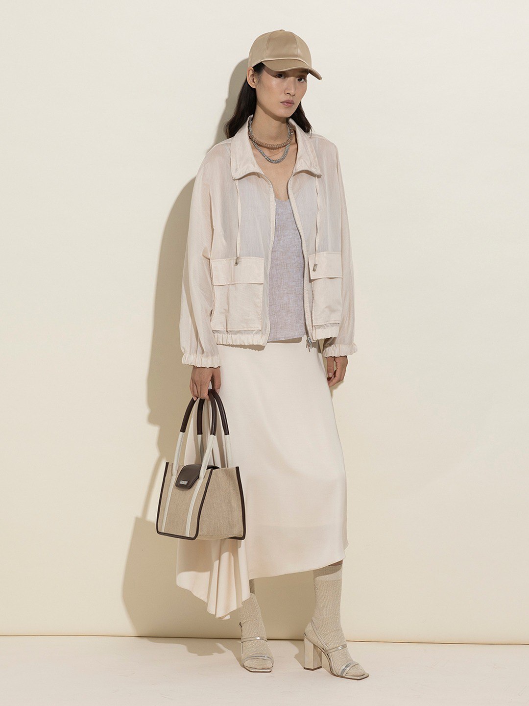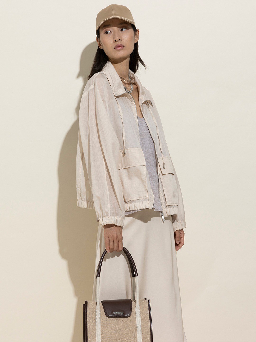 Практичность встречается с городским стилем. Эта куртка без подкладки с воротным вырезом и кулиской подходит для темпа городской жизни. Изготовленный из технической хлопчатобумажной органзы, материал передает ощущение изысканной простоты, с текстурой, которая предлагает уникальный визуальный эффект легкости и тени. Одежда, которая рассказывает историю элегантности.