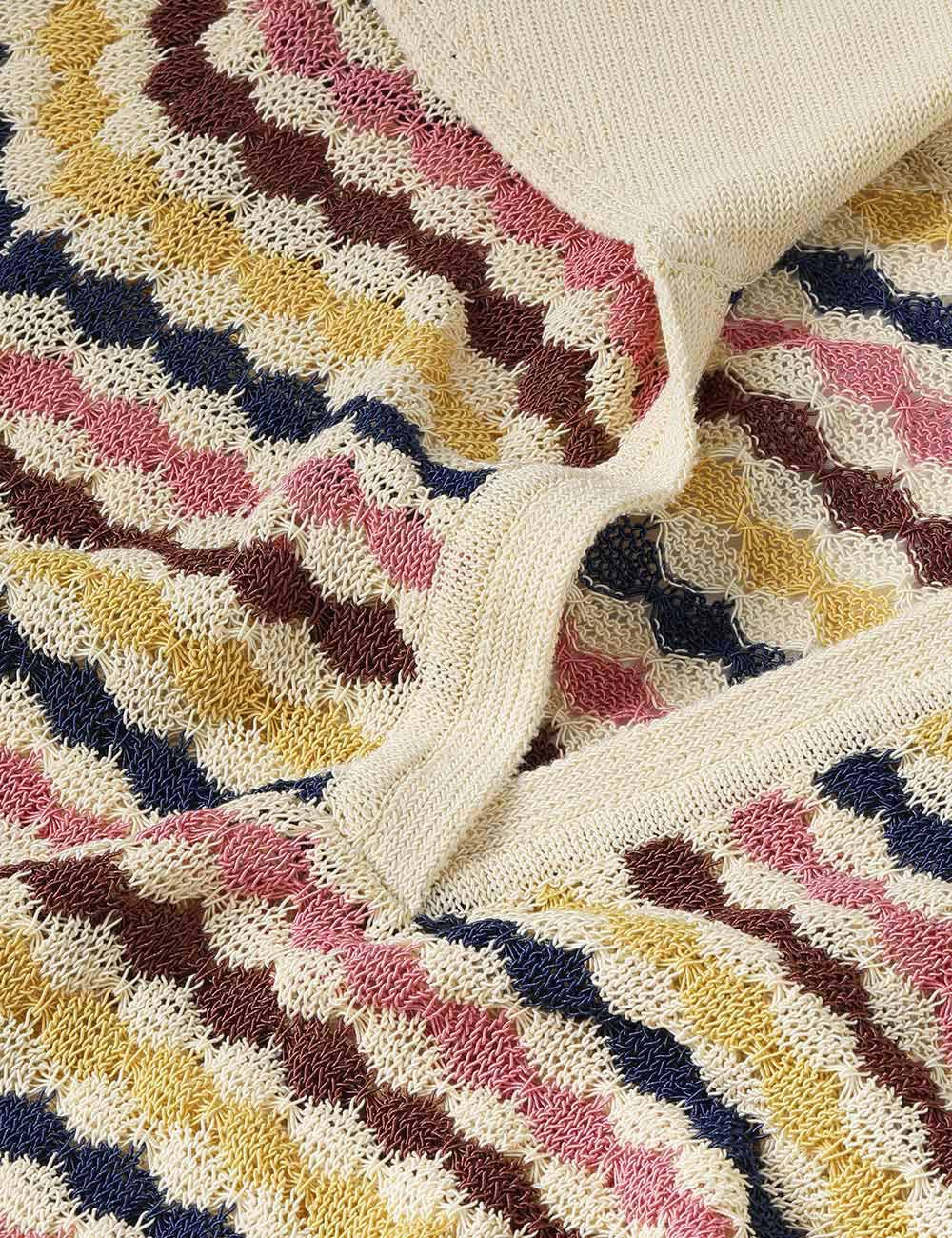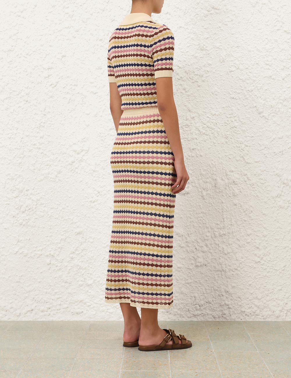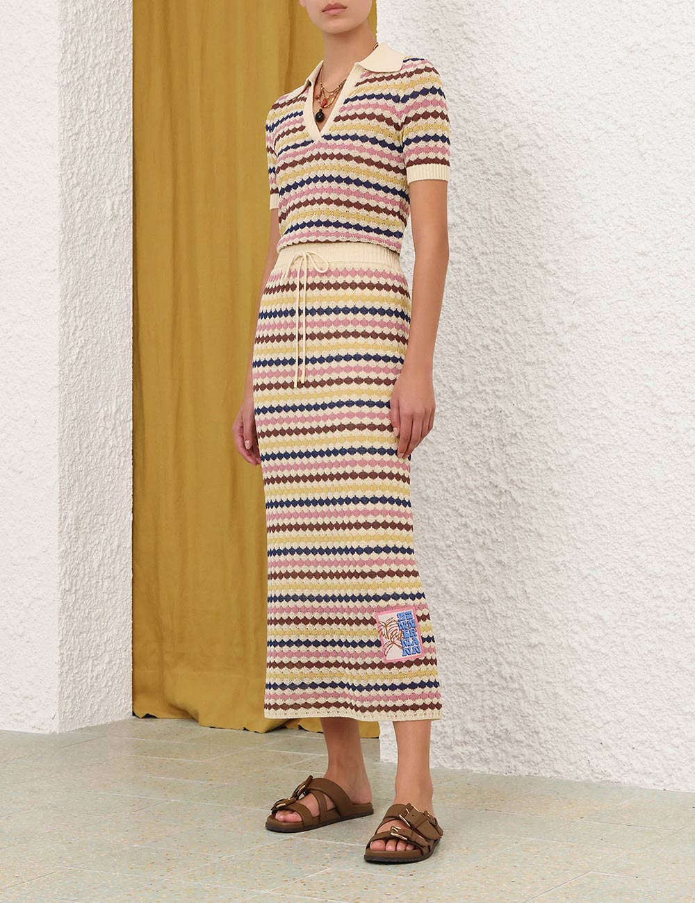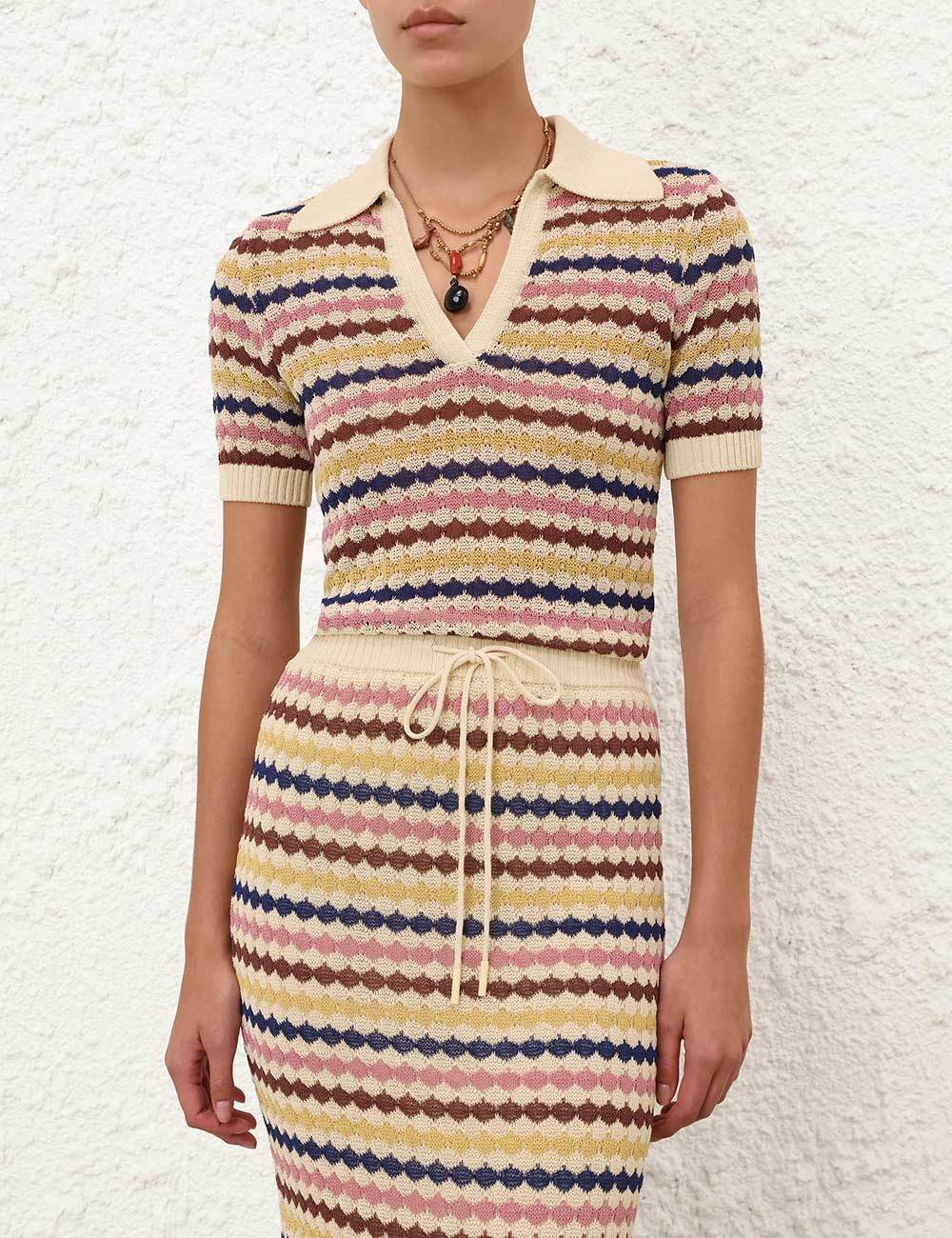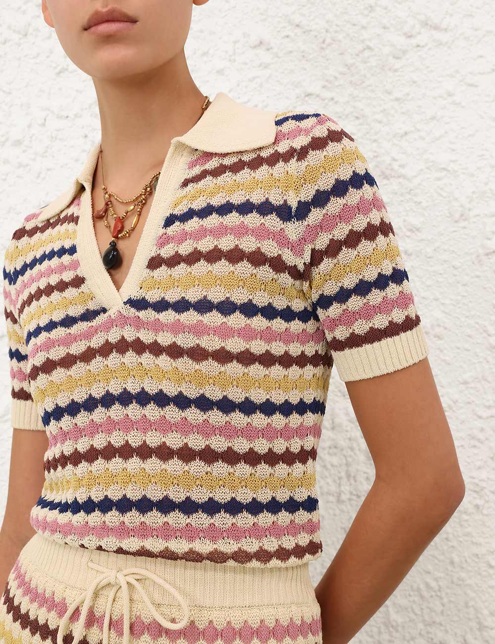 Вязаное поло Awaken Scallop в мультиполосу из нашей коллекции Resort Swim 2026. Вязаный топ с классическим воротником, глубоким V-образным вырезом, отделанным короткими рукавами и удлиненным ребристым подолом.