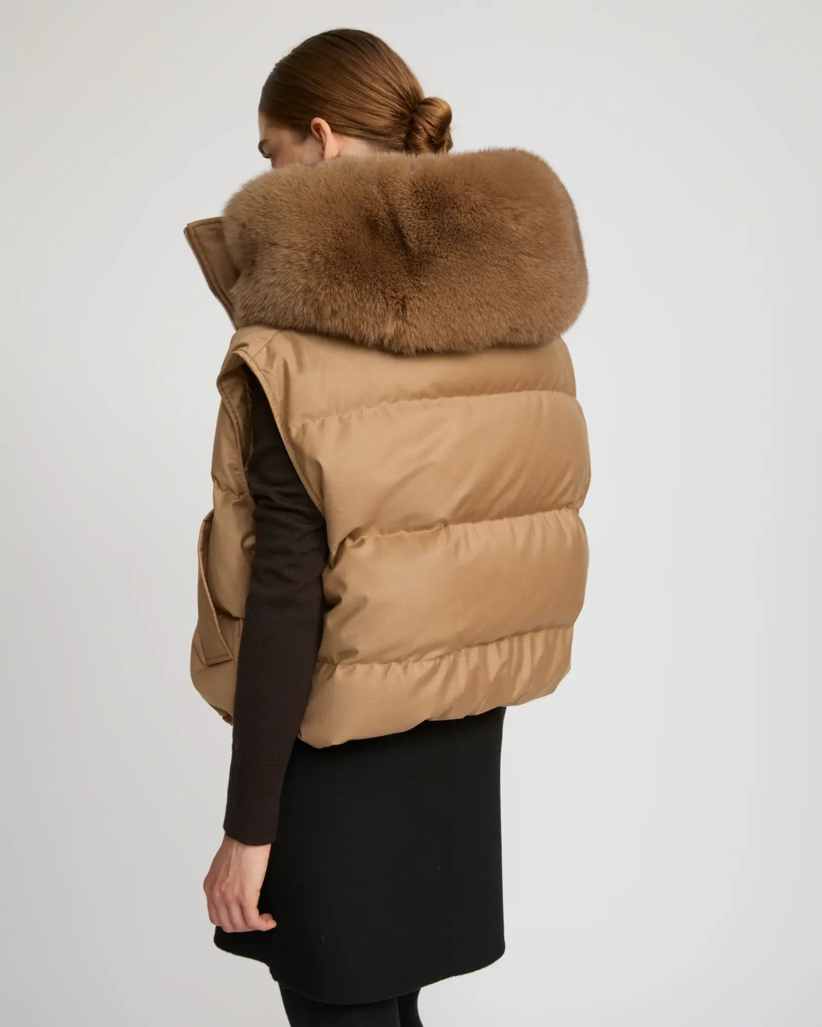 Более короткая, квадратная форма и текстура шерстяно-шелковой фланелевой ткани придают тепло и шик зимним нарядам, независимо от того, носится ли изделие отдельно или поверх куртки или пальто. Воздушный воротник из меха лисы обрамляет лицо, с двумя боковыми карманами, в которые можно поместить руки для дополнительного поза.