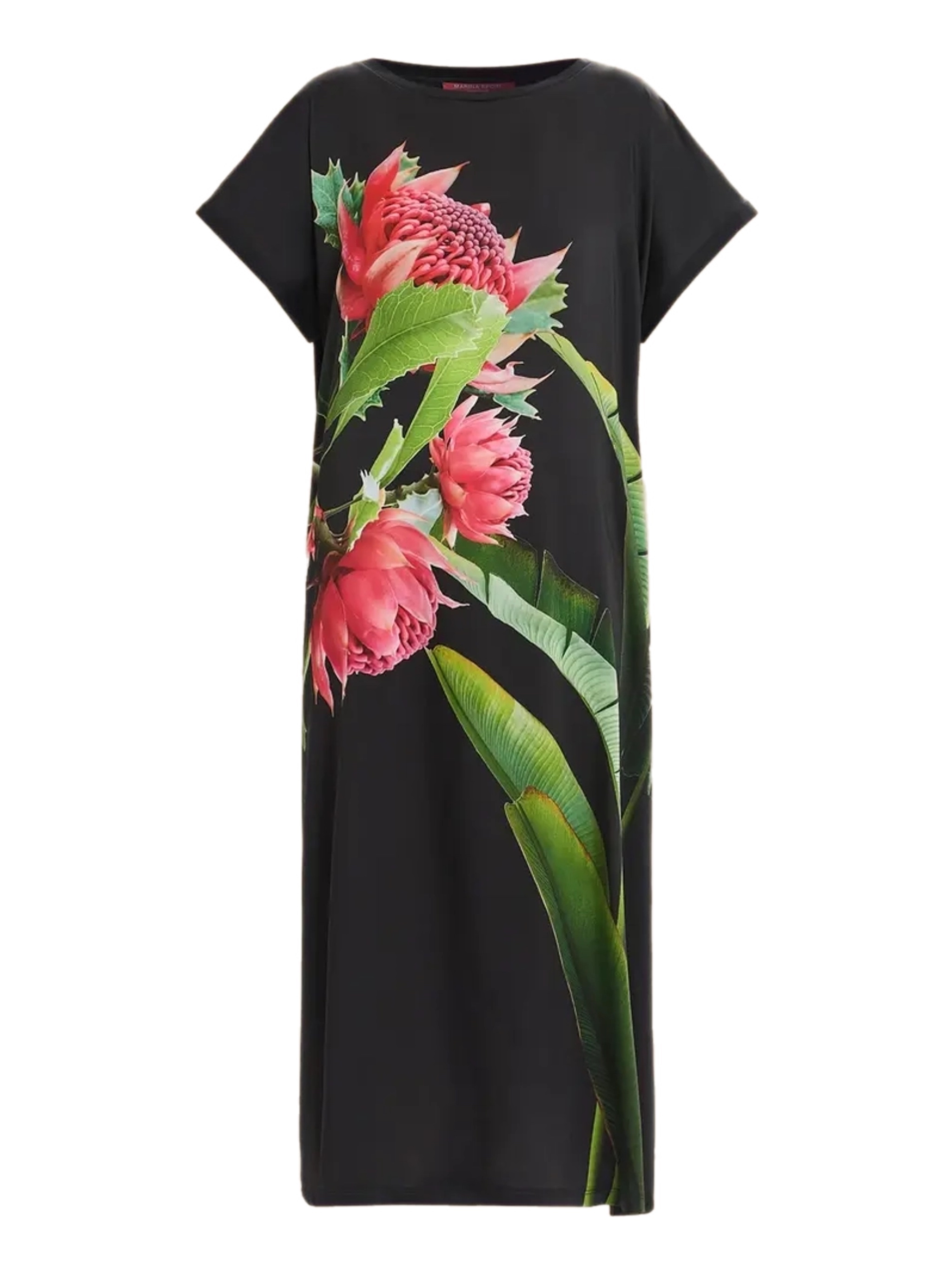 Хлопковое поплиновое платье черного цвета CADINE с эксклюзивным принтом - яркий цветок, свободная и прямая модель платья. Сшито из двух материалов: полиэстера и хлопка.