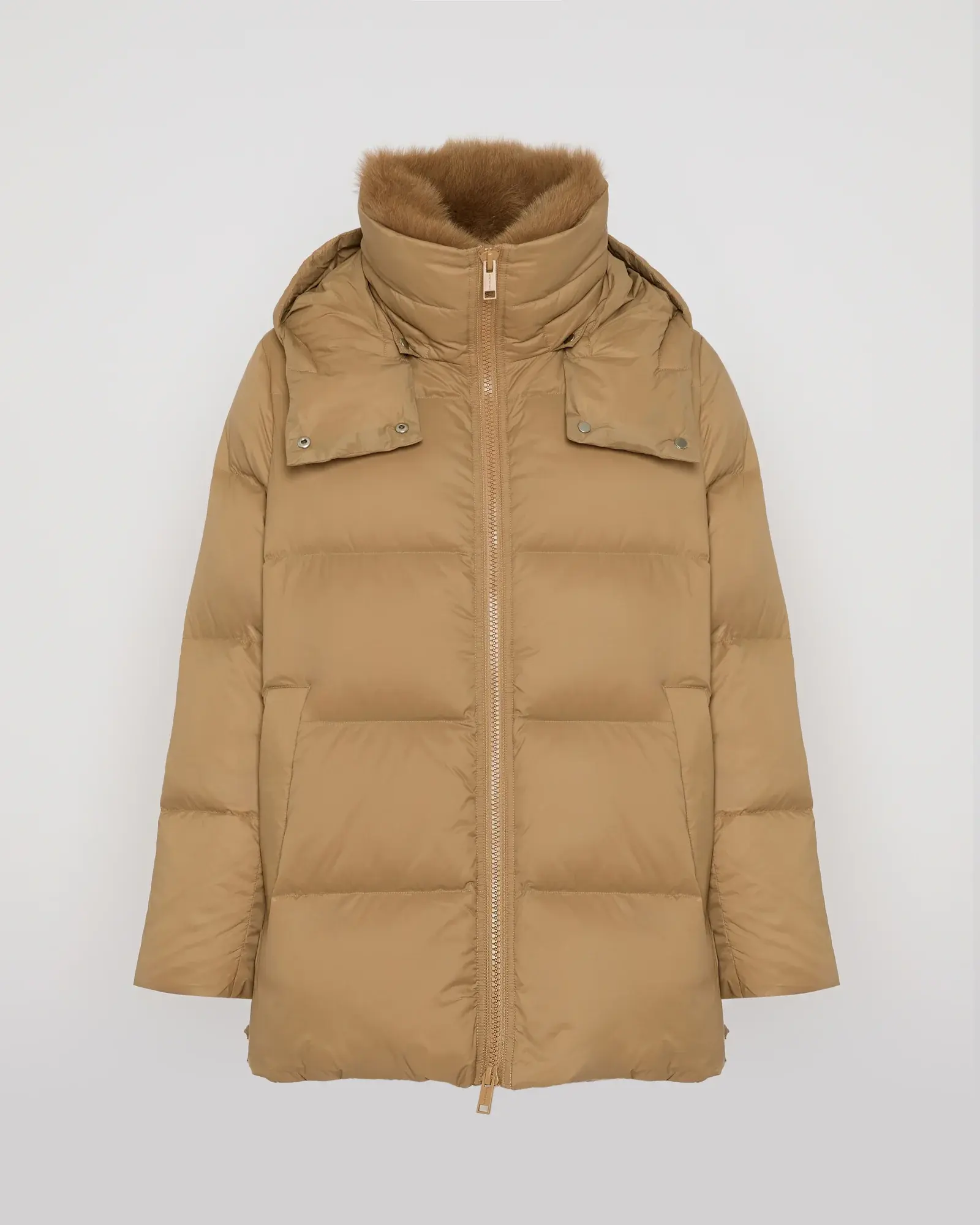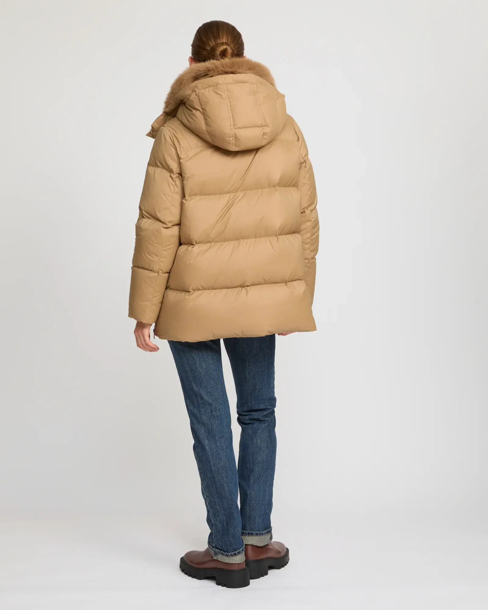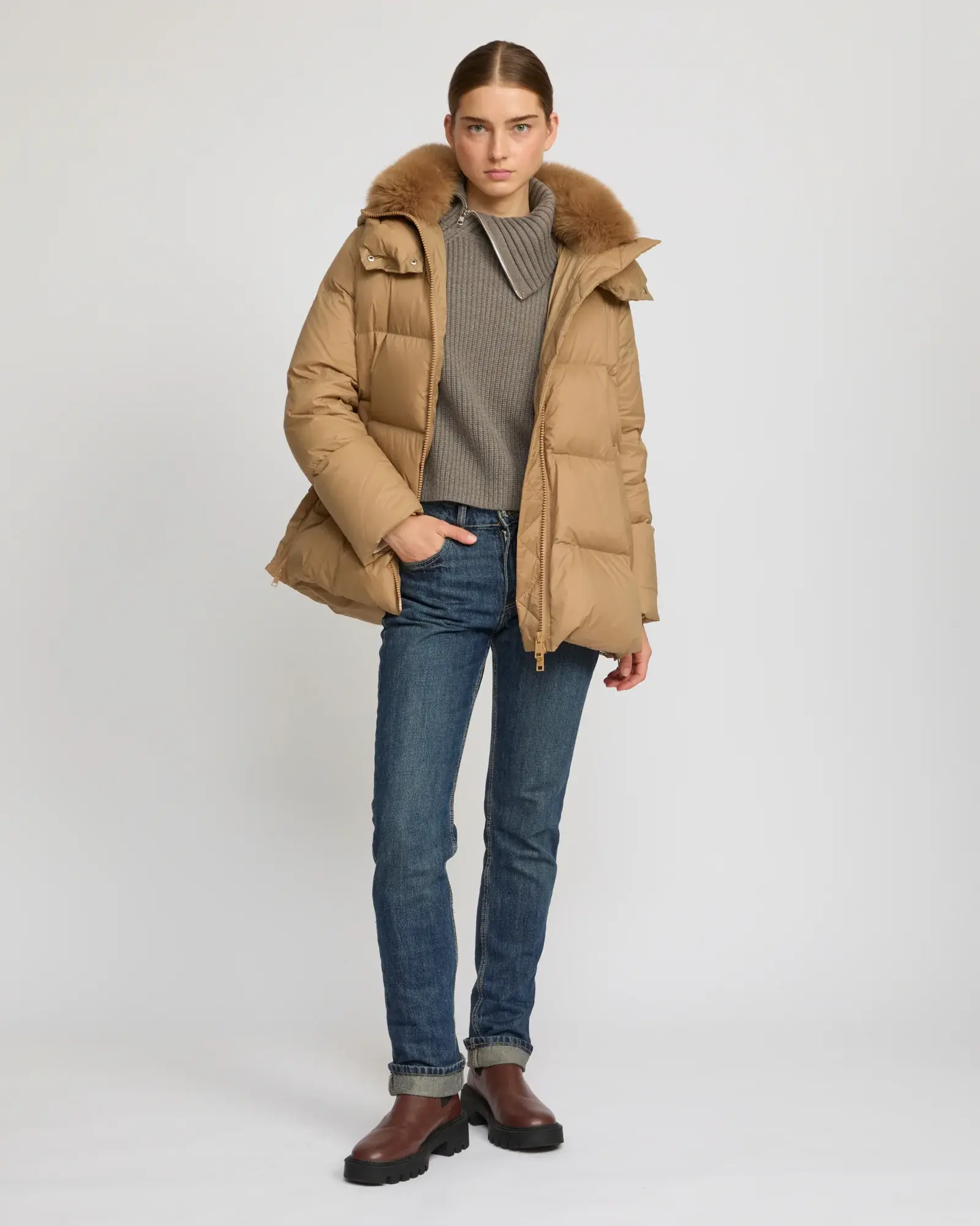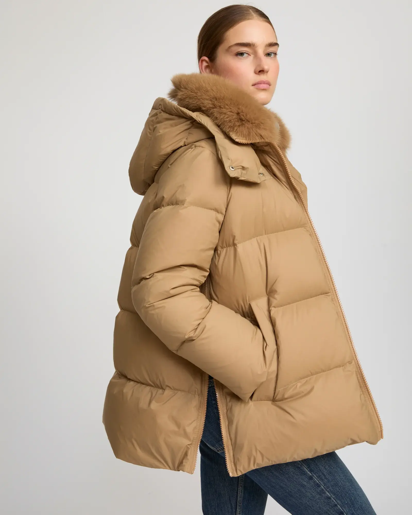 Это культовый пуховик линии "А" имеет высококачественный пух и утиные перья для тепла и воздухопроницаемости. Детали дизайна включают в себя переднюю застежку-молнию, два прорезных кармана и невидимую техническую ребристую отделку на нижних рукавах. Функциональная и легкая в то же время, эта модель имеет боковые прорези на молнии для дополнительной легкости и нотки современности. Эта универсальная пуховая куртка с съемным капюшоном и отделкой со съемным воротником из натуральной лисы сочетает в себе комфорт и элегантность.