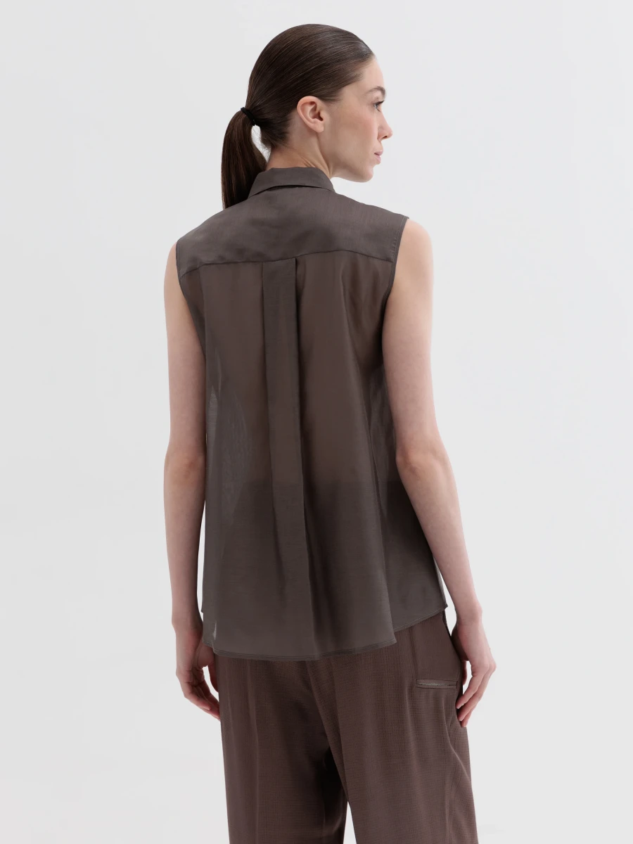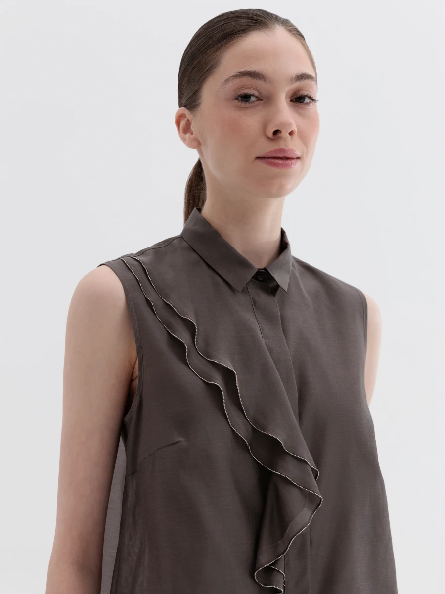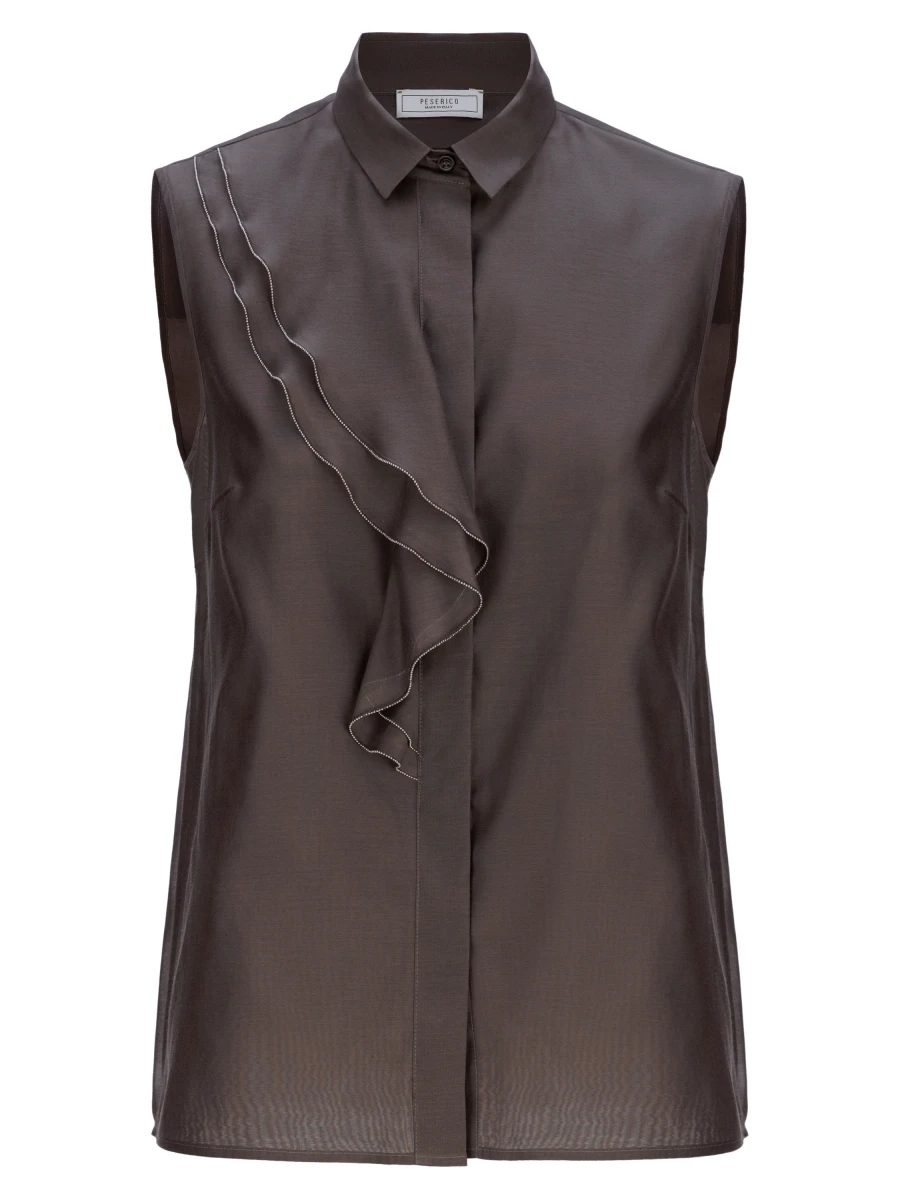 Эта матовая блуза из шелка и хлопковой органзы имеет складки, которые создают характерный узор. Воротник с раздвинутым воротником сохраняет четкую верхнюю линию, в то время как асимметричная рюша спереди делает одежду уникальной. Изделие, предназначенное для превращения органзы в язык форм, движения и ярких деталей.