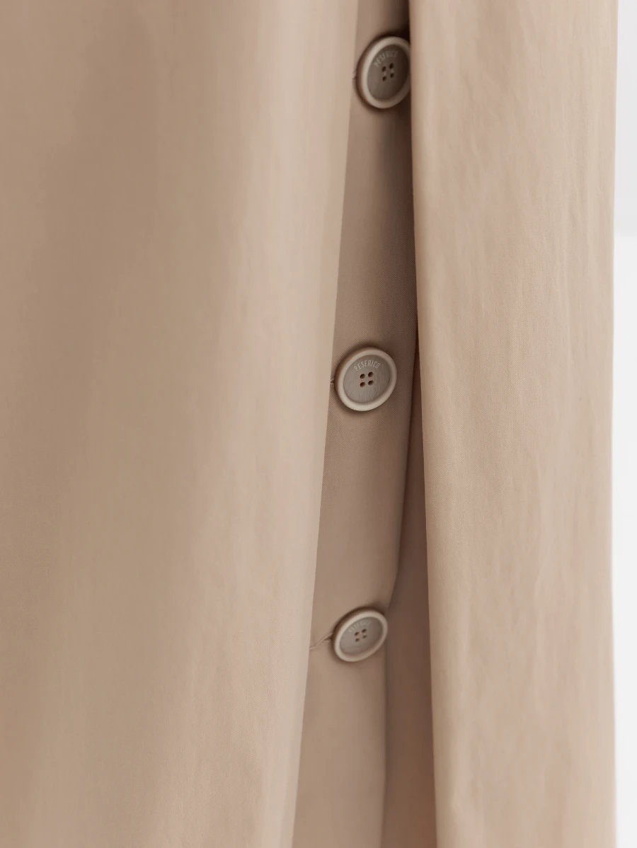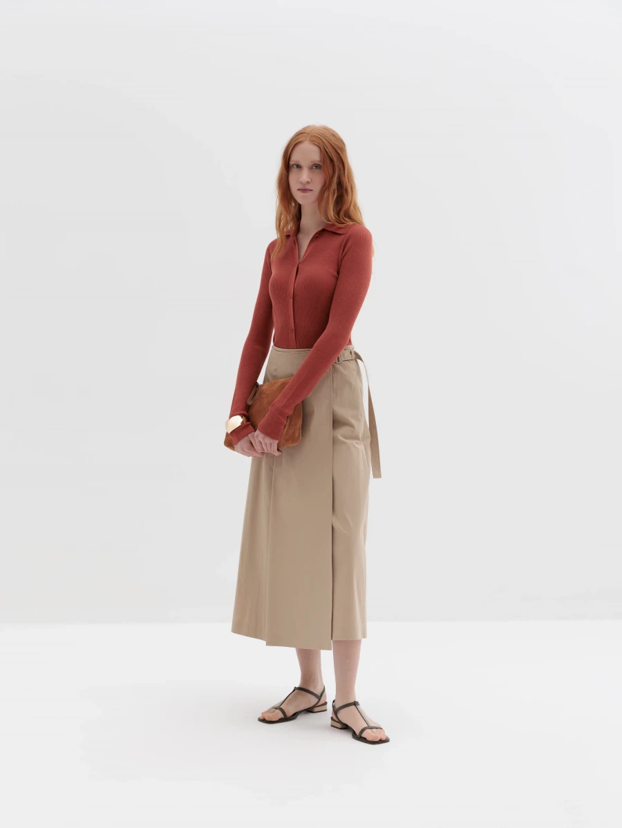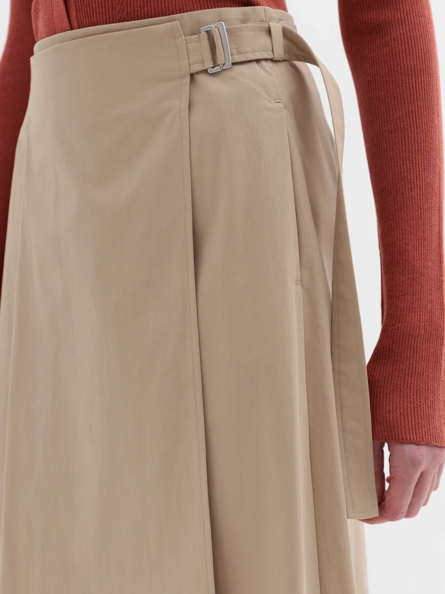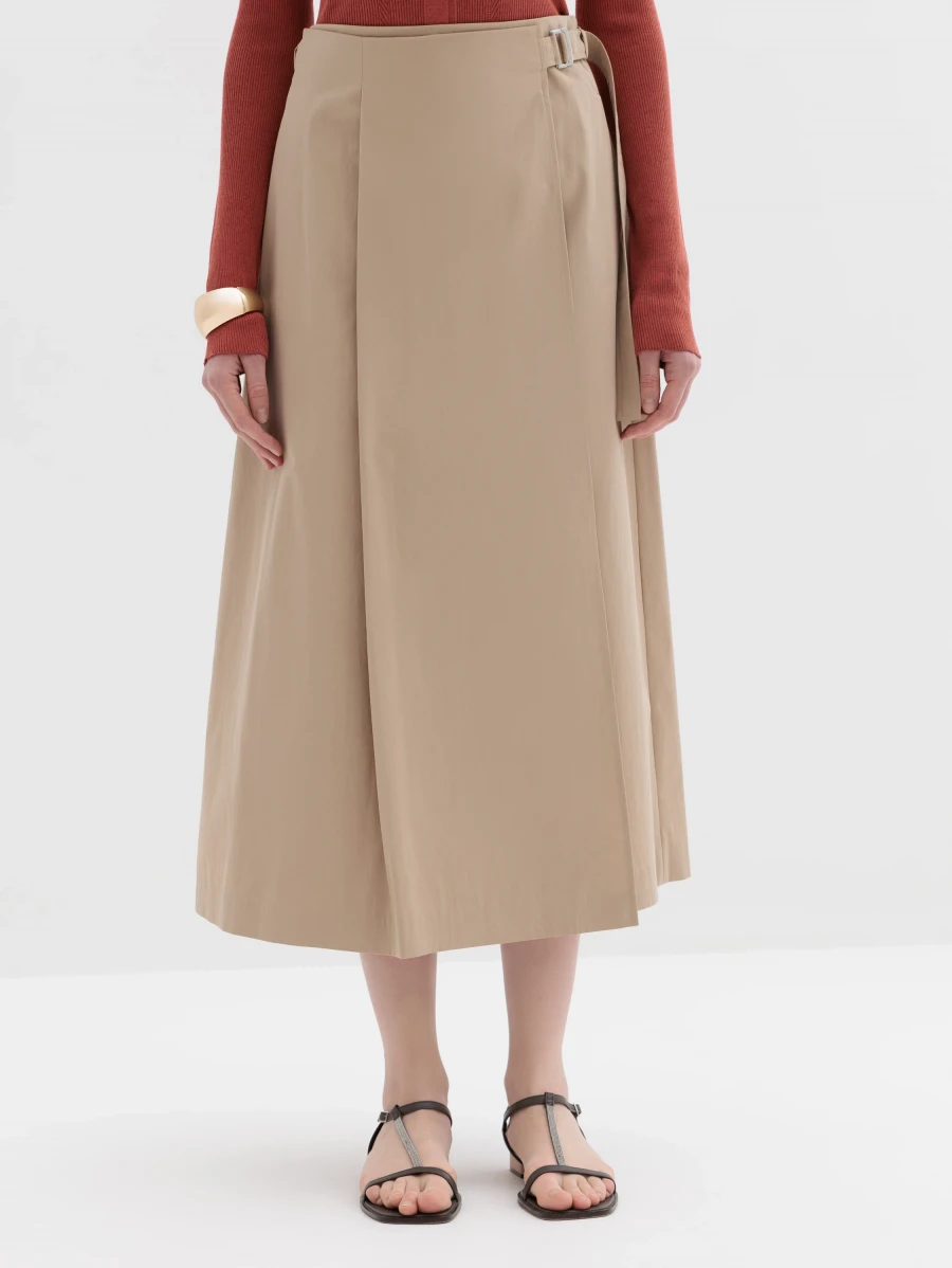 Юбка миди с защитами и хлопка и полиамида. Сзади дополнена пуговицами на кулиске. Спереди модель дополнена запахом, что создает правильные формы фигуры.