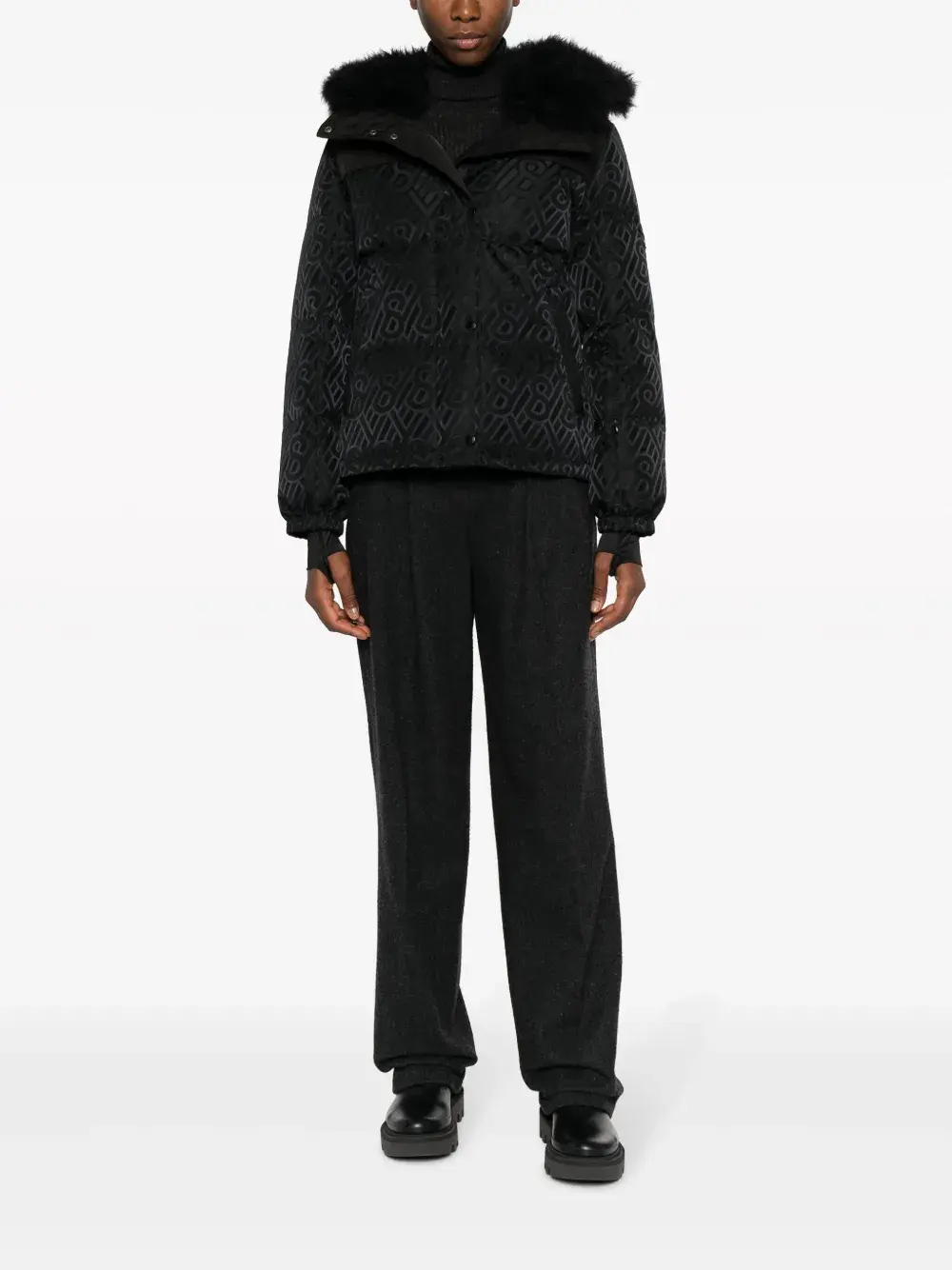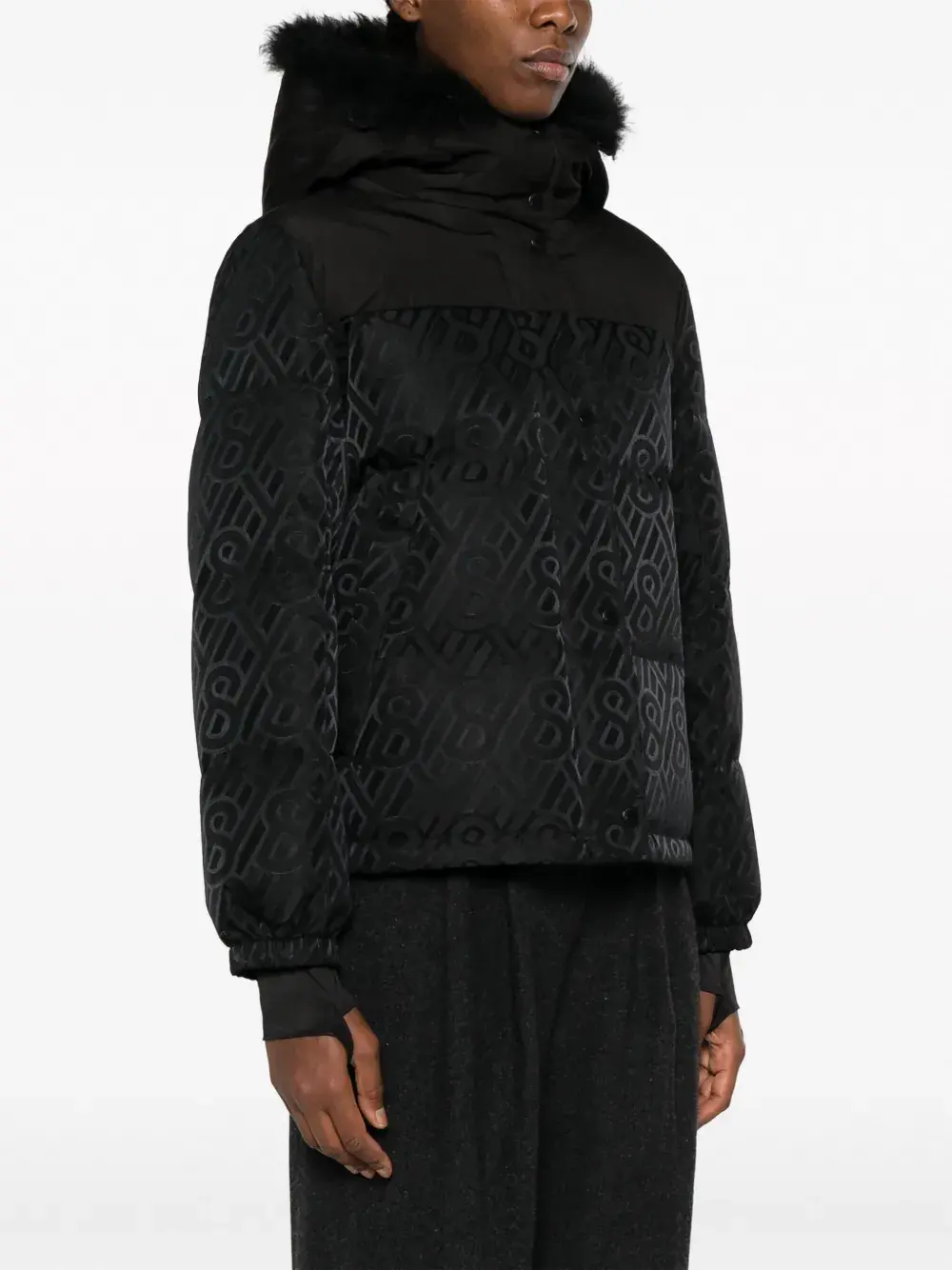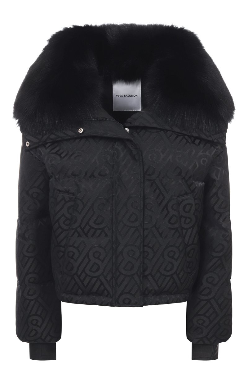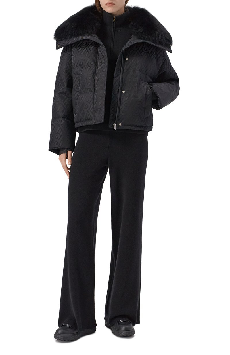 Укороченный пуховик с манжетами-митенками сшили из эластичного полиэстера с фирменным паттерном. Стеганую куртку на утином пуху дополнили врезными боковыми карманами и съемным воротником из меха песца.