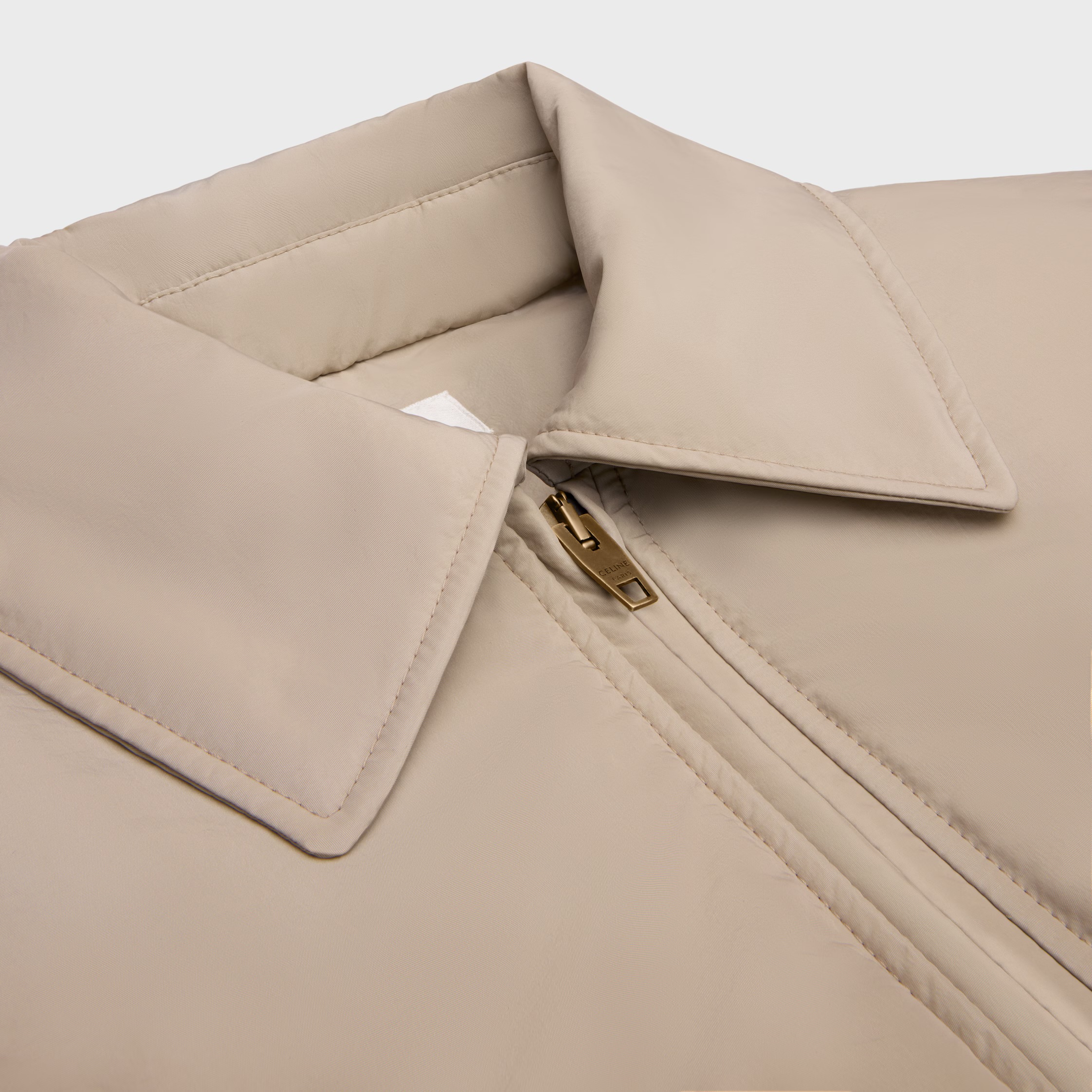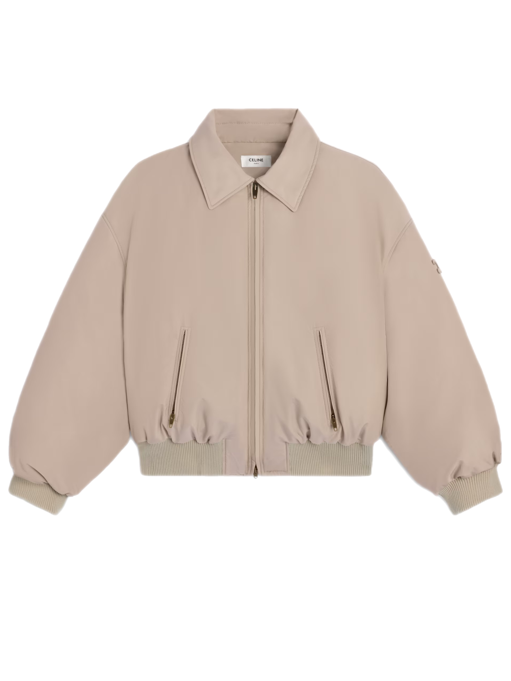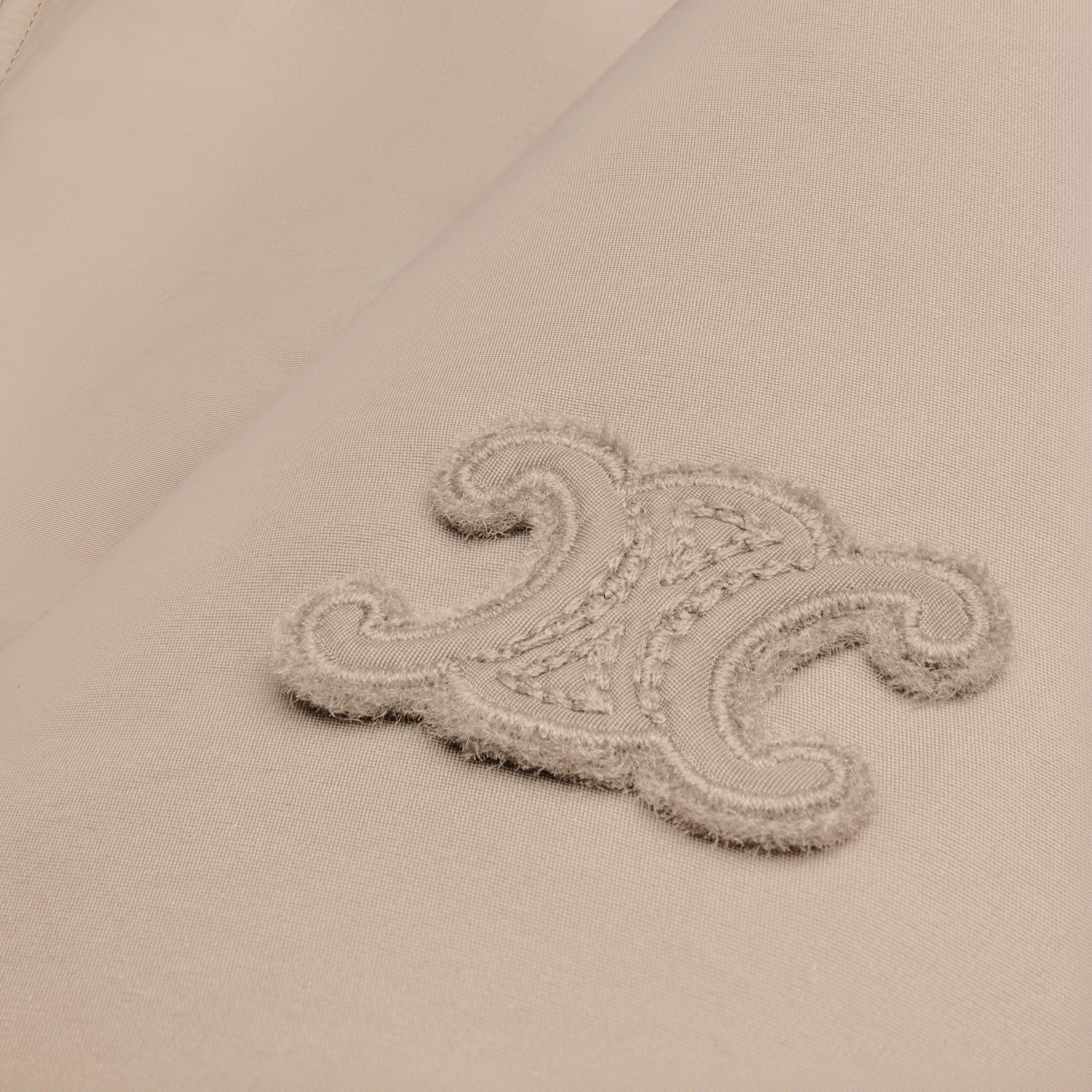 Женская куртка-бомбер Celine из нейлона свободного кроя с нашивкой на рукаве Triomphe. Низ куртки и рукава дополнен ребристой резинкой в тон куртки. Куртка наполнена пухом и пером.