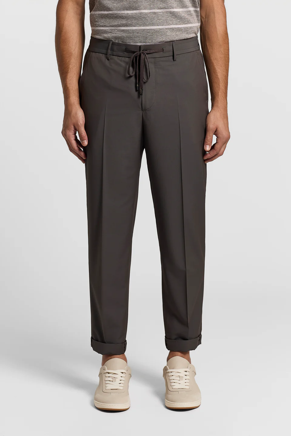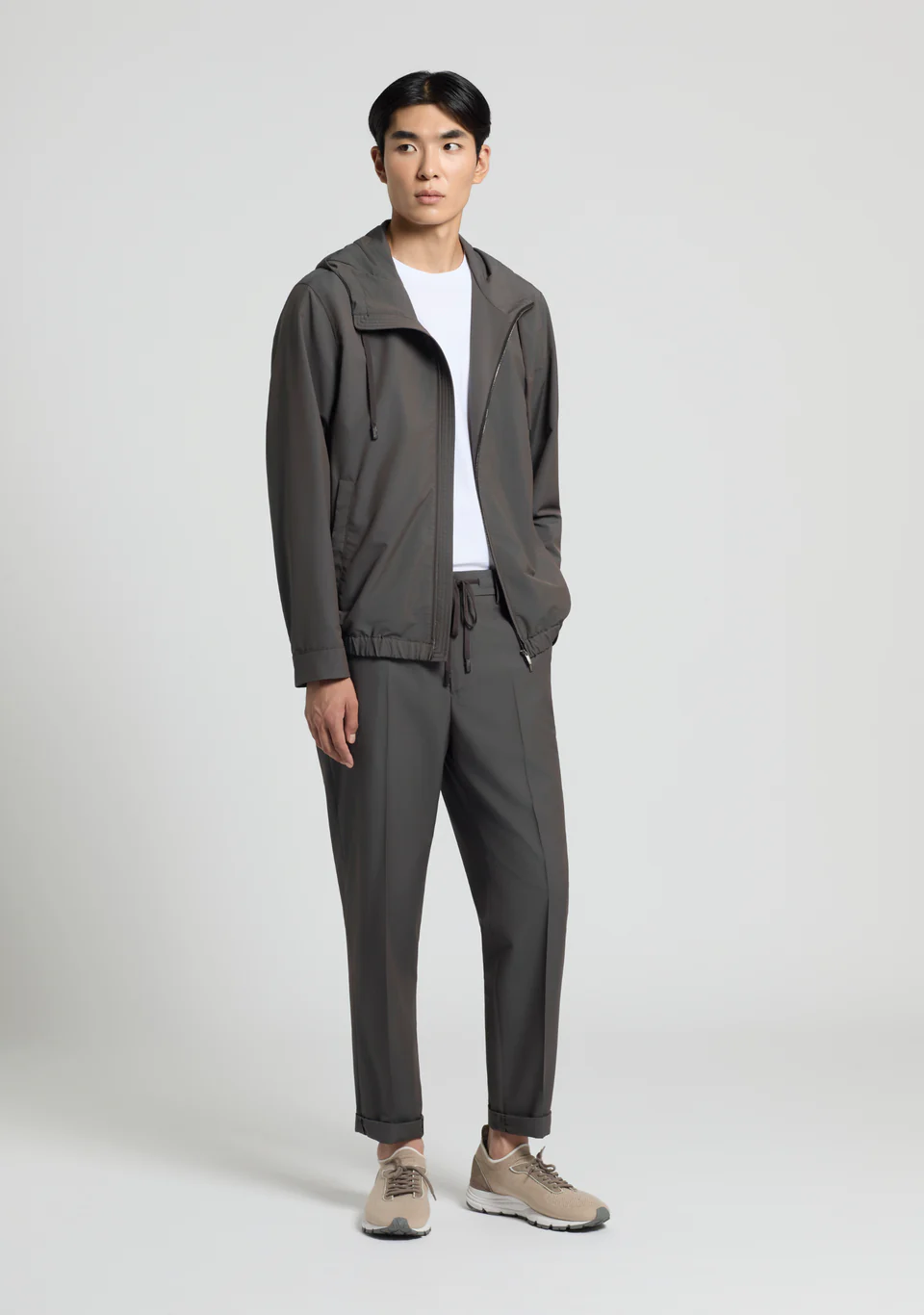 Костюм ,брюки изготовленные из легкого технического шерстяного холста с отделкой Rain System® от Loro Piana, эти брюки-джоггеры сочетают в себе производительность и изысканность. Обычная посадка удобно скользит по фигуре, в то время как передние карманы Америки и двойные нити на спине сочетают в себе практичность и характер пошива.