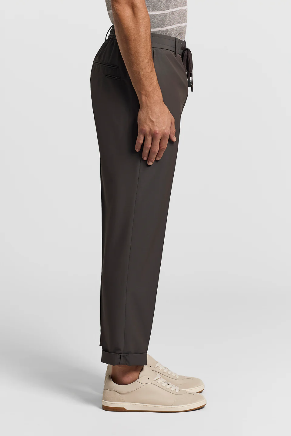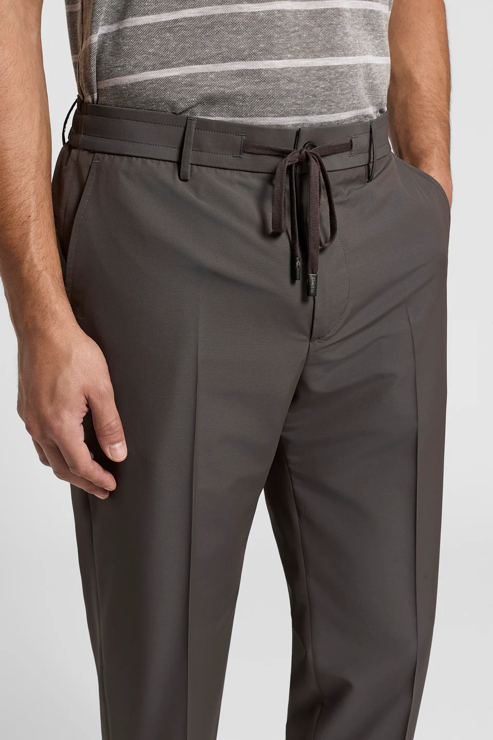 Эластичный пояс с кулиской и застежка-молния и кнопка с логотипом обеспечивают практичность, а задний карман с логотипом представляет новую деталь. Новая культовая особенность Peserico, которая напоминает карман, в который рабочие вставили рабочий счетчик: деталь пошива, переосмысленная в современном ключе. Низ с лацканом завершает линию одежды, идеально подходит для современного и изысканного образа.