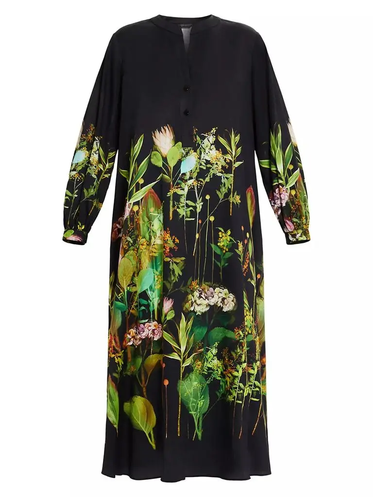 Платье из чистого хлопкового атласа с цветочным принтом, с дизайном, разработанным специально для модели. Корейский воротник с V-образным открытием, длинные рукава с манжетой, карманы на бедрах. С слегка расклешенной линией, он идеально подходит в любых обстоятельствах с высокими каблуками, сандалиями-платформерами или кроссовками. Платье является частью основной коллекции Марины Ринальди.