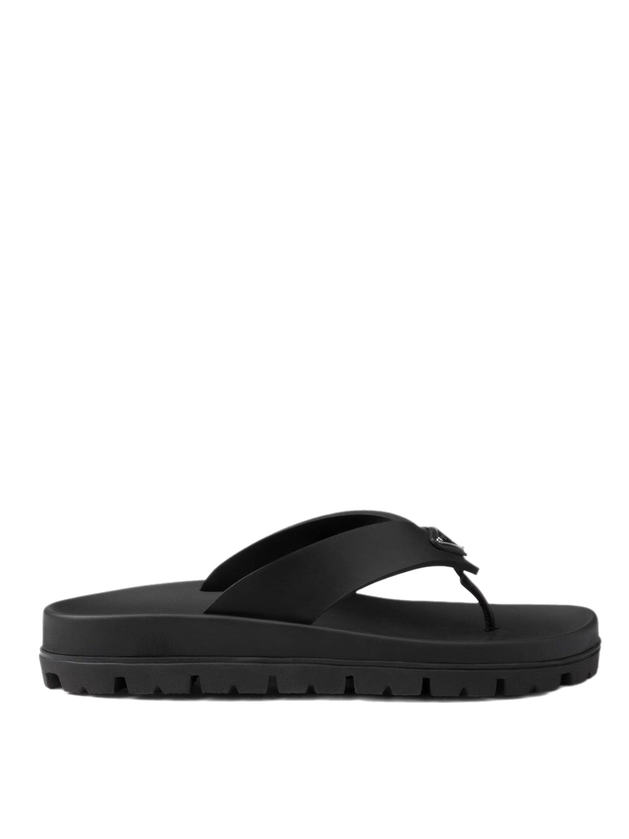Эти резиновые сандалии имеют современный силуэт с гладкими деталями. Стиль, обогащенный культовым эмалированным логотипом металлического треугольника, характеризуется резиновой подошвой с протектором, который добавляет спортивный штрих.