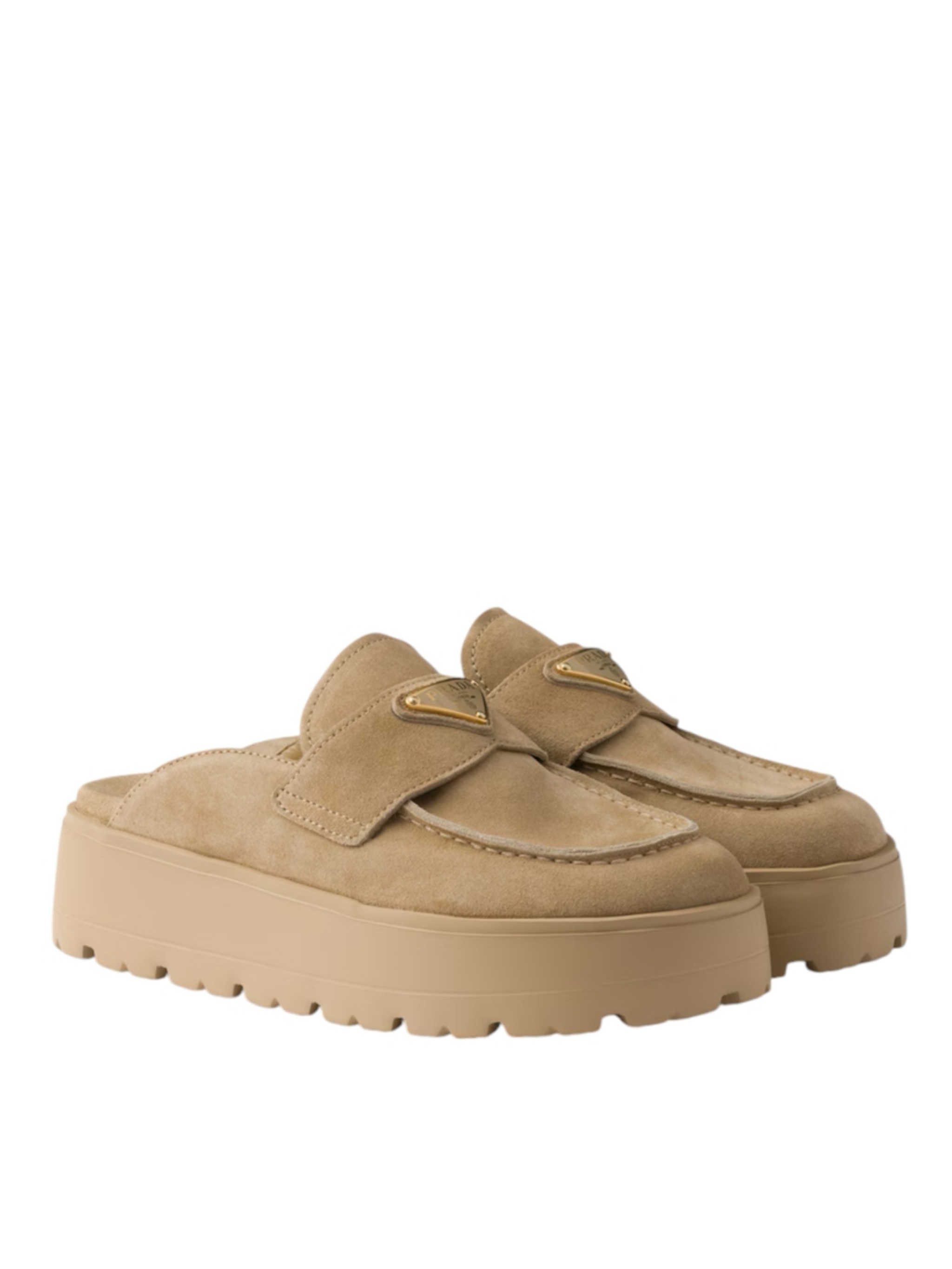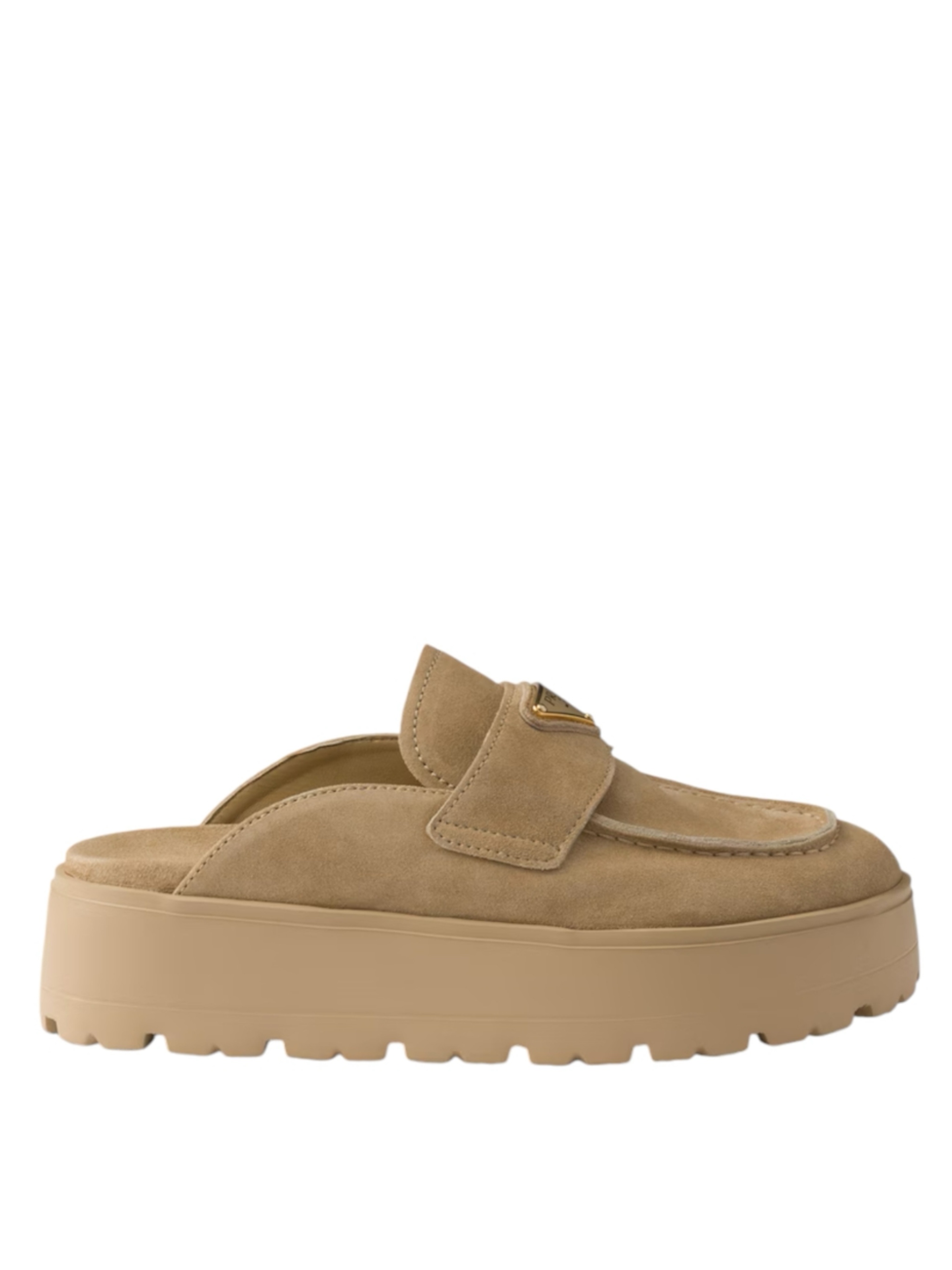 Мюли от Prada, выполненные из роскошной телячьей замши, представляют собой современную интерпретацию классической обуви. Дизайн украшен культовым треугольным логотипом — сдержанным, но безошибочно узнаваемым знаком отличия. Удобный фасон без застежки с открытой пяткой обеспечивает легкость в использовании, а закругленный носок создает мягкий и гармоничный силуэт. Модель на современной платформе сочетает в себе изысканную эстетику и непринужденный, возвышенный стиль. Внутренняя отделка из мягкой телячьей кожи гарантирует исключительный комфорт в течение всего дня, делая их универсальным дополнением к любому гардеробу.