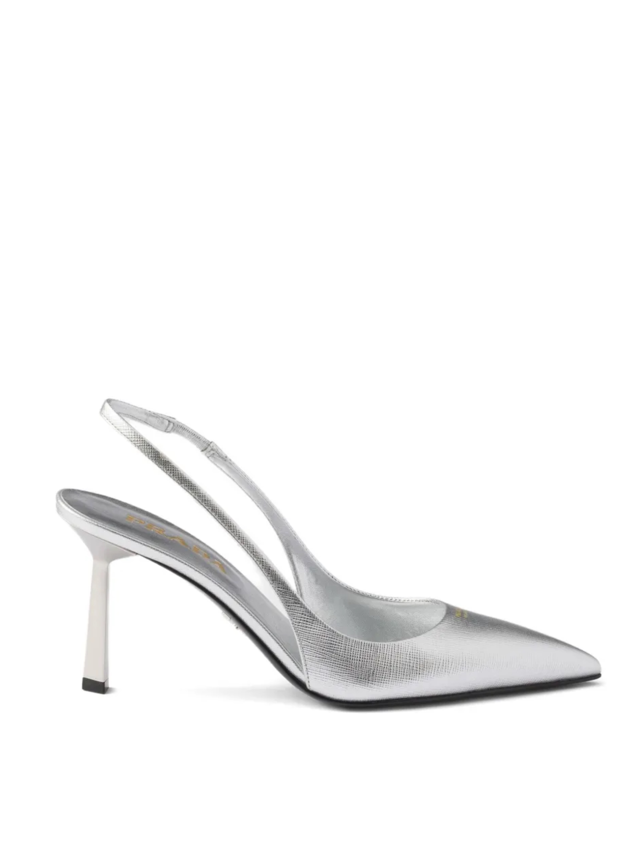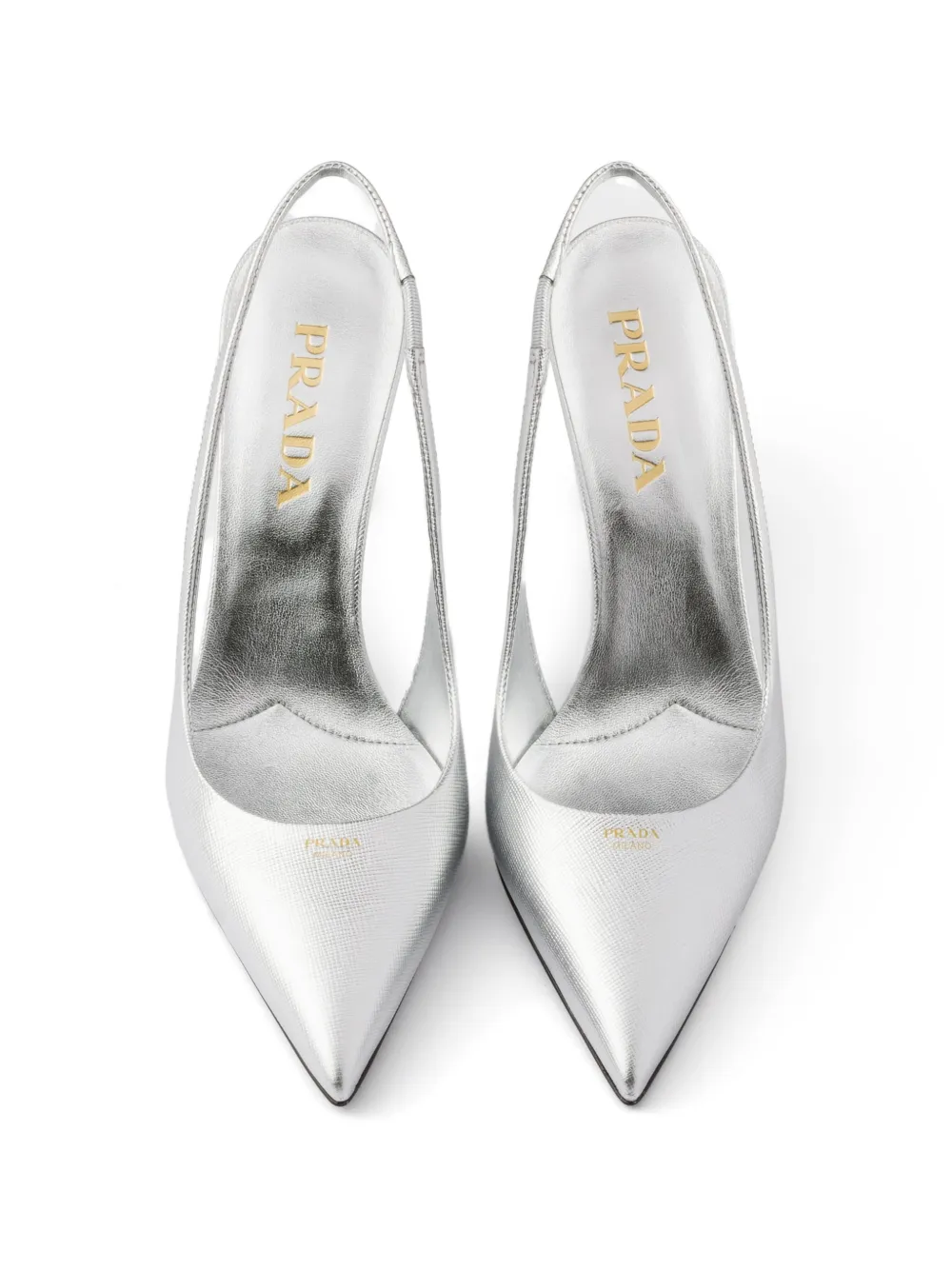 Туфли-слингбэки Prada из принтованной кожи серебристого цвета. Эта модель отличается характерным принтом, открытой пяткой, зауженным носком и каблуком