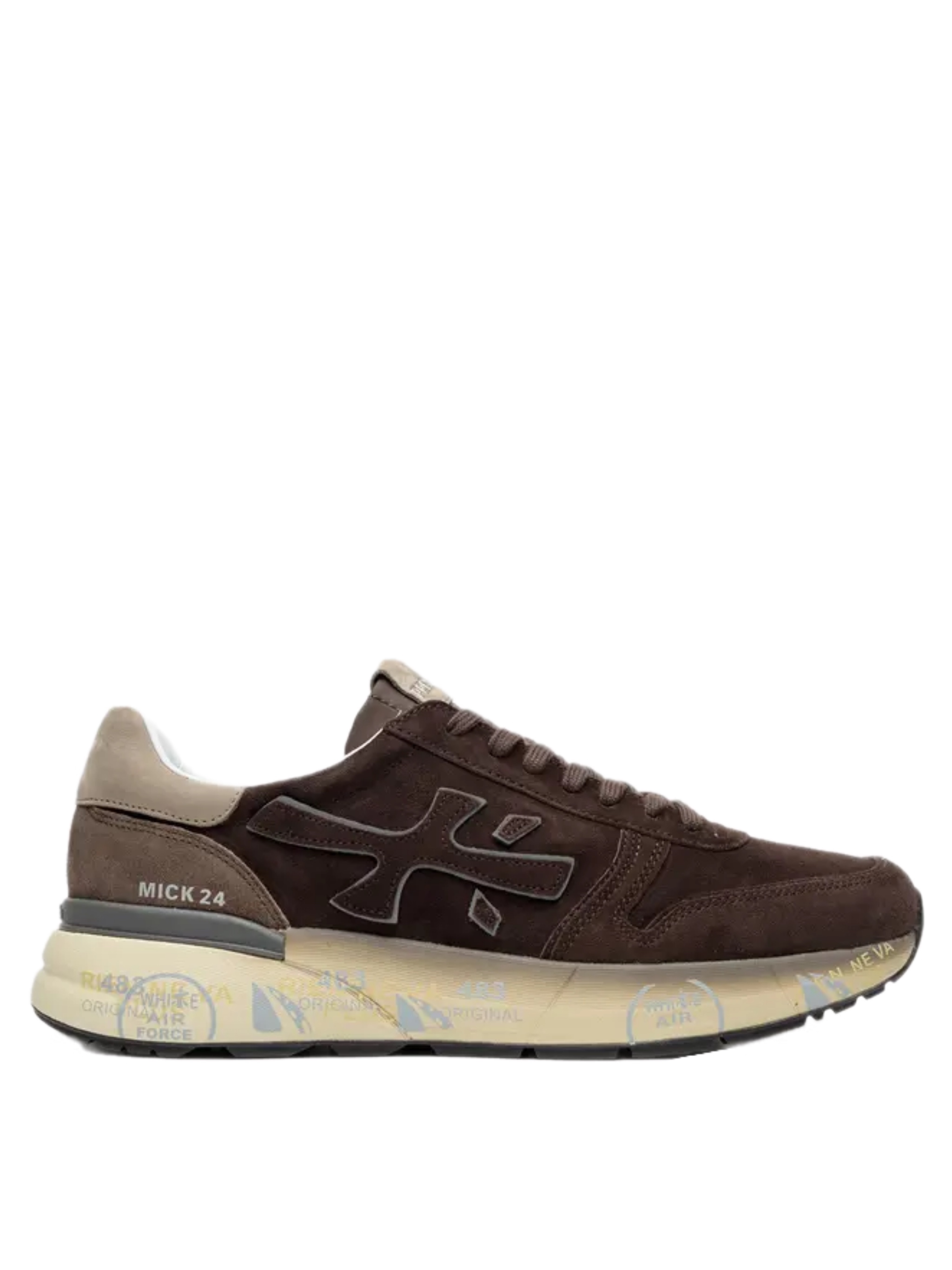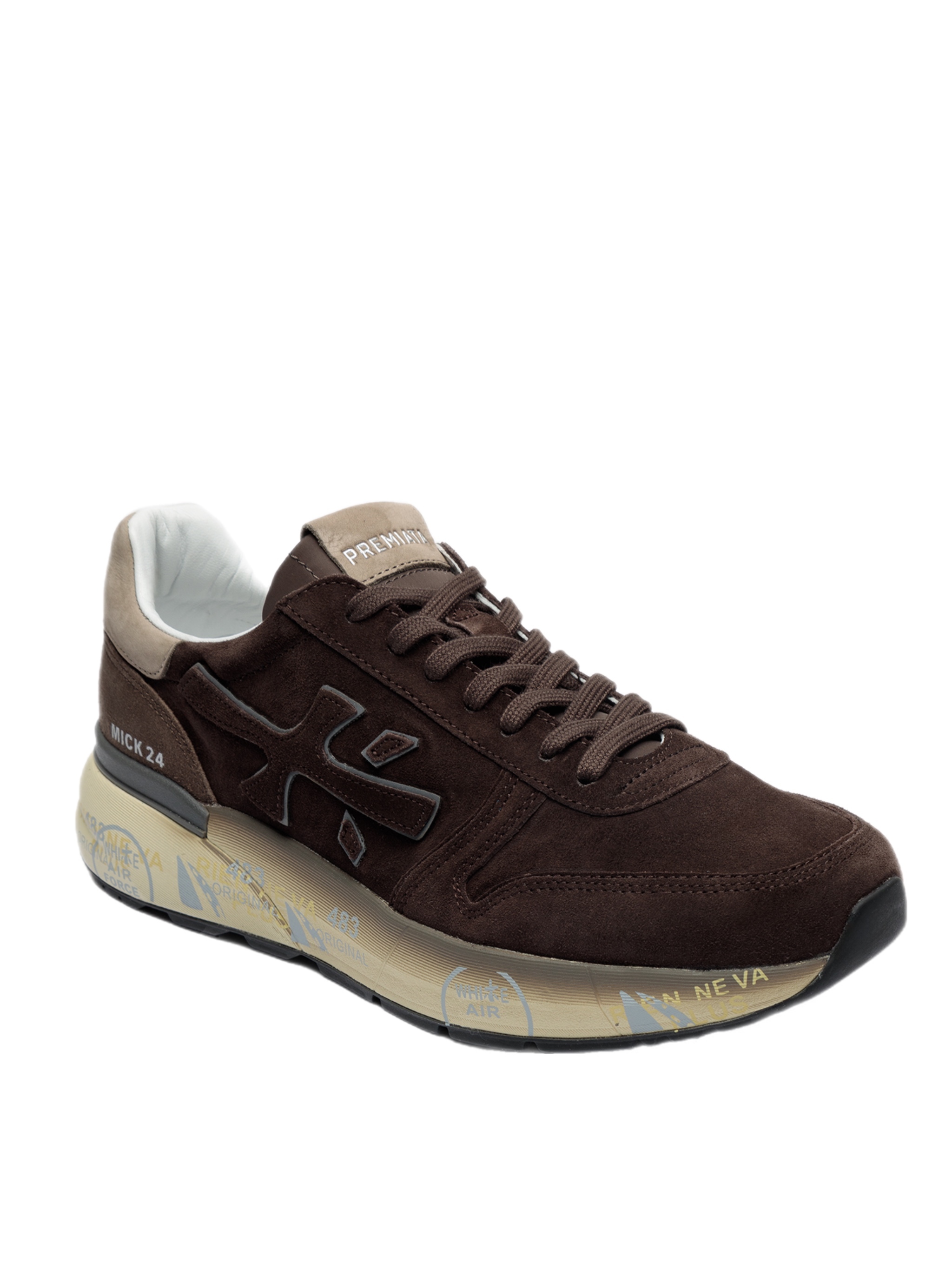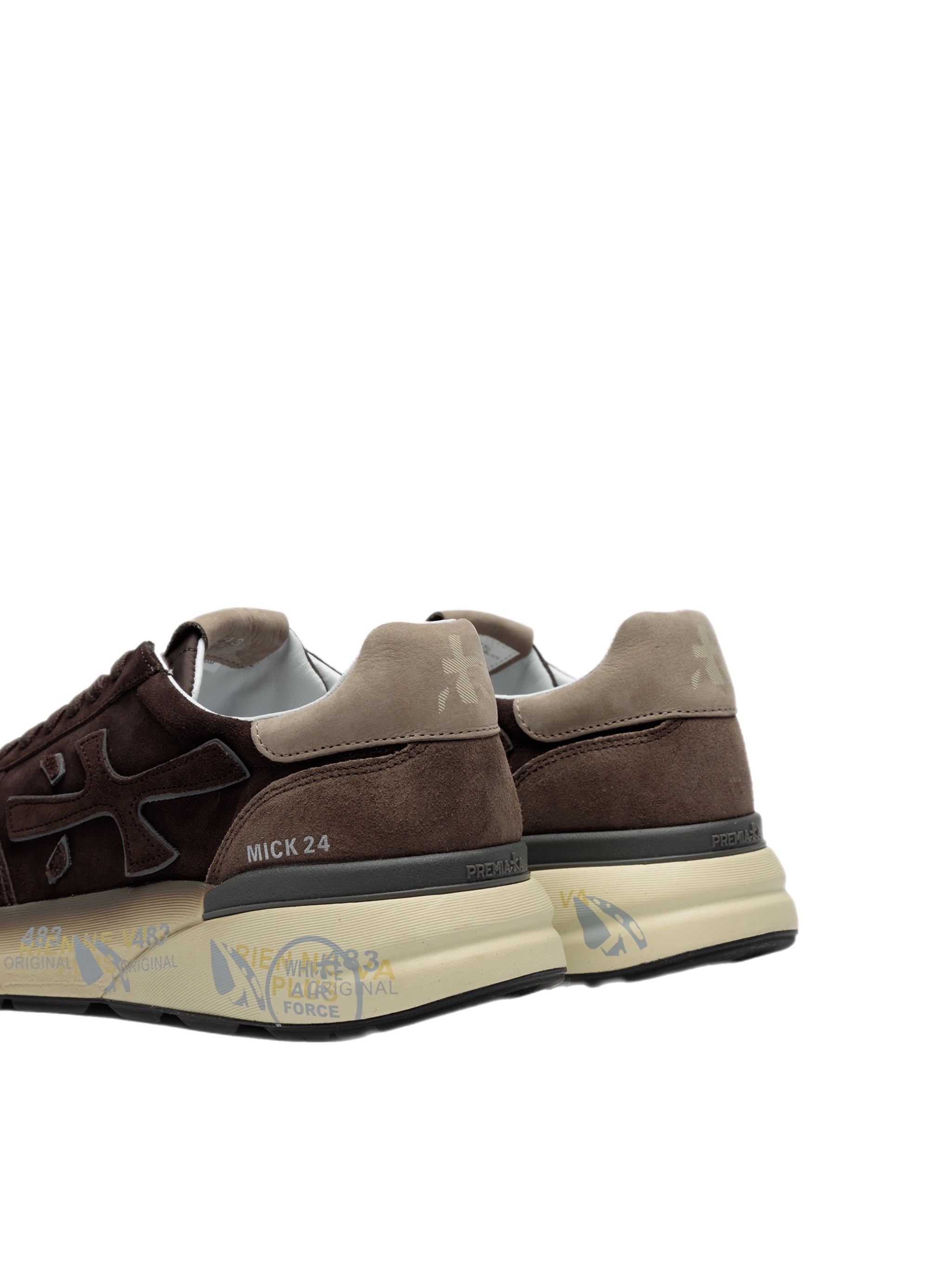Тёмно-коричневые кроссовки MICK из натуральной бархатистой замши. Мягкий задник, плоская шнуровка, по бокам фирменная аппликация. Градиентная подошва с гибкой вставкой, защитой мыска и принтом в виде печатей, на язычке нашивка с названием бренда
